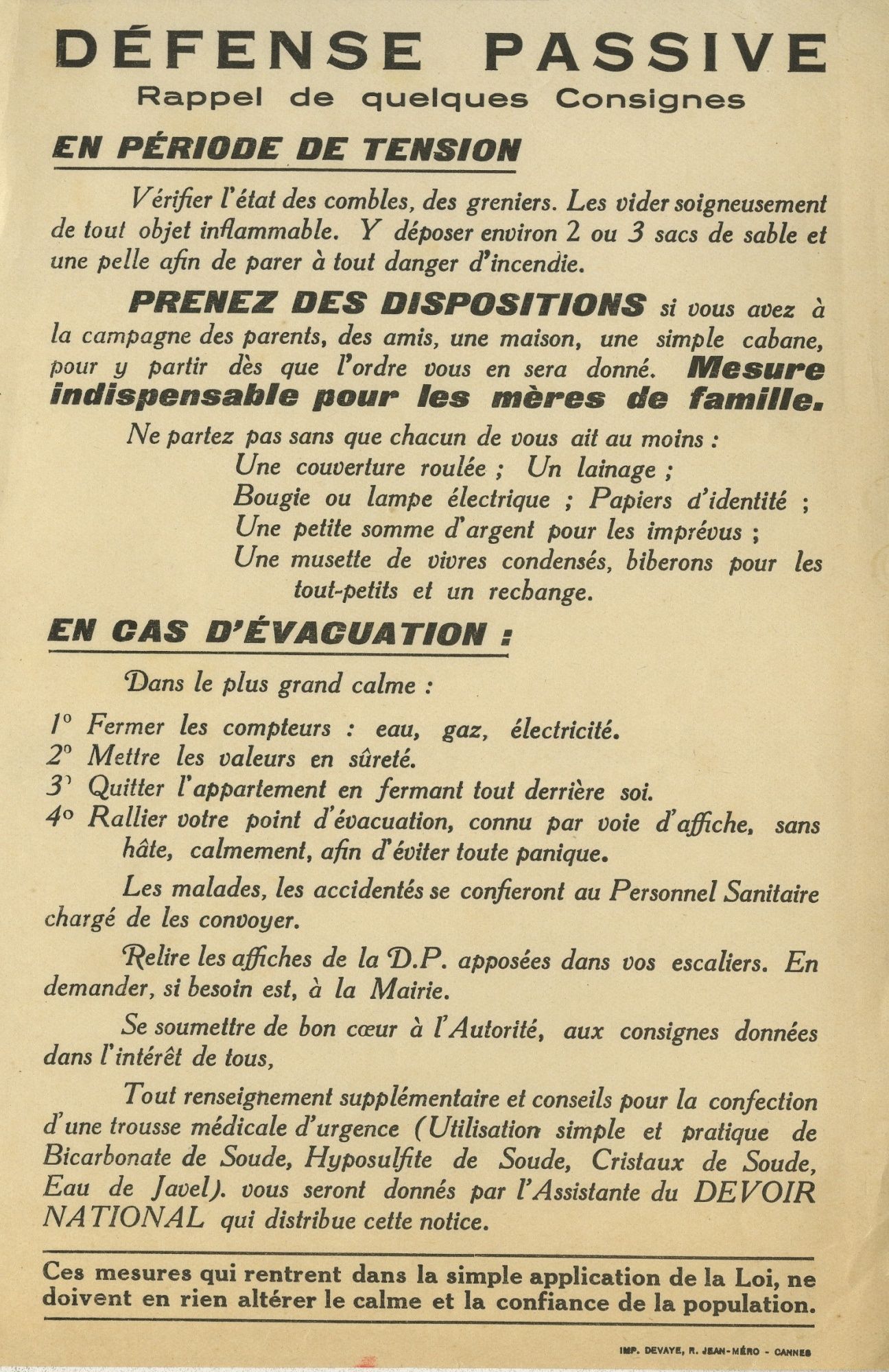 La Défense Passive : organisme public, son but est de protéger la population civile contre les agressions. Sont mises en place des consignes de sécurité, une aide et assistance aux blessés, des creusements de tranchées… Les agents de la "DP", souvent bénévoles, sont chargés de faire respecter les consignes.