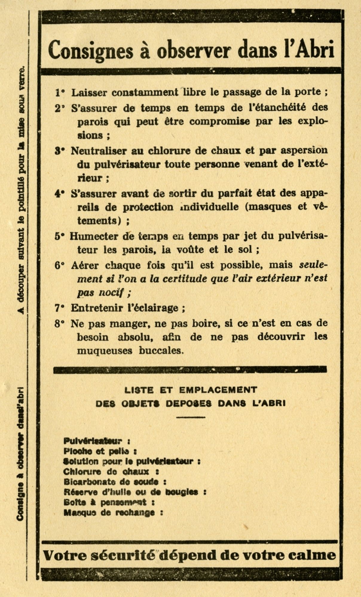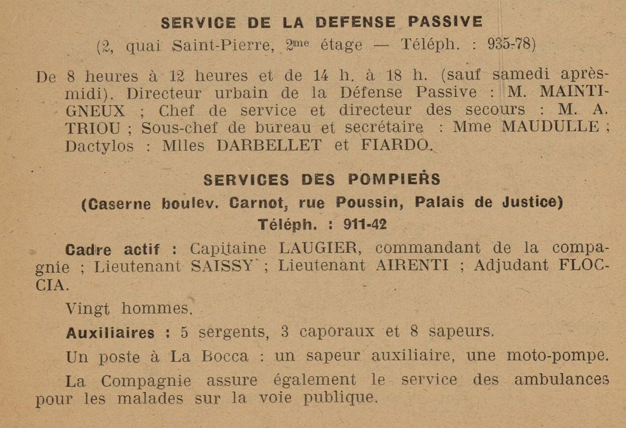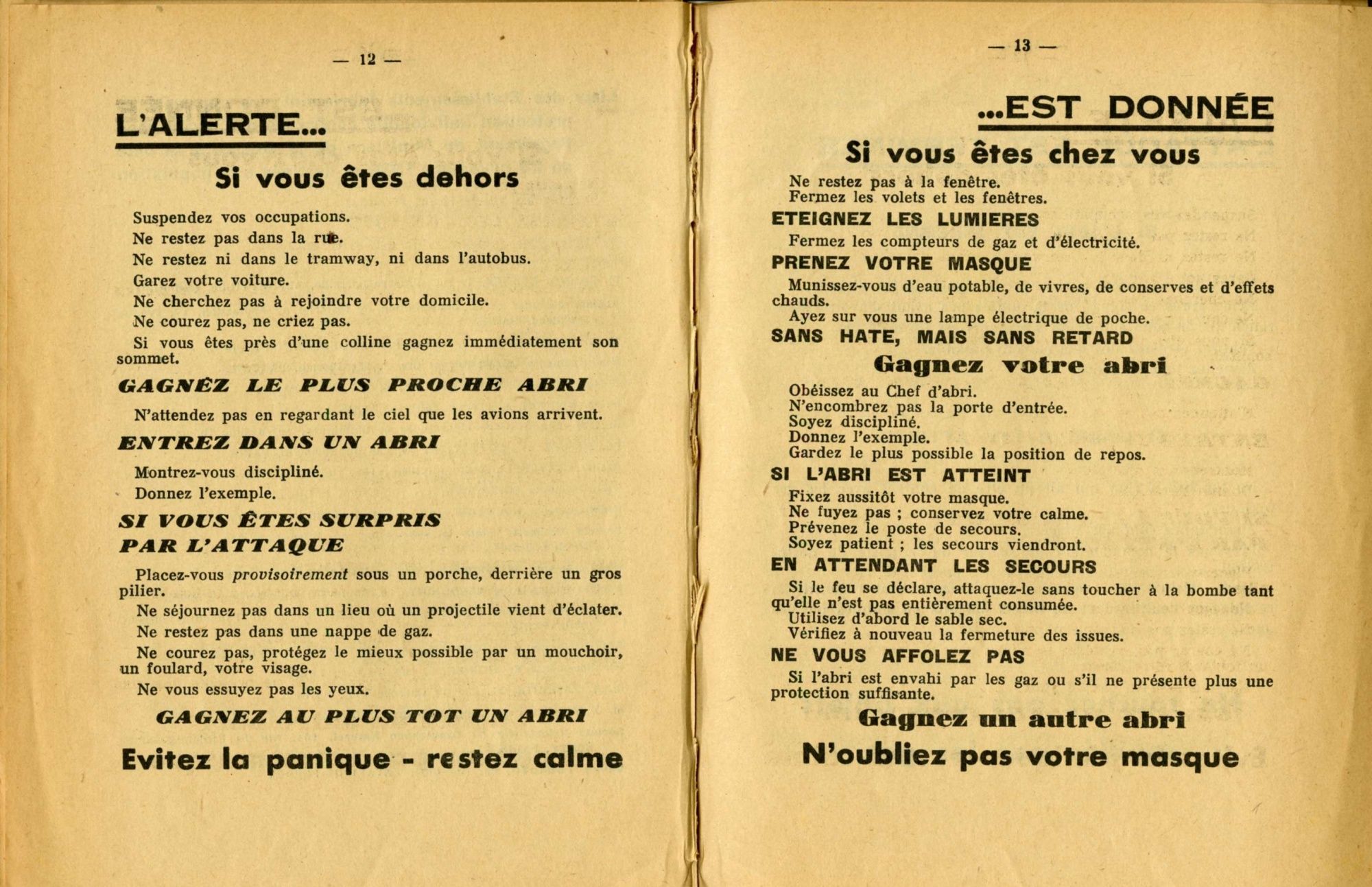 Chaque commune est divisée en plusieurs secteurs ou « îlots » reliés à un siège central, en relation avec la Mairie. Au sous-sol du Palais de justice, se trouve le siège de la défense passive. La distribution de masques à gaz débute en septembre 1939 : la crainte du gaz est permanente.