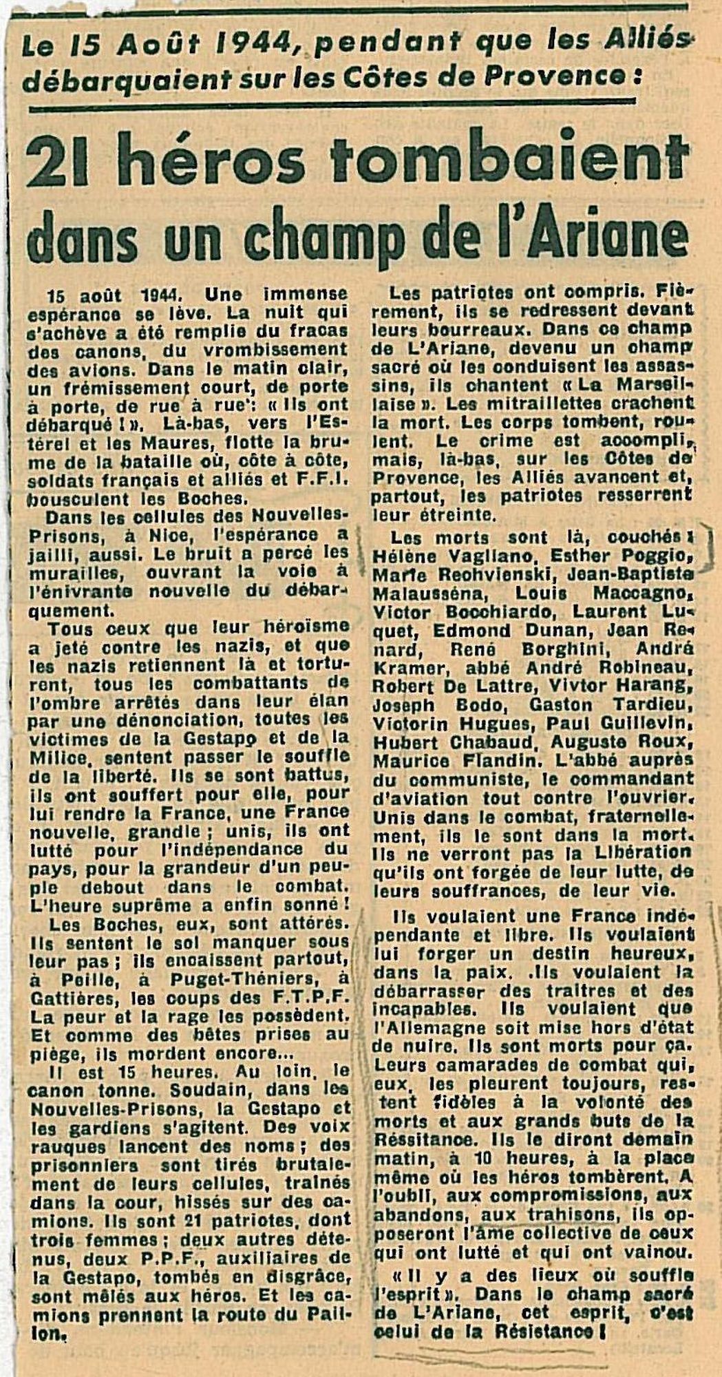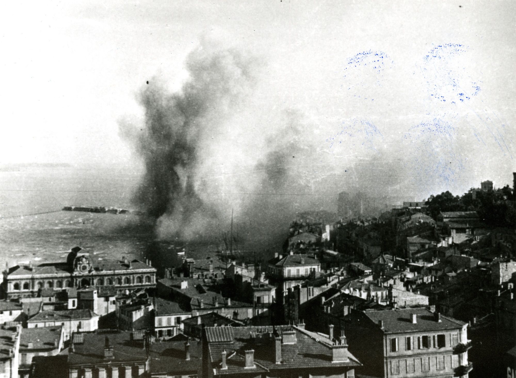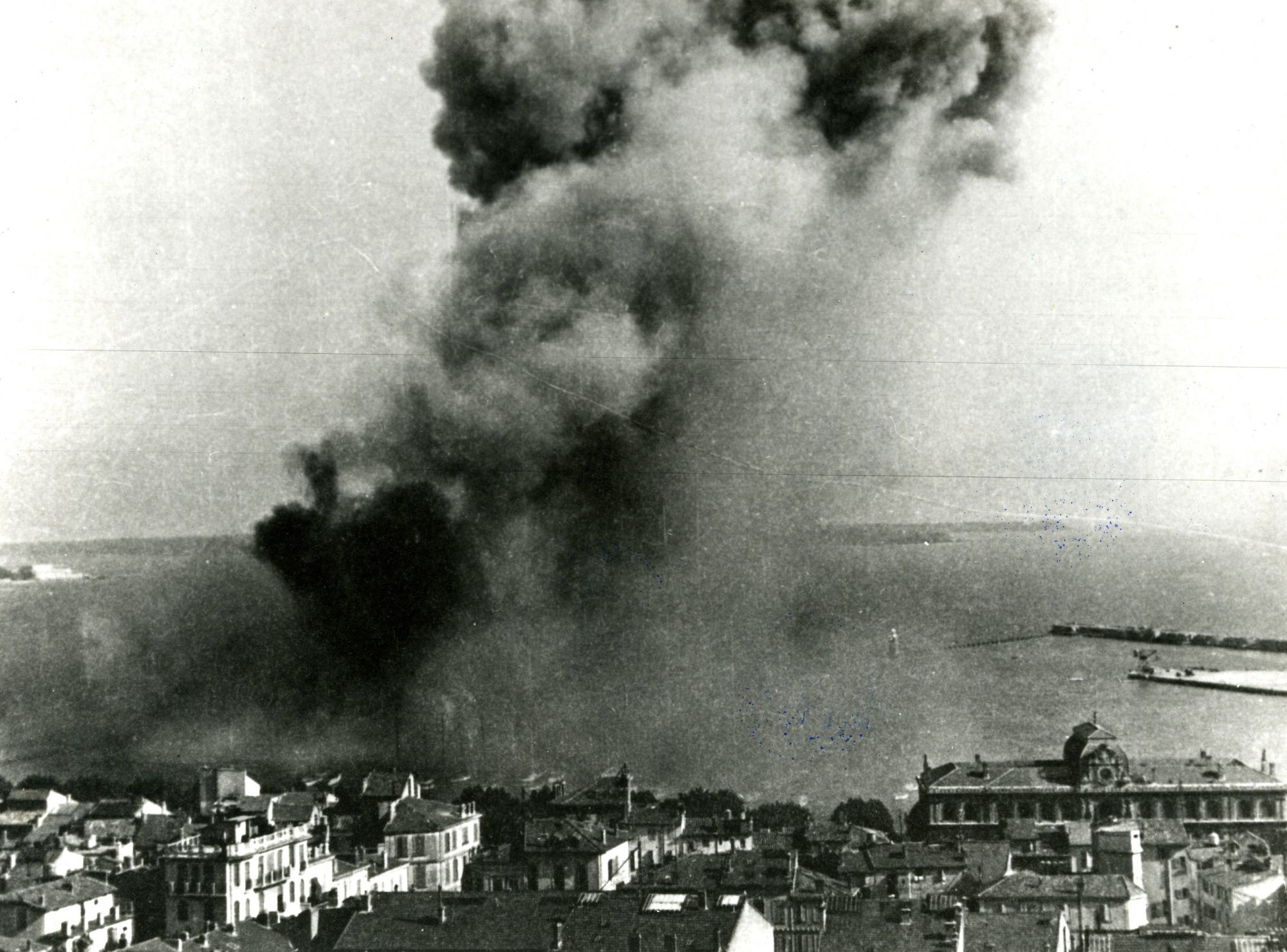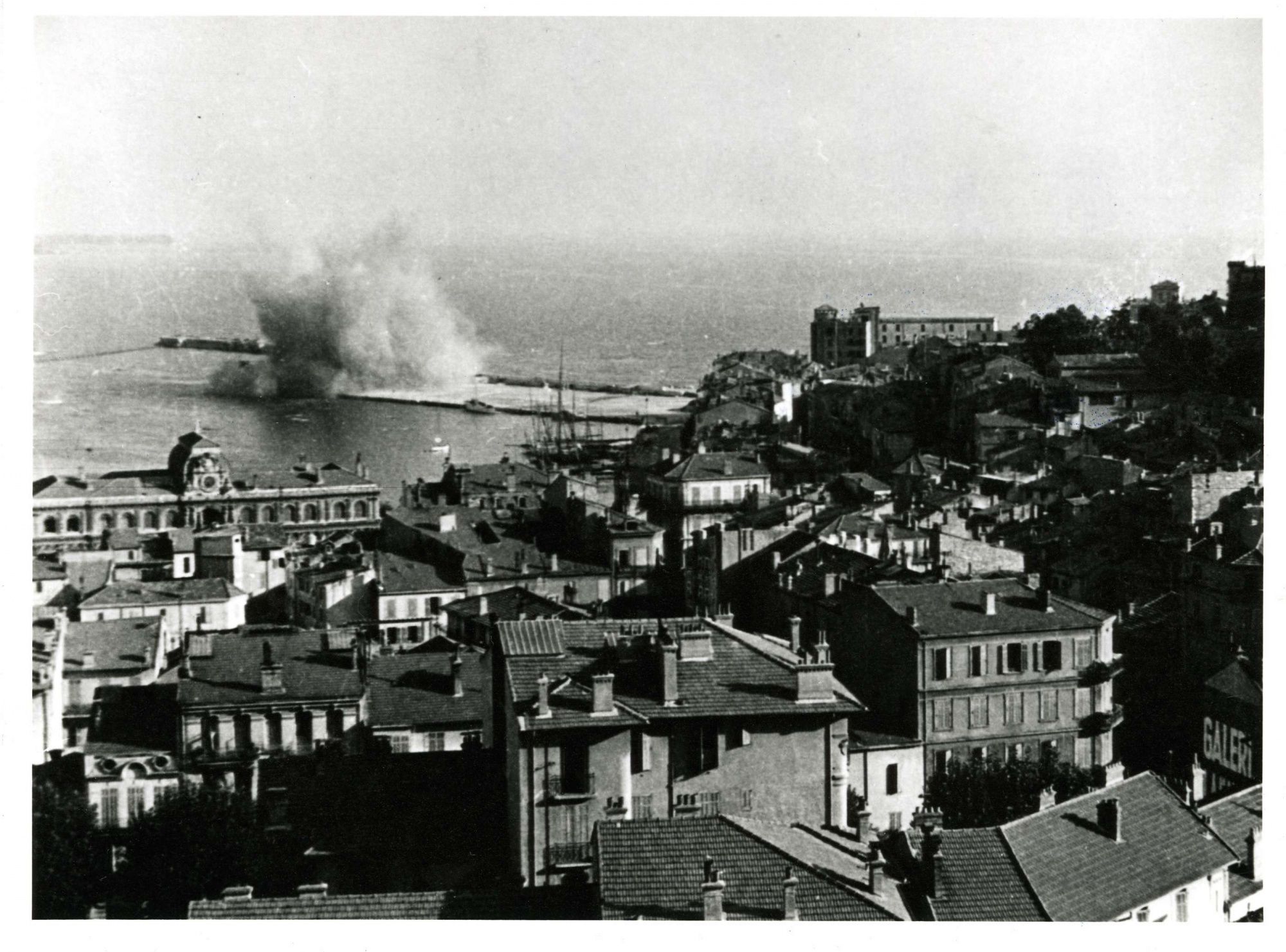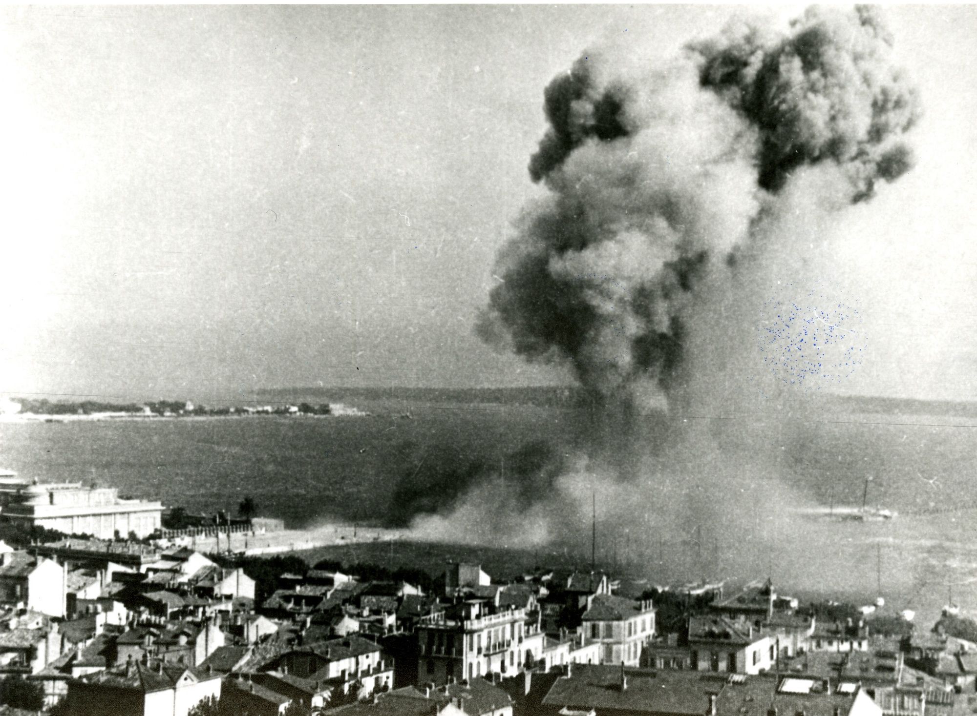 - 15 août 1944 : c'est le débarquement en Provence ; les Allemands, à 16h30, font sauter une vingtaine de mines au vieux port. Ils ne font pas sauter le phare car ils en ont besoin, mais la jetée Albert-Edouard et la place Massuque sont sérieusement endommagées. Chaque jour, alertes et bombardements ont lieu, sur la Croix-des-Gardes, la Croisette, le vieux port et les usines de la Bocca. Quand, à Nice, les Allemands fusillent 21 résistants incarcérés, en représailles au débarquement, a lieu à Cannes le massacre d’autres prisonniers de la Gestapo, à la villa Montfleury.