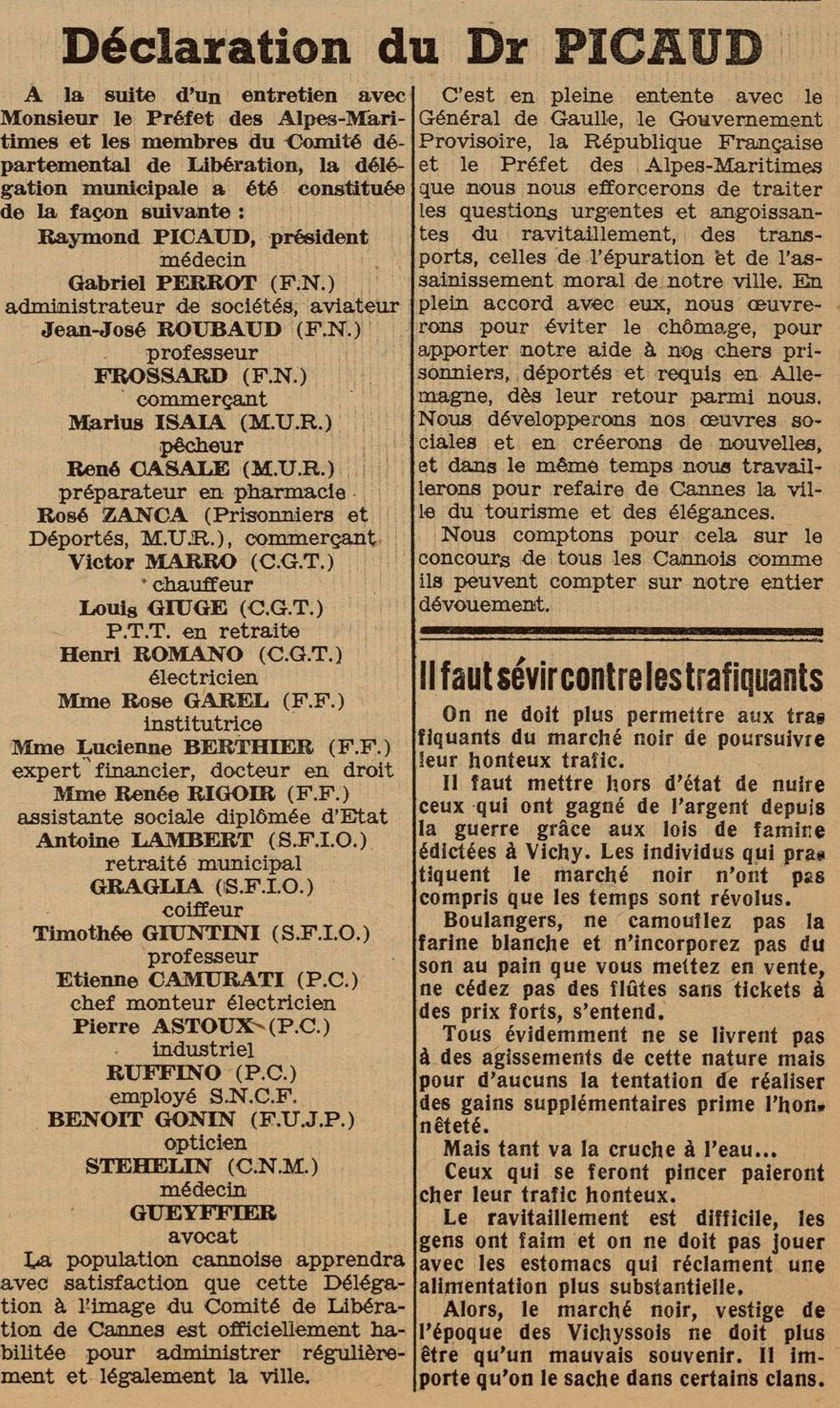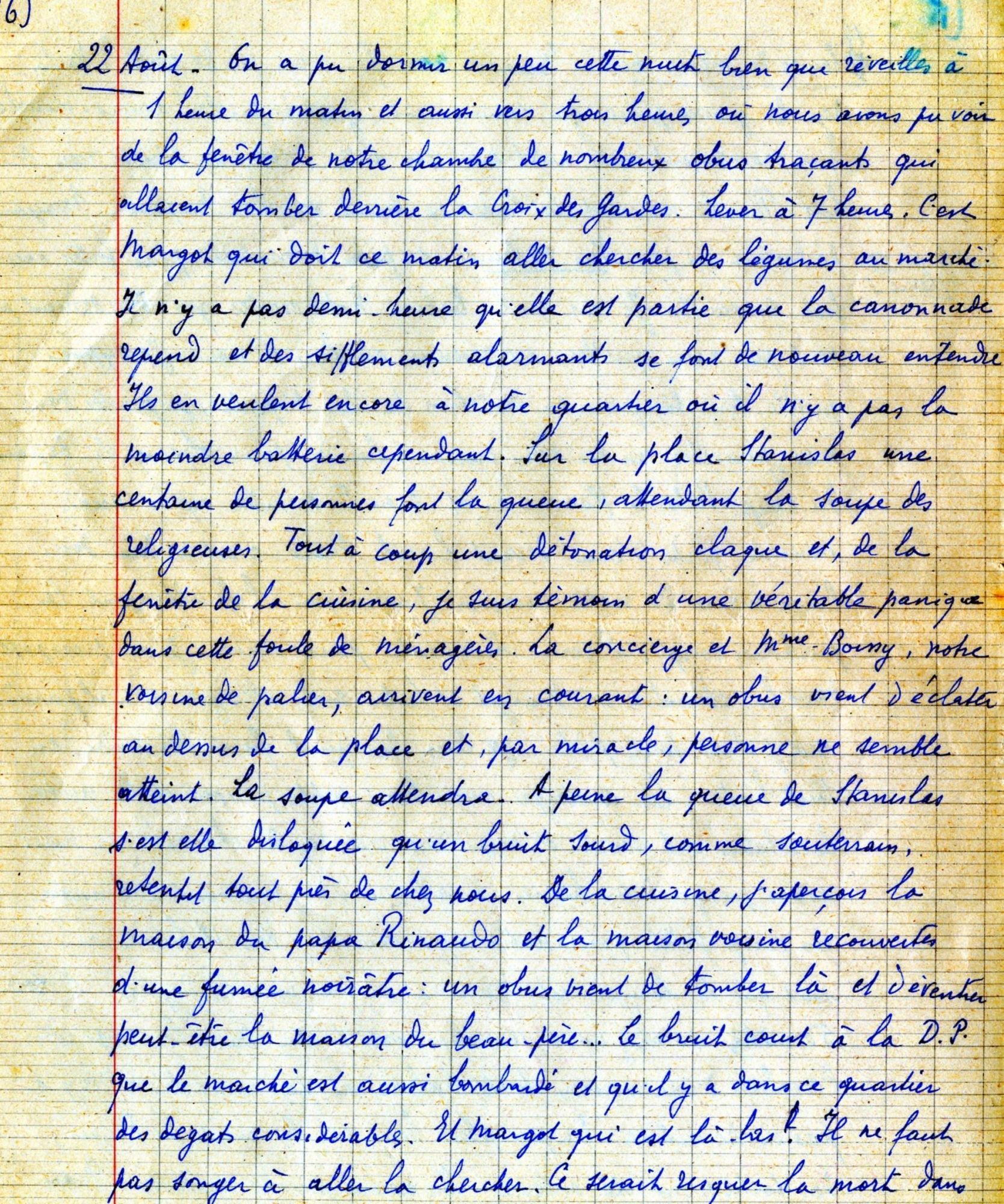 - 18 août 1944 : toute circulation est interdite ; la population rase les murs pour tenter de se ravitailler. Les navires de guerre des Alliés sont au large : la Croisette et le Palm Beach ainsi que la villa Corne d’Or (Croisette) sont endommagés, les obus pleuvent un peu au hasard sur la ville.