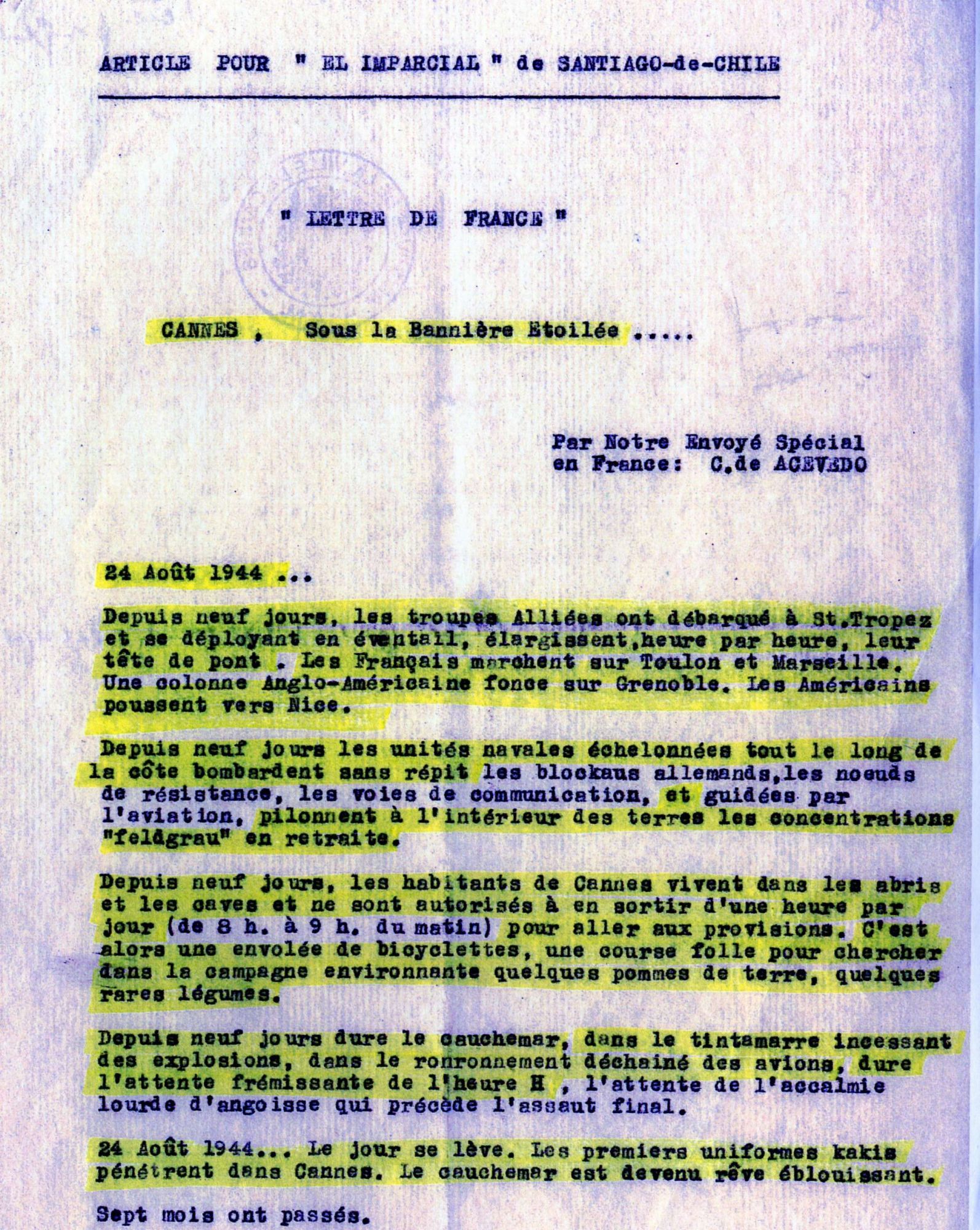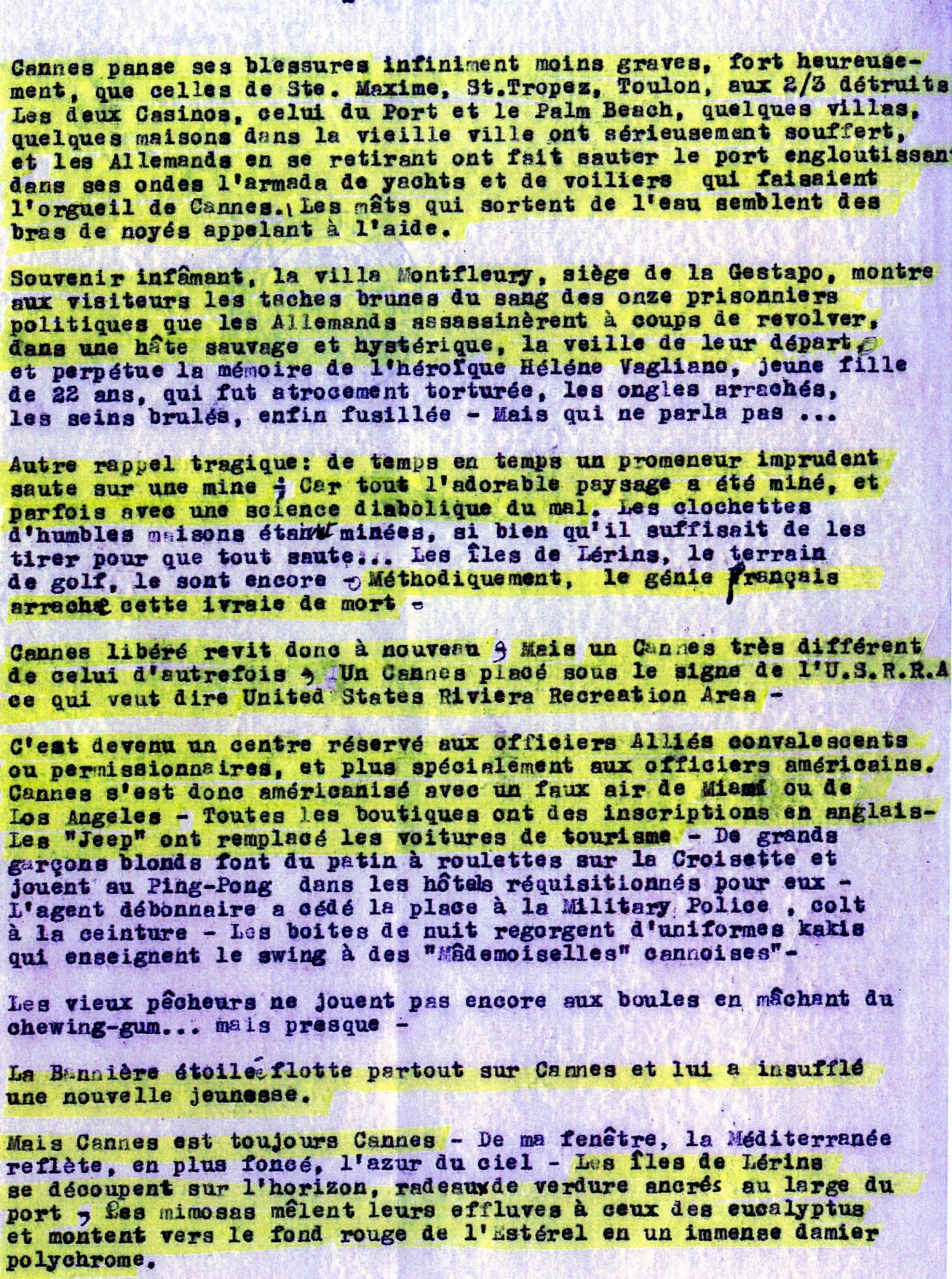 Son : texte lu par une comédienne de l'Eracm, article du journaliste chilien C. de Acevedo, qui écrit pour un journal de Santiago-de-Chile, El Imparcial et qui décrit l'état de Cannes, sous la bannière étoilée, le 24 août 1944. Ce texte est proposé dans les images : 47 et 48.