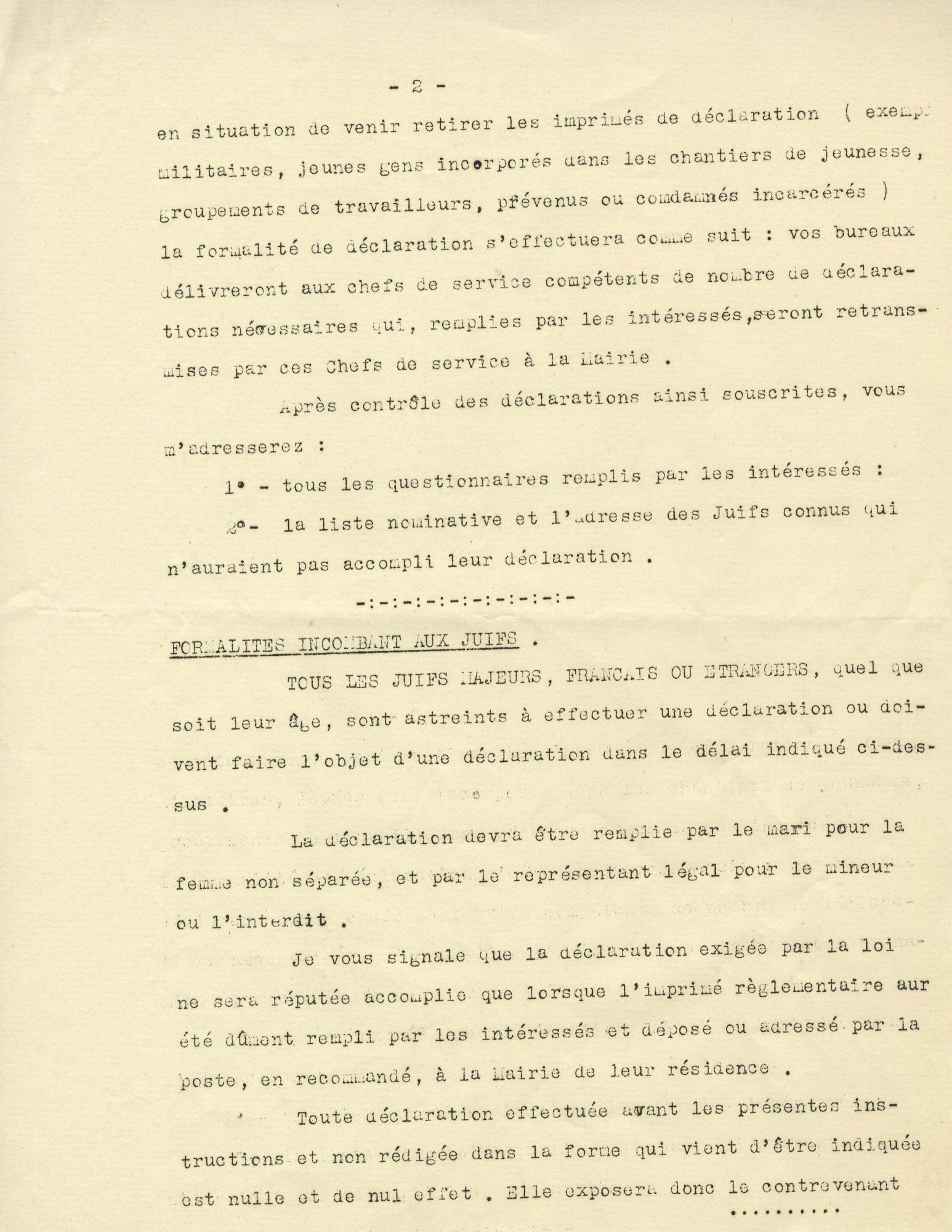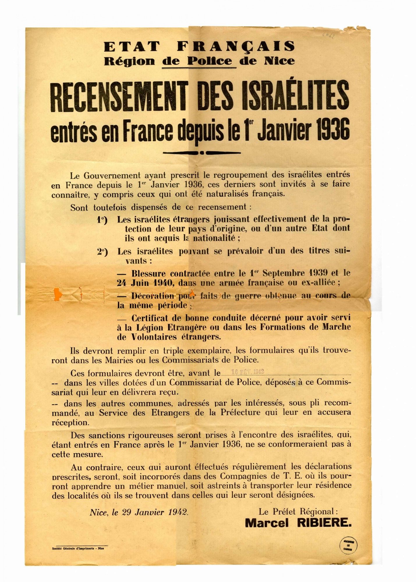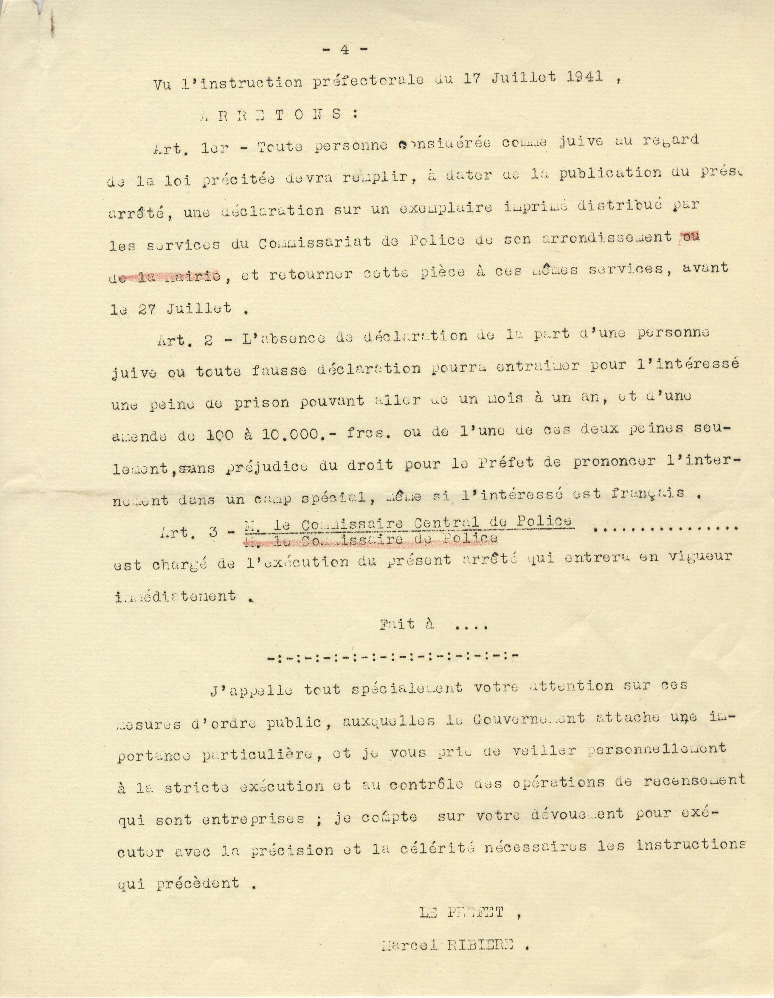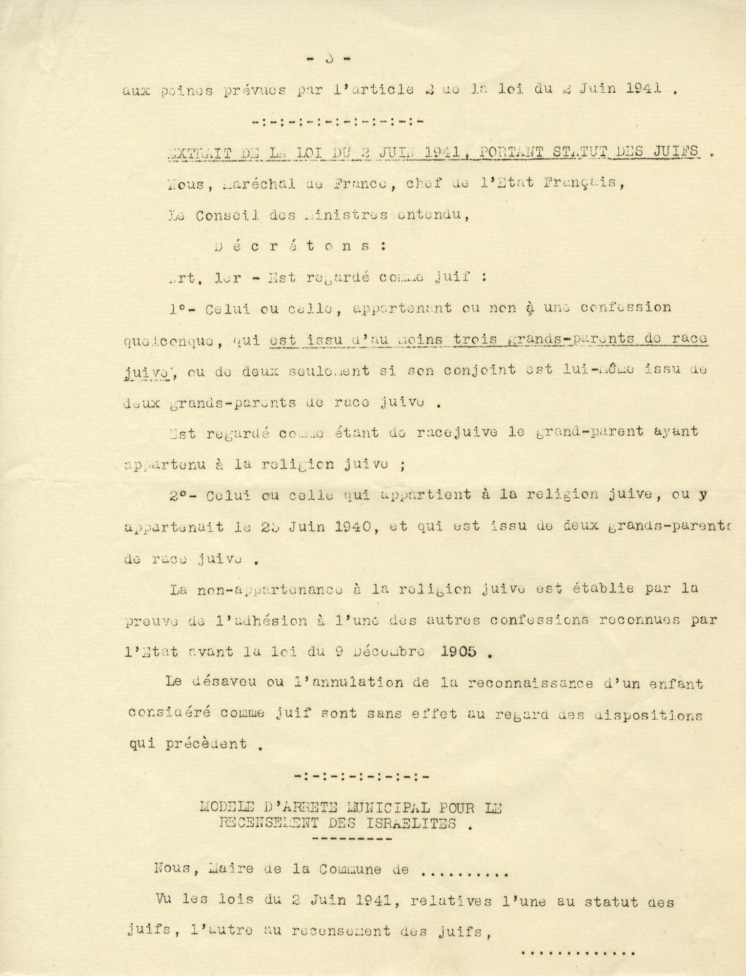 - 2 juin 1941 : texte qui ordonne un recensement sur l’ensemble du territoire des juifs ; déclaration du changement de résidence.
