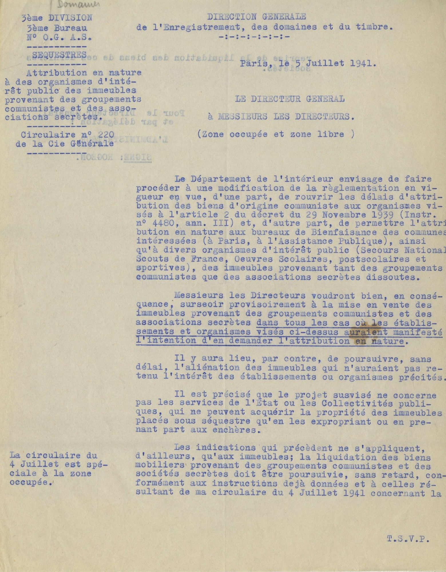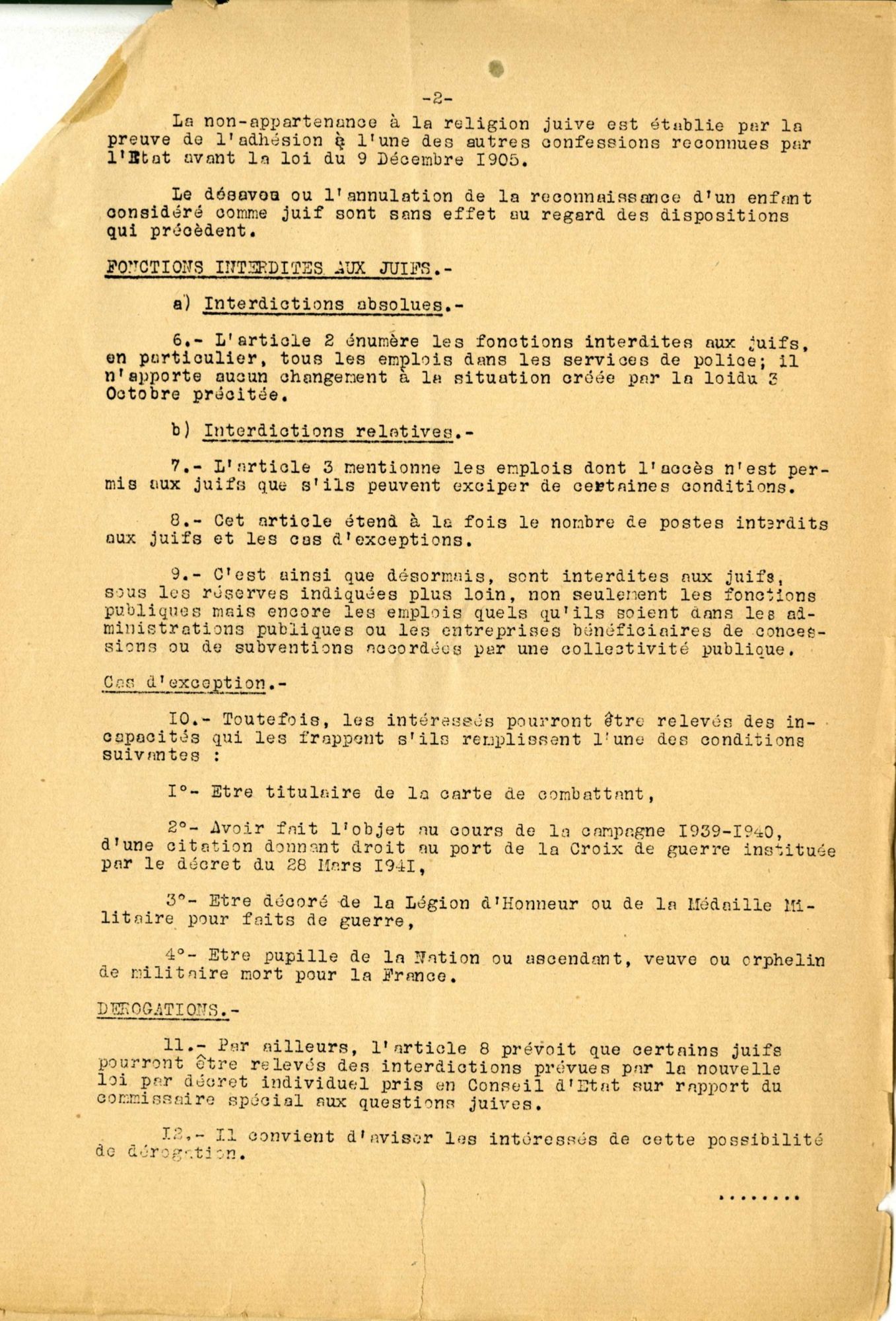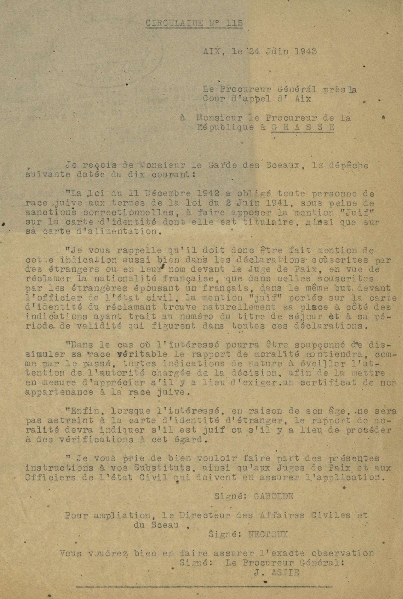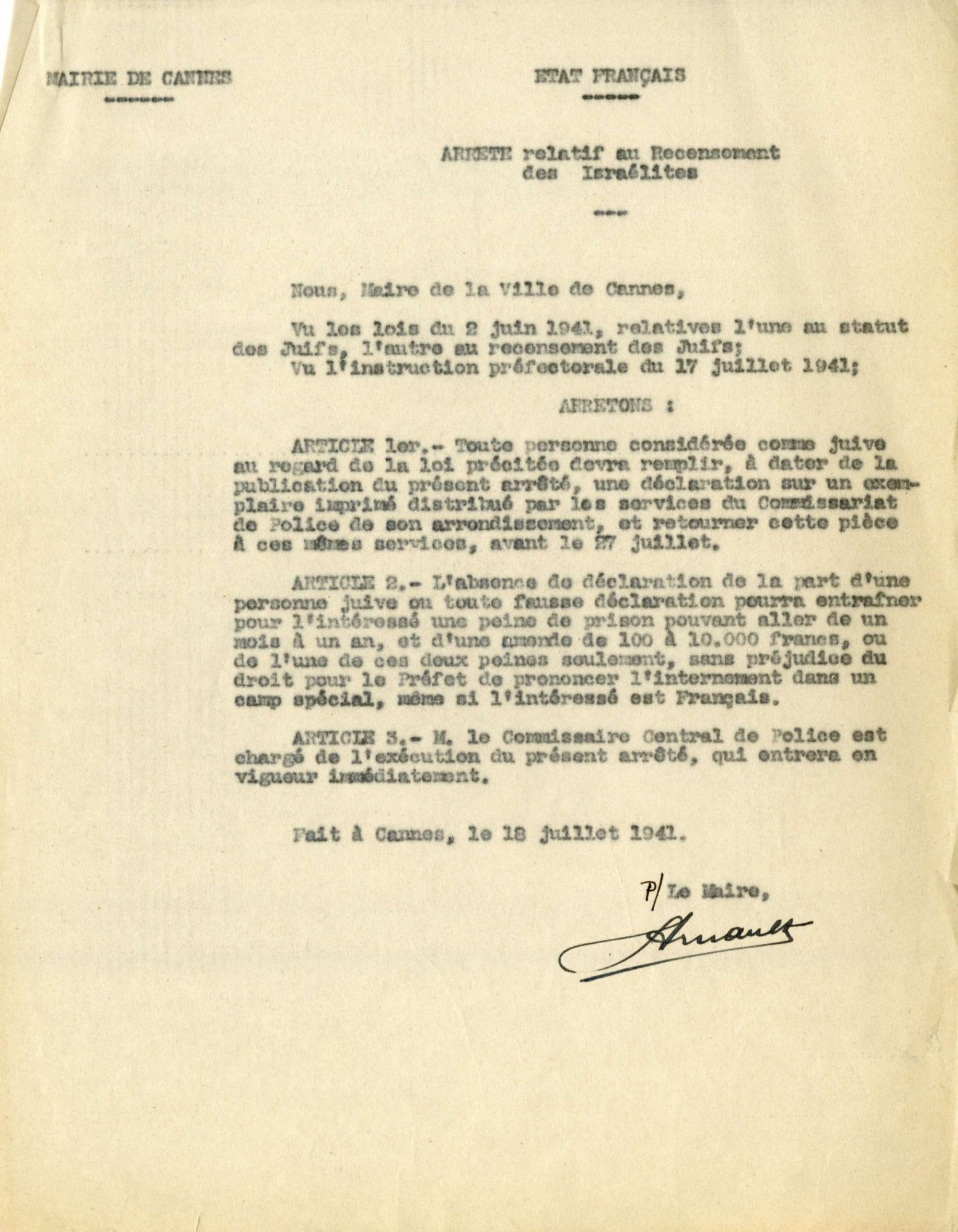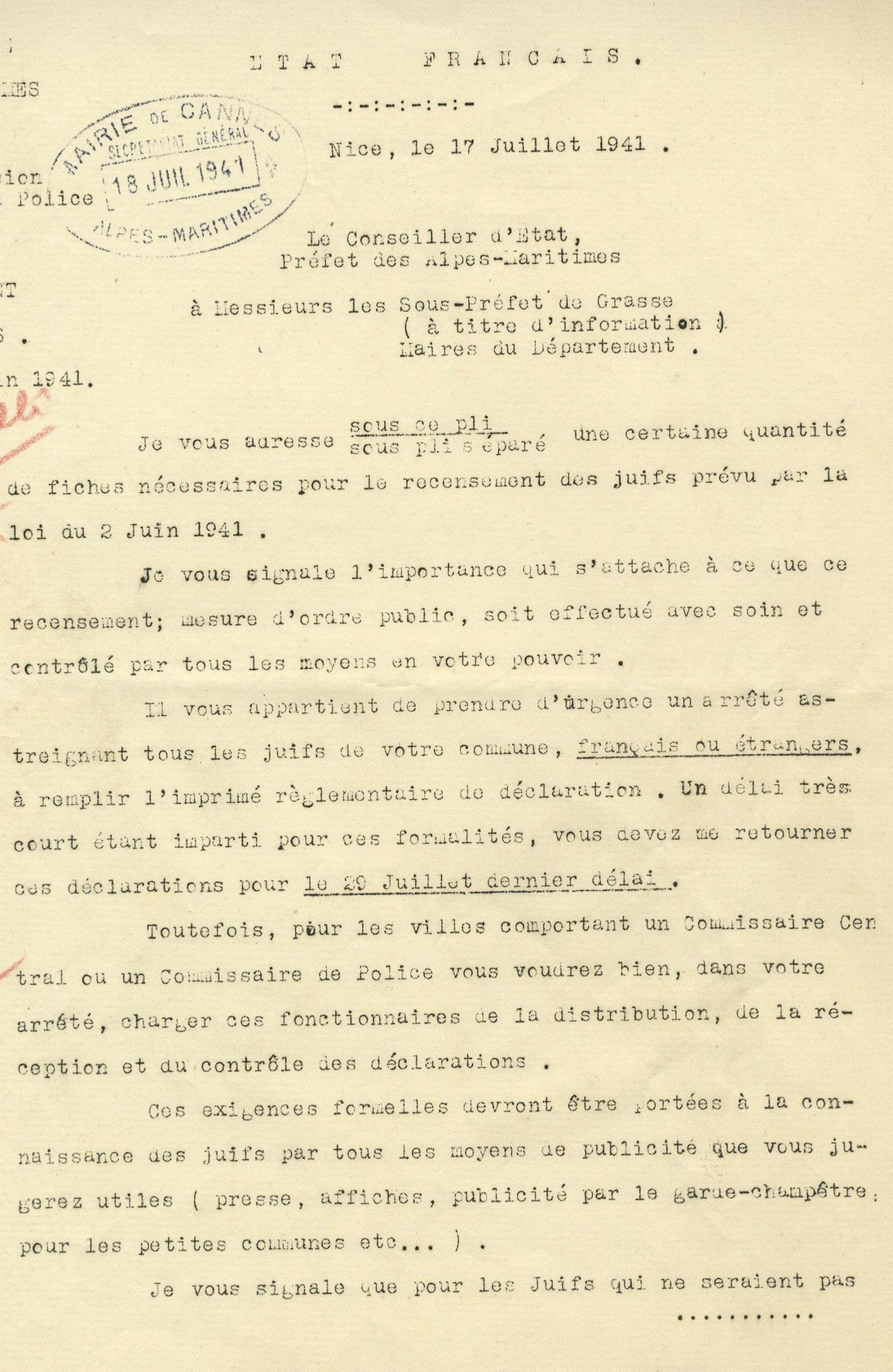 - 2 juin 1941 : texte qui ordonne un recensement sur l’ensemble du territoire des juifs ; déclaration du changement de résidence.