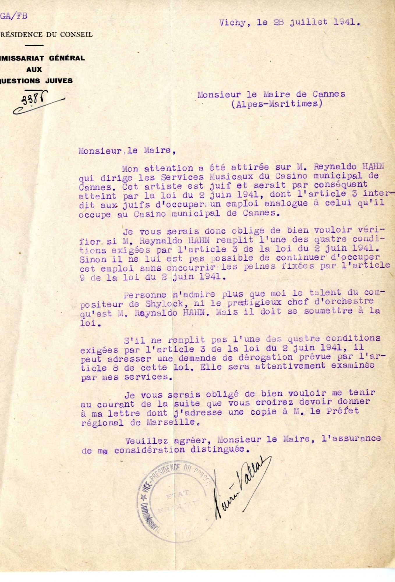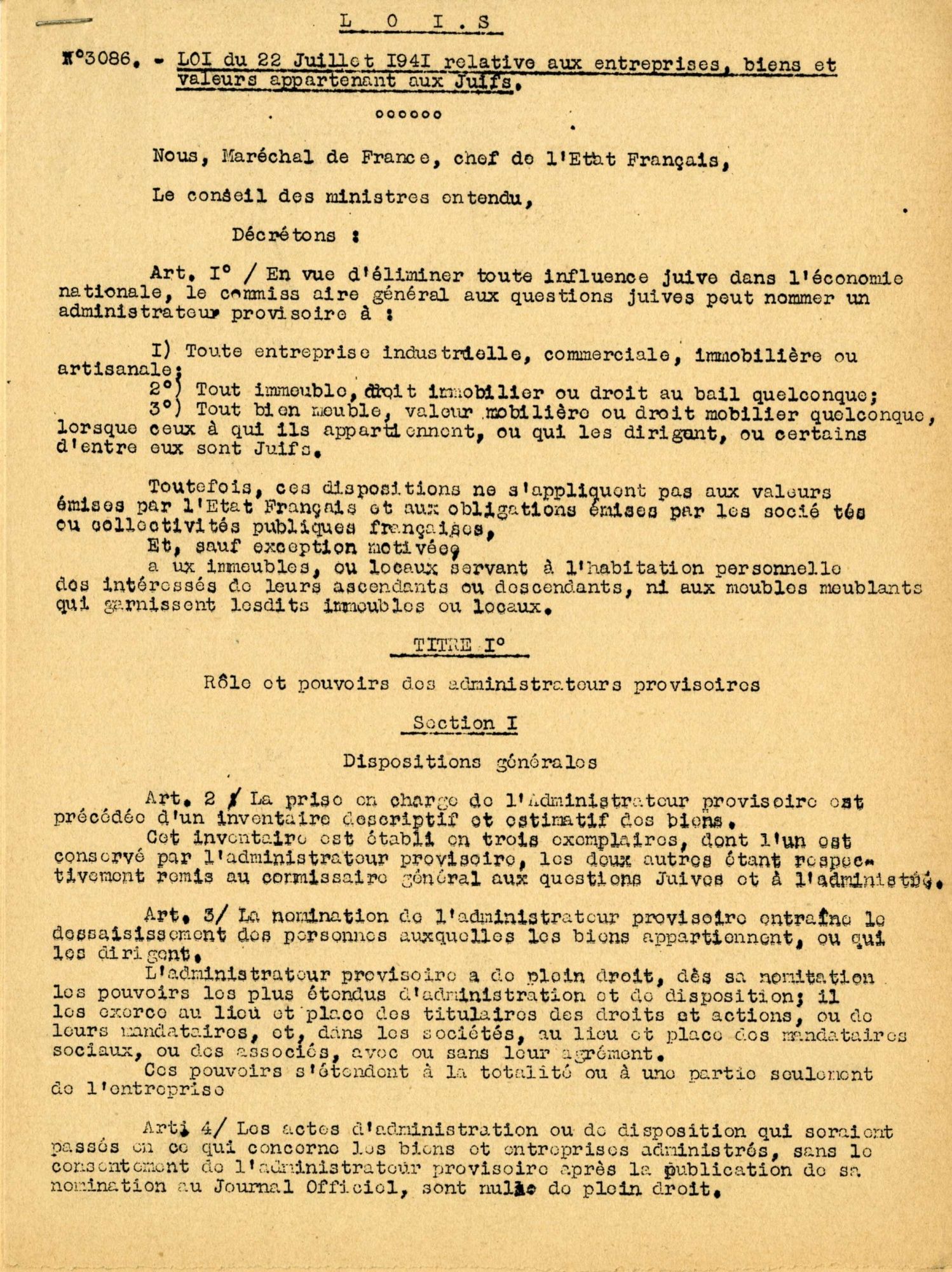 - 17 juillet 1940 : loi excluant de la fonction publique tous ceux qui ne possèdent pas la nationalité française « à titre originaire, comme étant nés de père français ».