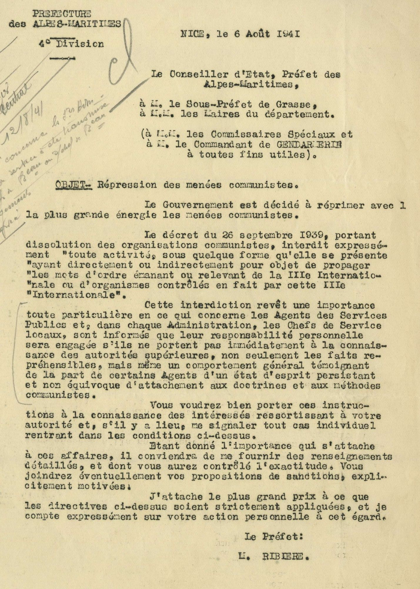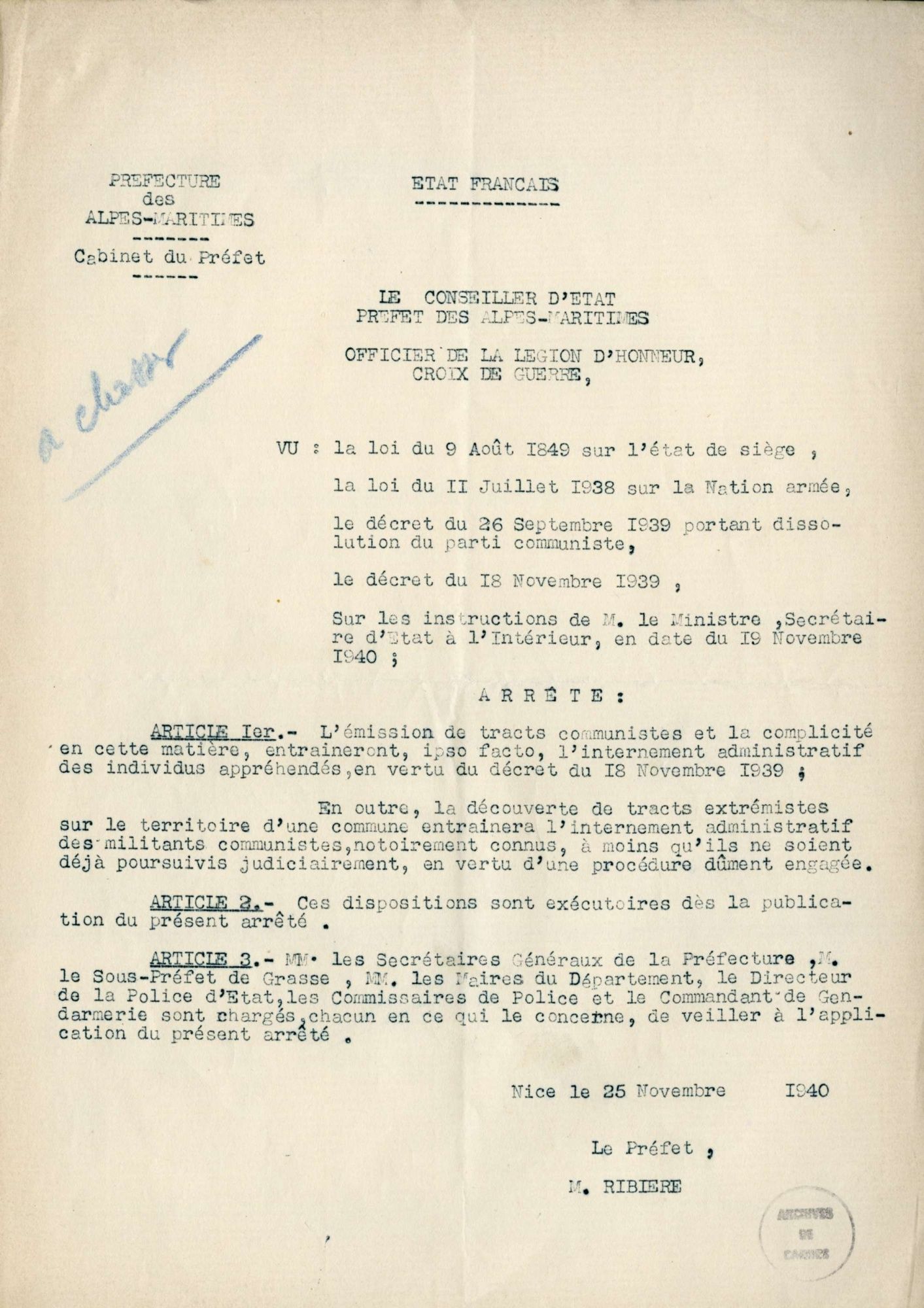 - 26 septembre 1939 : dissolution du Parti communiste (pacte germano-soviétique, le 23 août 1939). Henri Pourtalet, député communiste des Alpes-Maritimes est condamné le 1er mai 1940 à 5 ans de prison.