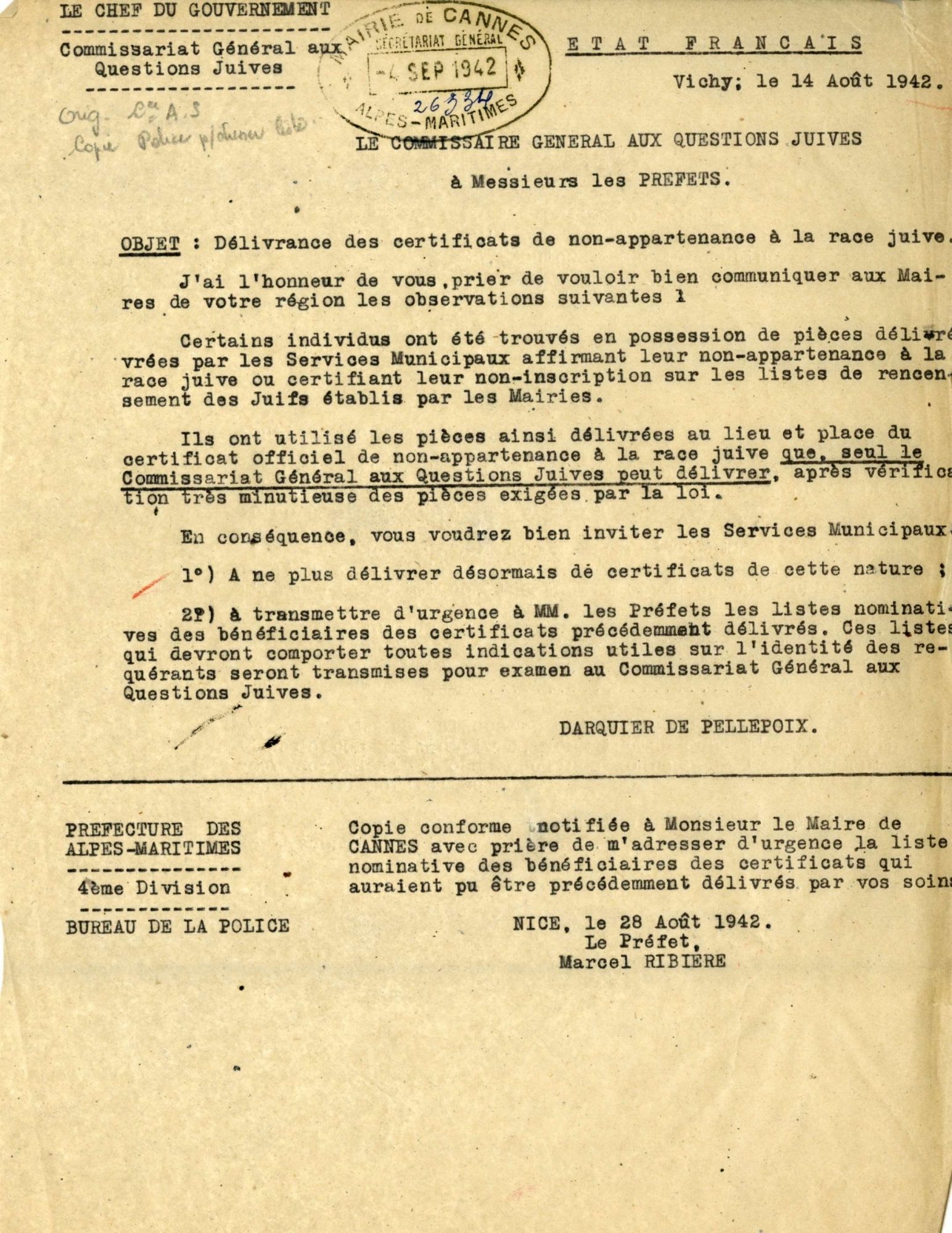 Les rafles : en 1943, de nombreux juifs ont quitté le nord pour le sud. On passe de 13 000 personnes en décembre 1942 à 20 000 en mars 1943 et même 22 000 en juin 1943. Le 26 août 1942, une rafle effectuée par policiers et gendarmes, visant 1500 à 2000 juifs étrangers, concerne la Côte d’Azur. Environ 600 sont pris dans les hôtels, dans le département, internés à la caserne d’Auvarre (Nice) puis envoyés à Drancy soit 37% du total prévu, ce qui laisse supposer une relative non implication. 62 personnes sont interpellées dans des hôtels de Cannes. Ce fait marque un tournant car la population, auparavant non avertie, le sait et condamne. On a trace d’un tract diffusé à Cannes dès le 1er août 1942 qui évoque les persécutions dont sont victimes les Juifs, 15 jours après la rafle du Vel d’Hiv ; tract intitulé « Aidez-nous ». Les Italiens accordent leur protection aux nombreux juifs qui vivent dans le Sud-Est. Cela est dû à une absence de tradition antisémite et à la volonté de ne pas paraître inféodé aux Allemands, de ne pas se couper de l’opinion anglo-saxonne, ainsi qu’à l’action du banquier Donati, juif bien introduit auprès des autorités italiennes. Les Italiens empêchent les Français d’arrêter des juifs en situation irrégulière mais c’est un tollé allemand : ils seront placés en résidence forcée. 2000 juifs en situation irrégulière sont assignés à résidence dans des communes comme Saint-Martin-Vésubie.