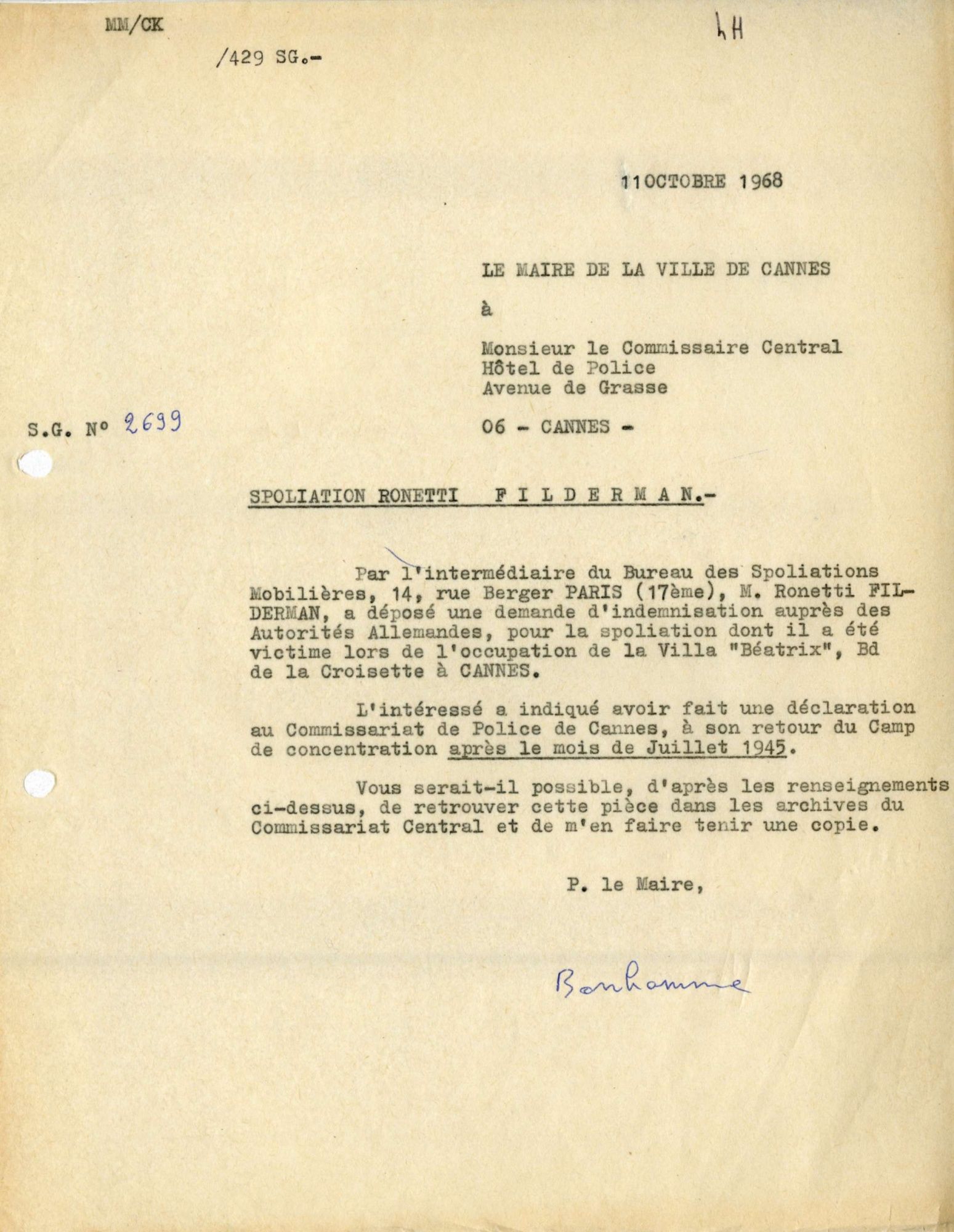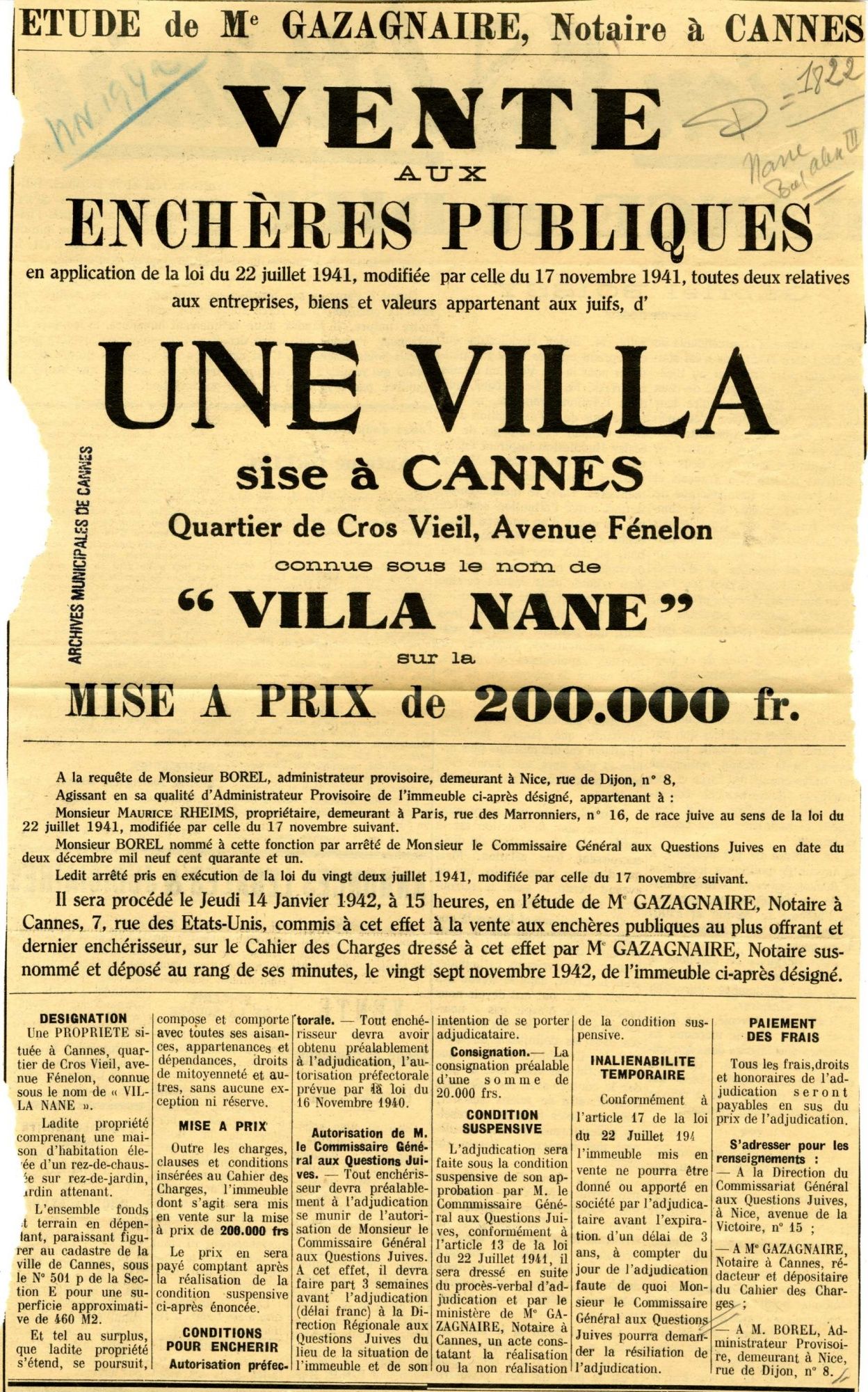 - 22 juillet 1941 : loi sur les entreprises, biens et valeurs appartenant aux juifs. « Suite à l’arrêté du 23 novembre 1940 sur la liquidation des biens juifs (…) il est permis (de penser) que l‘Etat pourra mettre les villas Rothschild à la disposition de la ville » : délibération du 14 novembre 1941. Expropriations au profit de la ville validées par le Tribunal civil le 29 mai 1943.