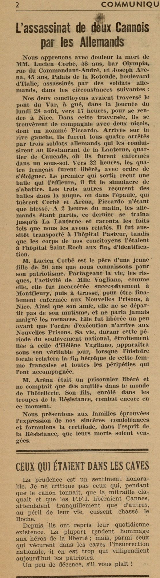 Son : pour rappeler le contexte de ces années de terreur, un extrait du témoignage de la mère d'Hélène Vagliano, dans son récit intitulé "Hôtes de la Gestapo" (Bh221), où elle raconte ses retrouvailles avec sa fille, l'attitude brutale des miliciens : texte lu et interprété par de jeunes comédiens de l'Ecole régionale d'acteurs de Cannes. L'extrait est inséré dans la rubrique précédente.