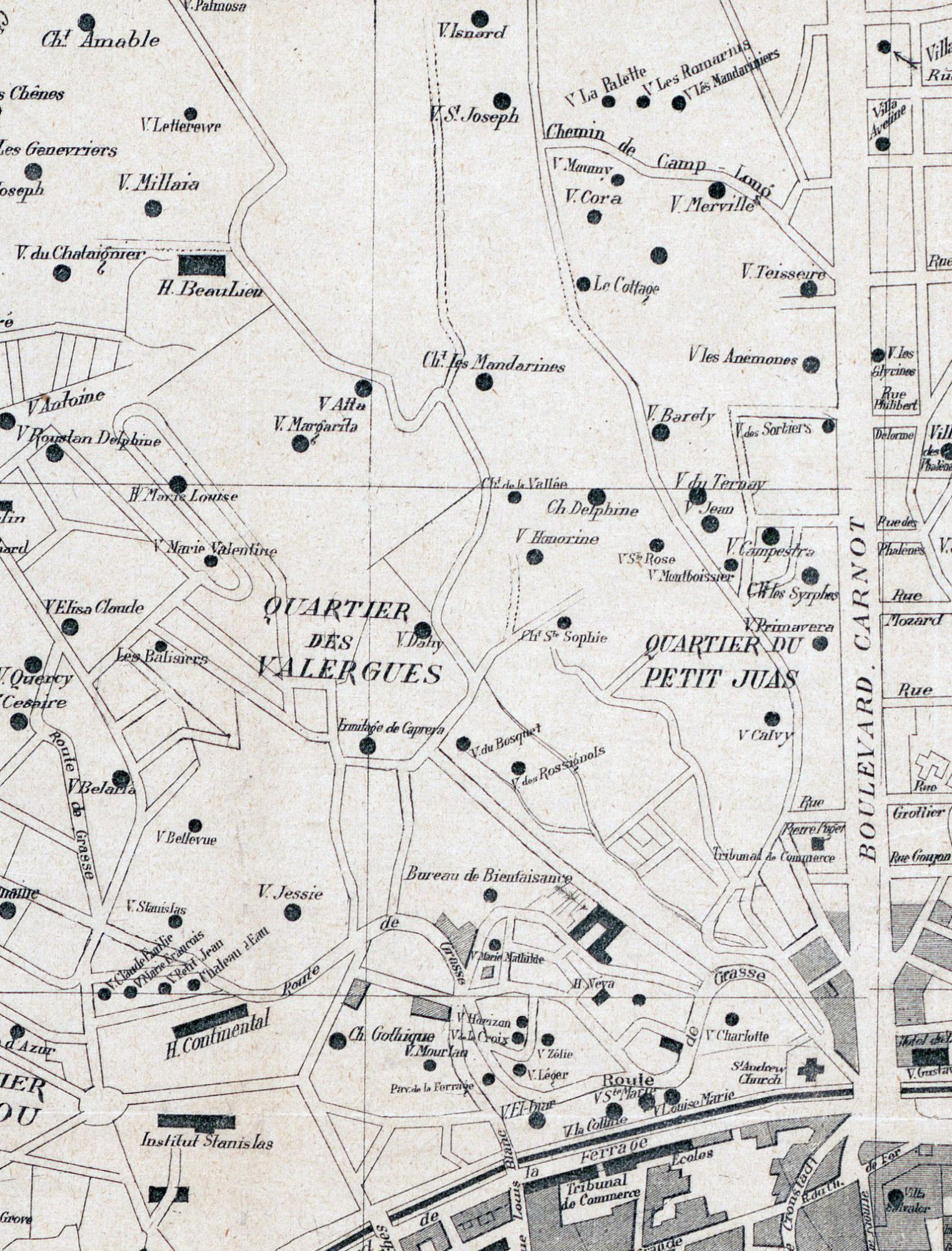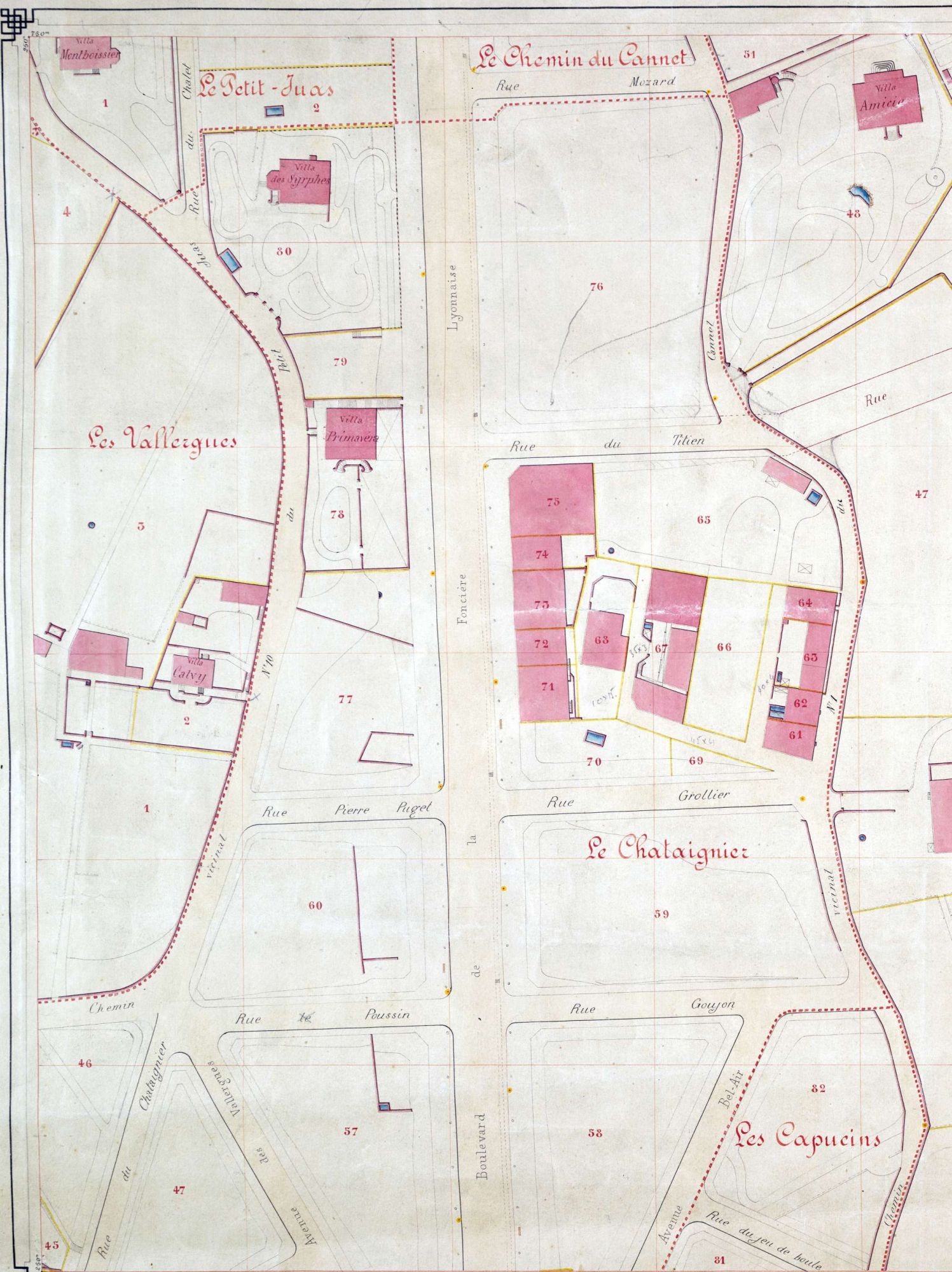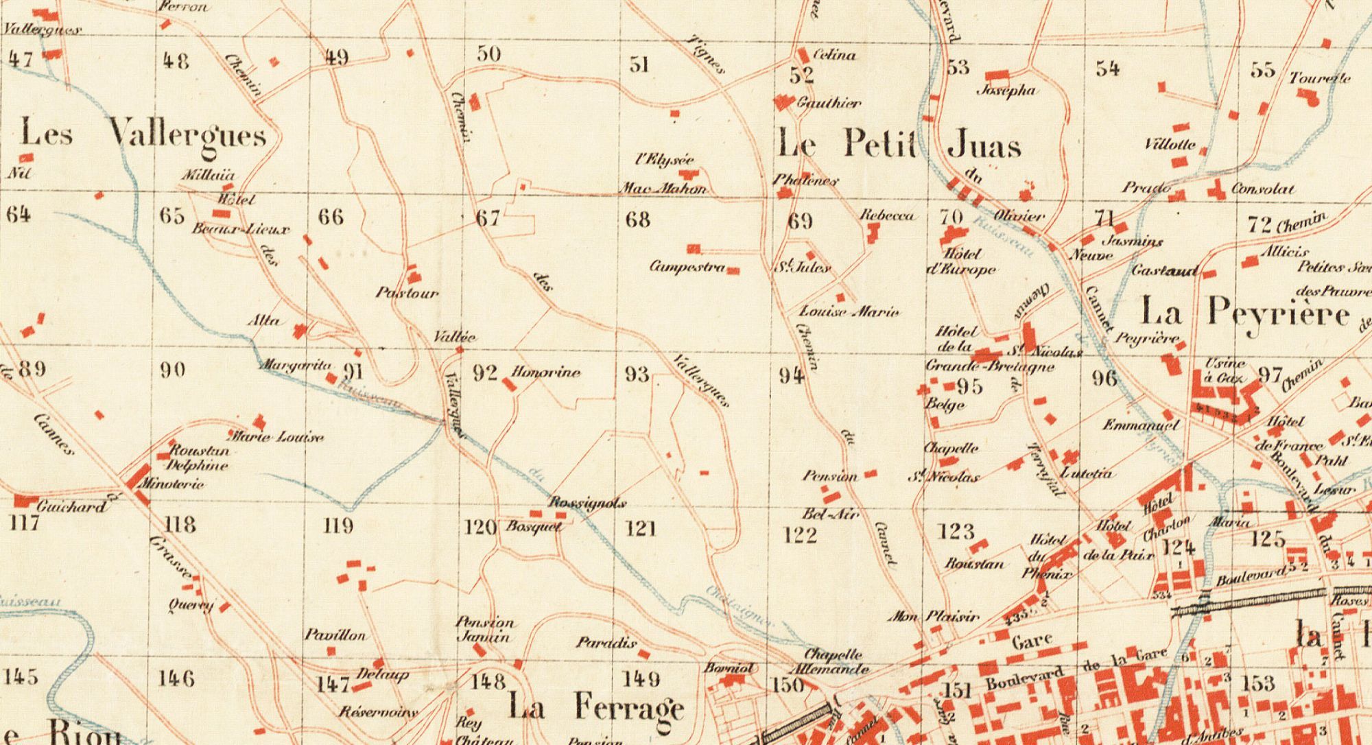 Les villas sont entourées de jardins, on note la présence de bassins ou de réservoirs pour conserver l'eau, denrée précieuse. A partir de la percée de Carnot en 1881-82, de part et d'autre de l'axe, les parcelles vont rapetisser avec les lotissements qui vont fleurir, et tout naturellement la population va s'accroître.