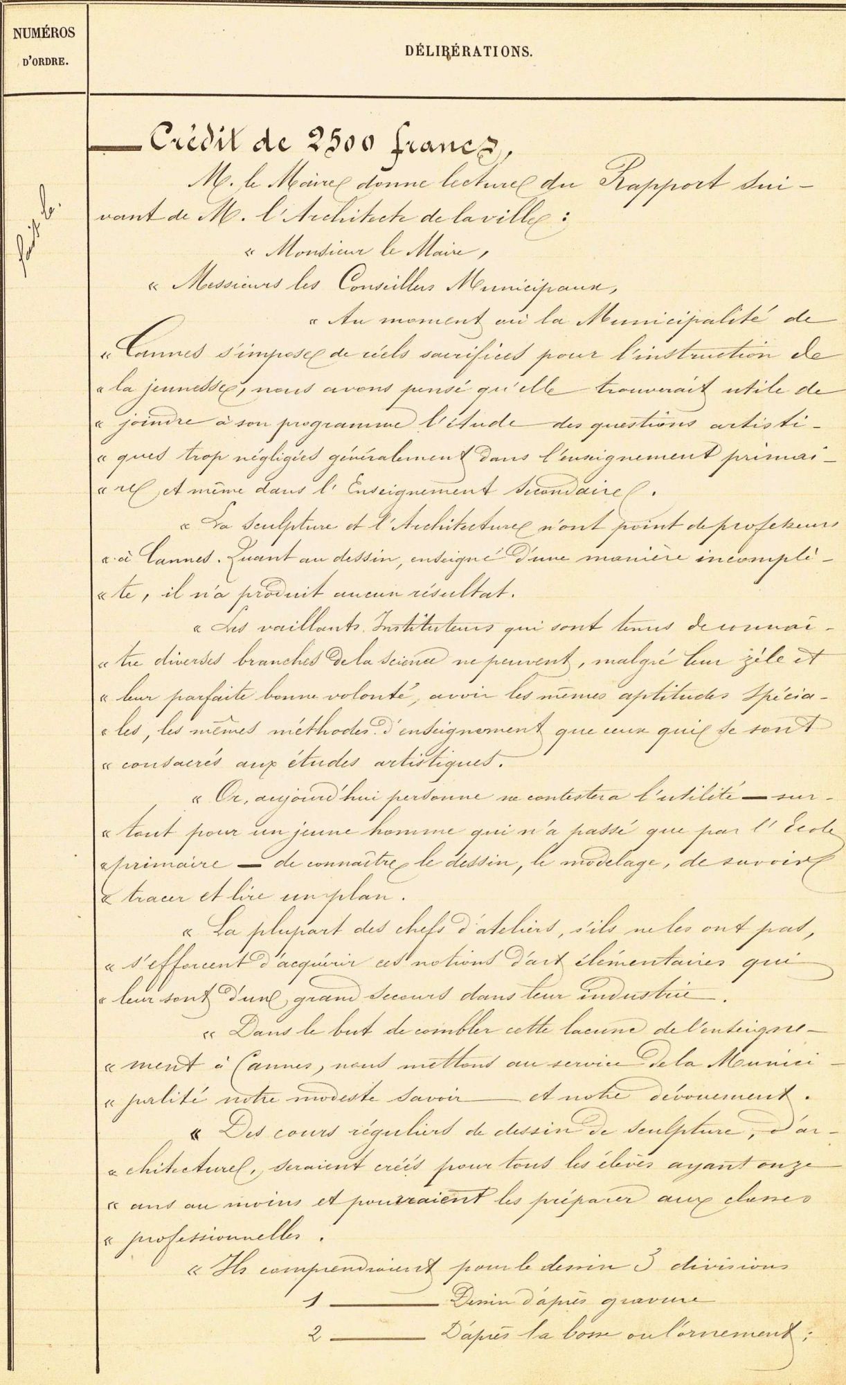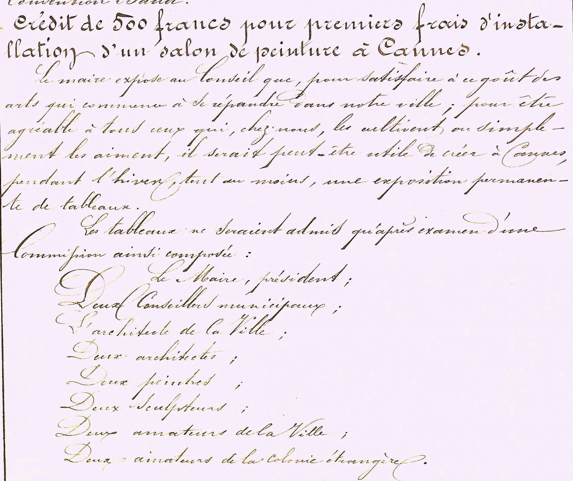 Un projet ambitieux d'une école des beaux-arts vit le jour en 1881, puis un salon est créé ; une association (Association des Beaux-Arts de Cannes) reprend le flambeau, dépose ses statuts en 1904 et organise des salons qui sont rapidement un succès.
