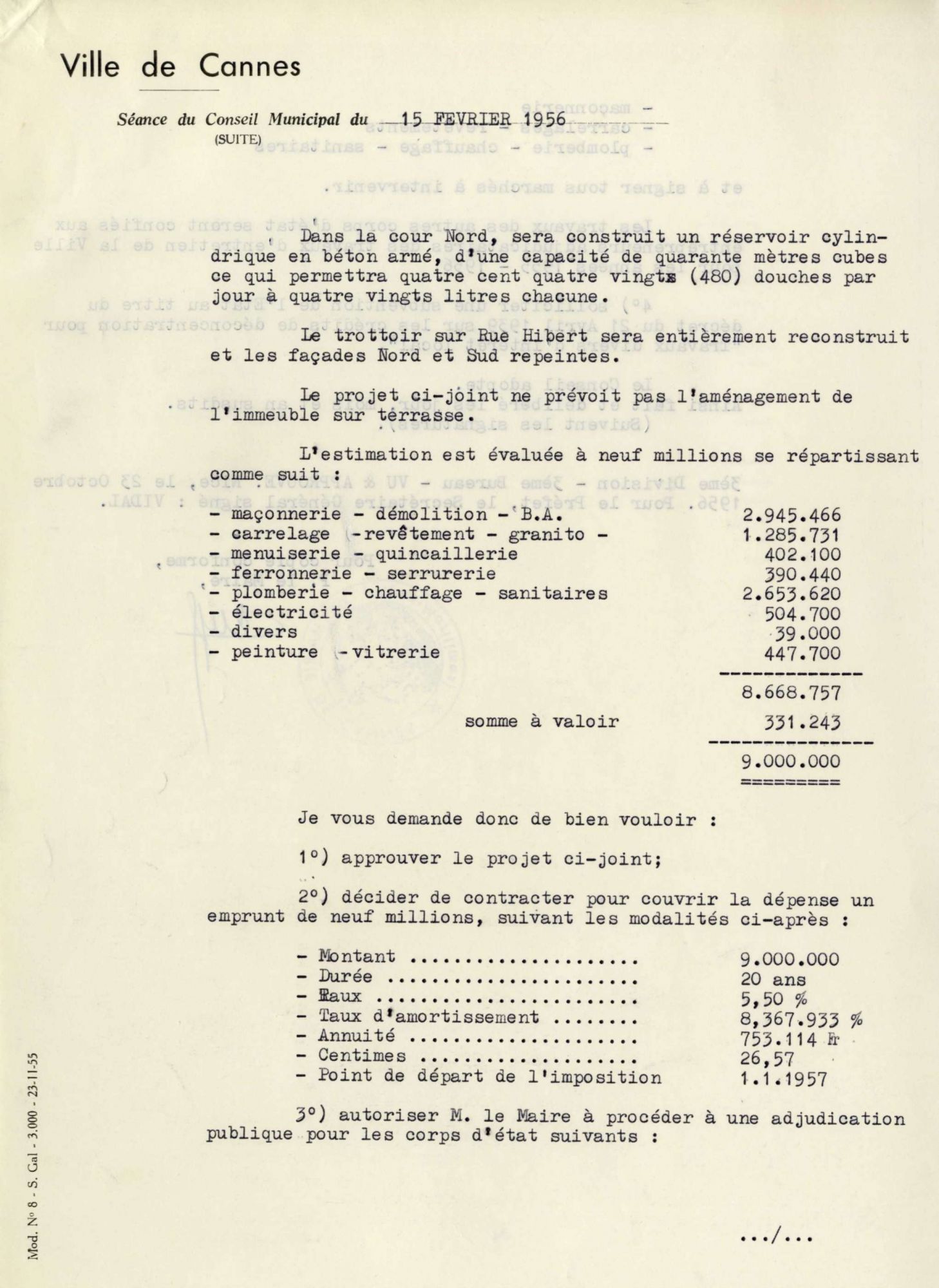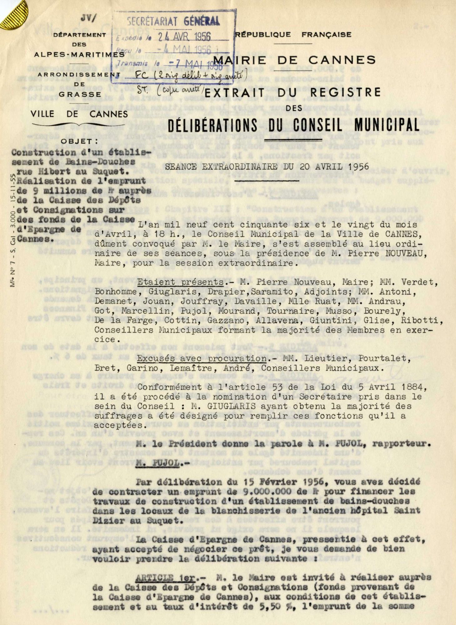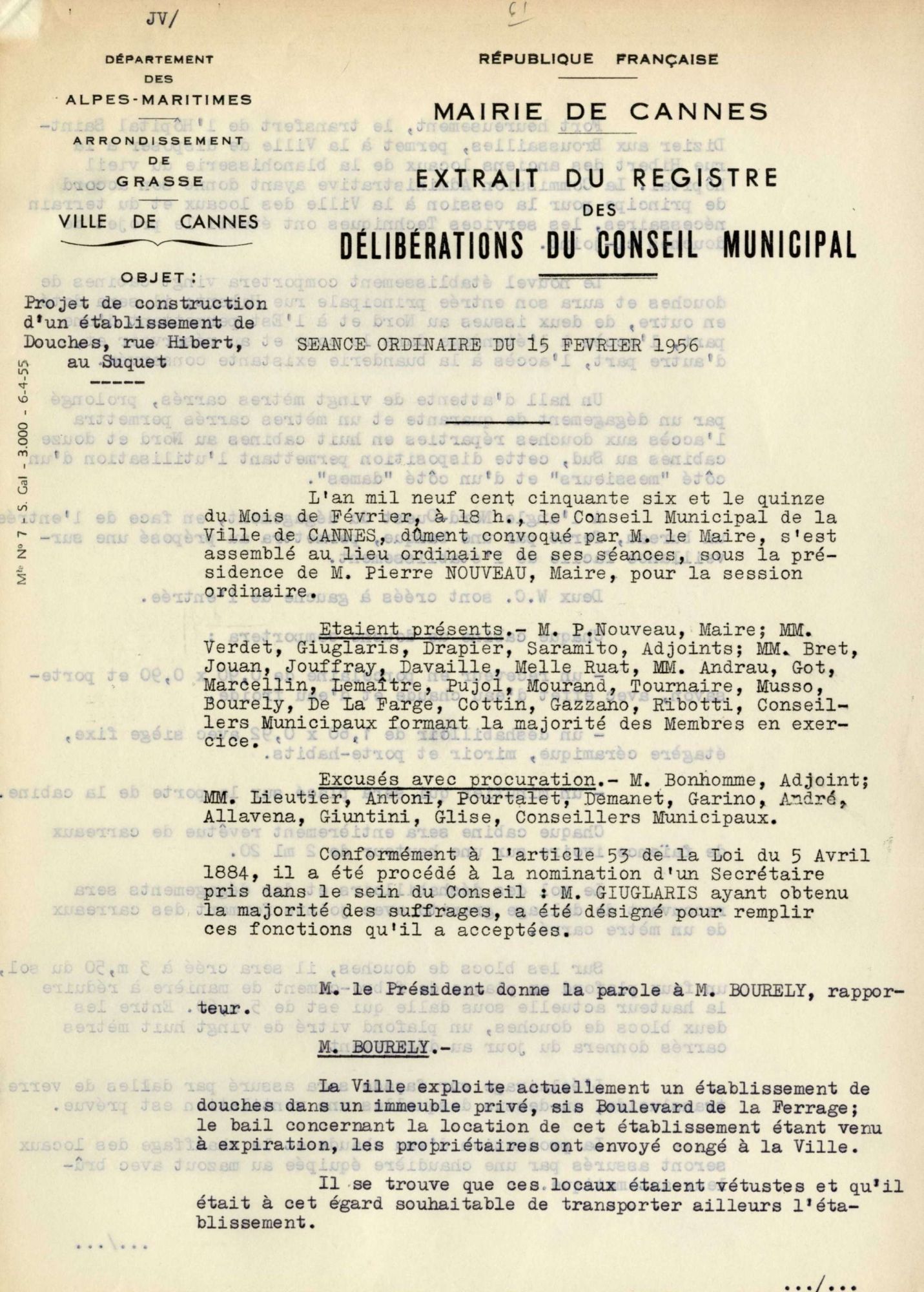 Le 29 novembre 1956, des difficultés s’étant produites pour trouver un adjudicataire de ces travaux, la dépense passa à 10 millions. Un arrêté préfectoral du 28 avril 1956 autorisa un emprunt. L’entreprise cannoise qui réalisa ce bâtiment fut M. Lucien Zanotti pour le gros de la maçonnerie. Le procès-verbal de réception intervint en juillet 1957.