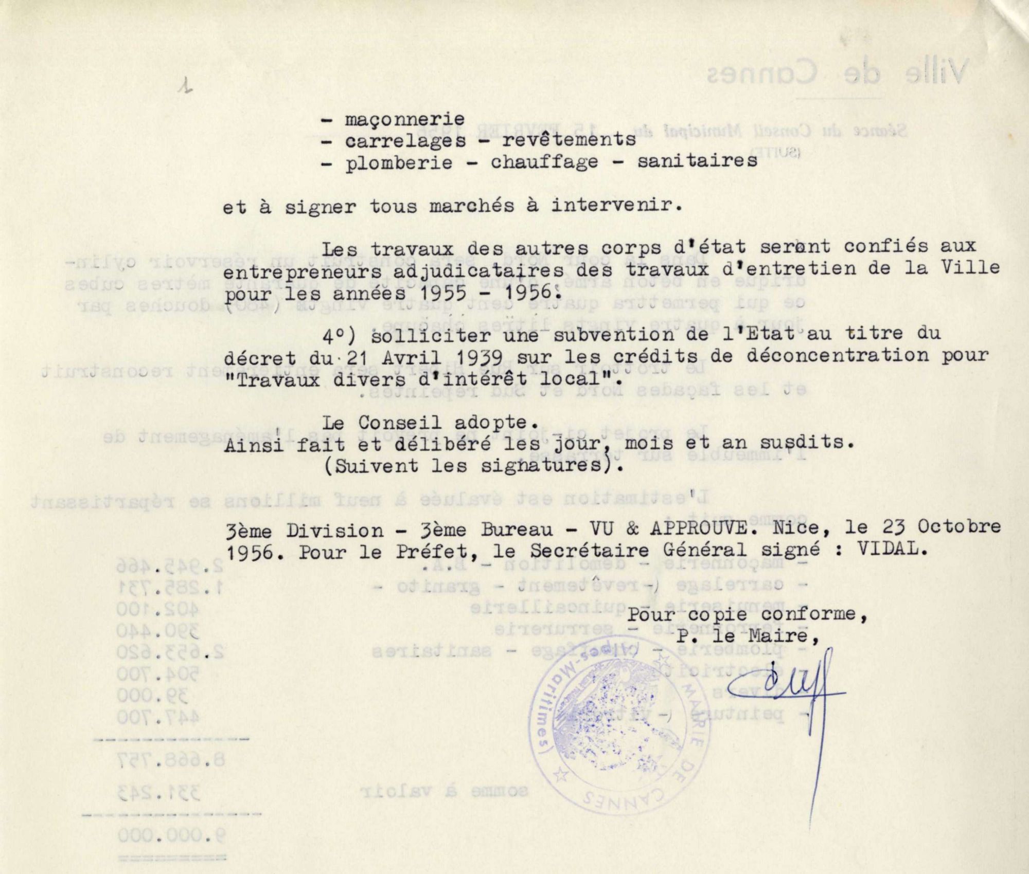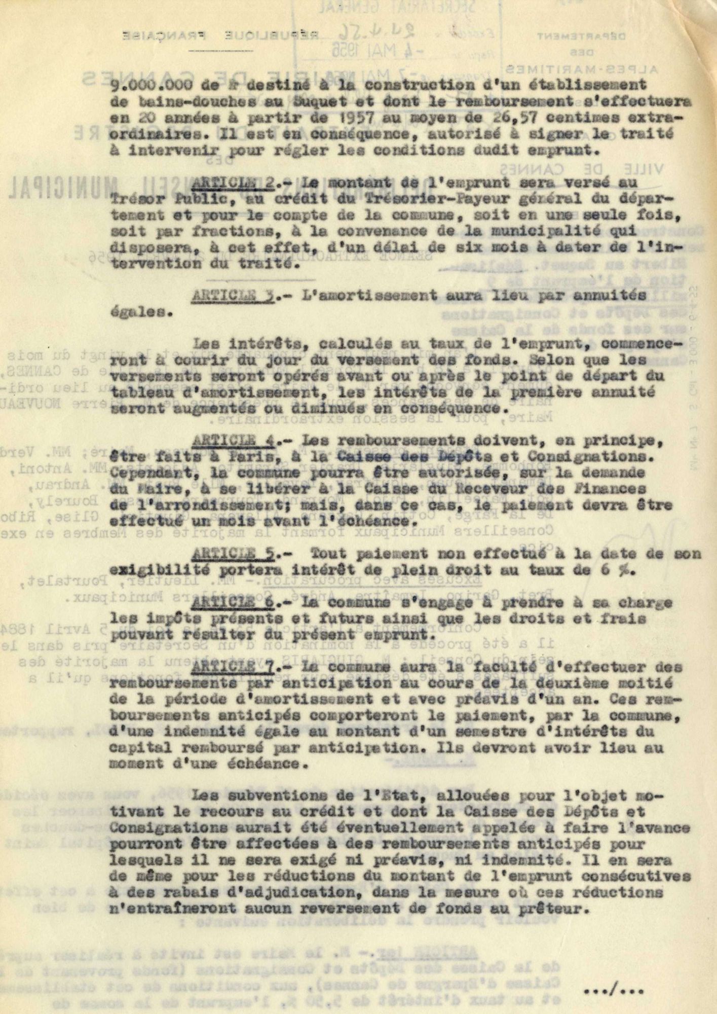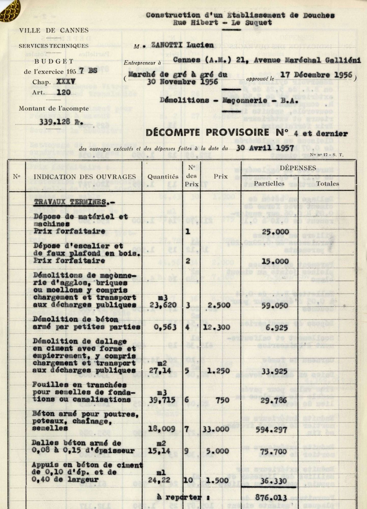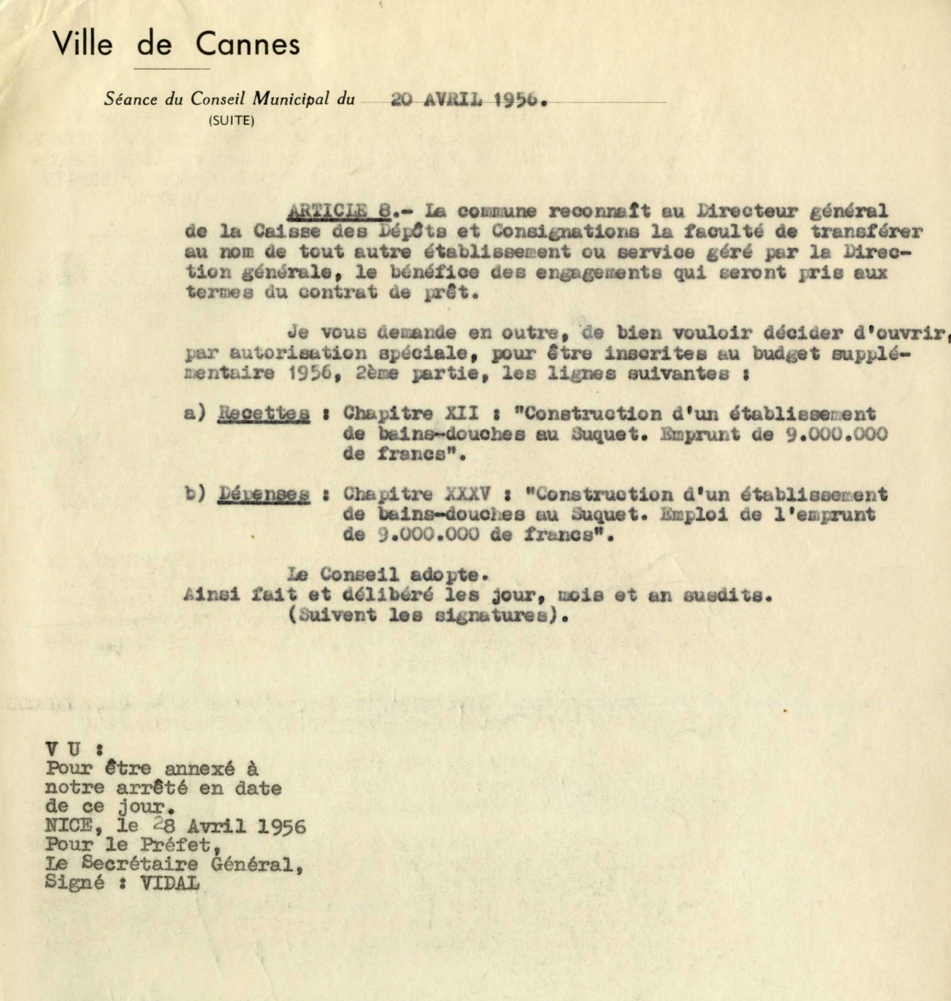 Le 29 novembre 1956, des difficultés s’étant produites pour trouver un adjudicataire de ces travaux, la dépense passa à 10 millions. Un arrêté préfectoral du 28 avril 1956 autorisa un emprunt. L’entreprise cannoise qui réalisa ce bâtiment fut M. Lucien Zanotti pour le gros de la maçonnerie. Le procès-verbal de réception intervint en juillet 1957.