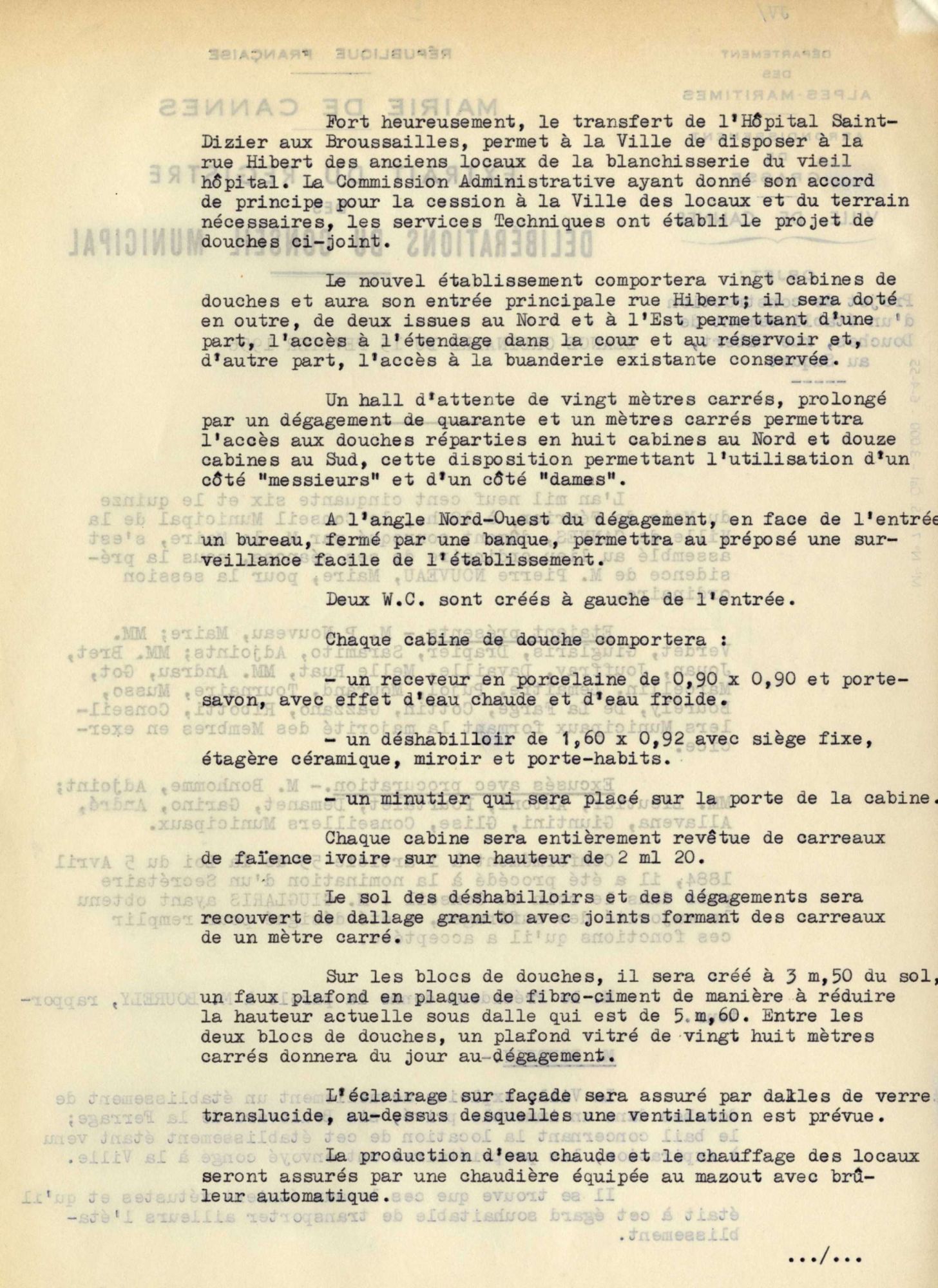Le transfert du vieil hôpital rue Saint-Dizier, aux Broussailles, permit à la ville de disposer de son ancienne blanchisserie pour la transformer. Vingt cabines furent créées avec deux issues au nord et à l’est, pour l’étendage et l’accès à la buanderie. Le hall d’attente de 20 m2 favorisa l’accès aux douches réparties en 8 cabines au nord et 12 au sud, avec un côté messieurs et un côté dames. Un bureau fermé avec un préposé organisa la surveillance de l’établissement. Chaque cabine fut équipée d’un déshabilloir, d’un minutier et d’un receveur en porcelaine, avec porte-savon. Un réservoir en béton armé autorisa 480 douches par jour à raison de 80 litres chacune. Un emprunt de 9 millions est décidé, auprès de la Caisse d’épargne de Cannes, pour cette construction. La surface couverte au total sera de 188 m2.