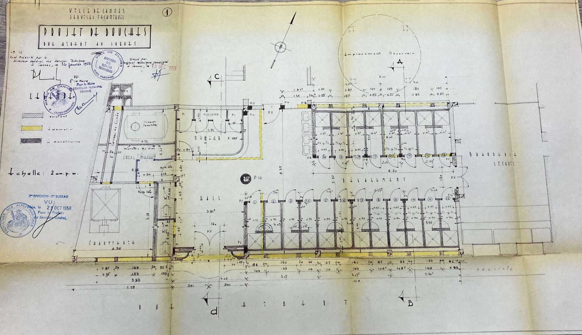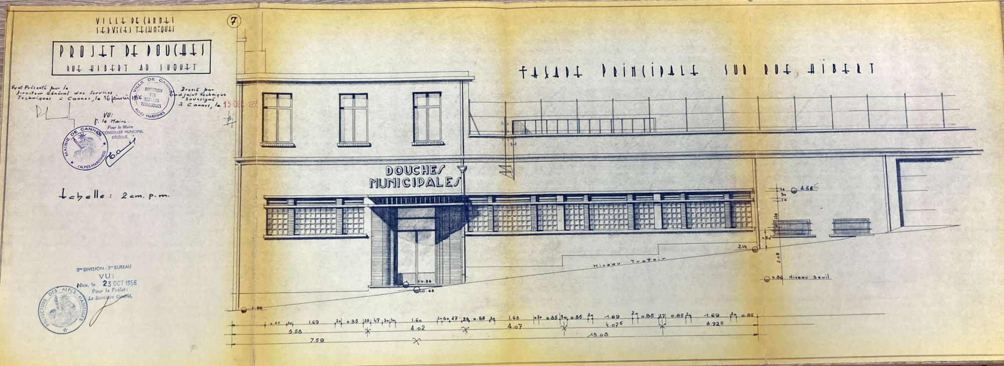 Une délibération municipale, le 15 février 1956, établit un projet de construction d’un établissement de douches rue Hibert au Suquet. La ville exploitait déjà un autre établissement dans un immeuble privé sis boulevard de la Ferrage, mais ces locaux loués étaient vétustes et les propriétaires désireux de reprendre leur bien.