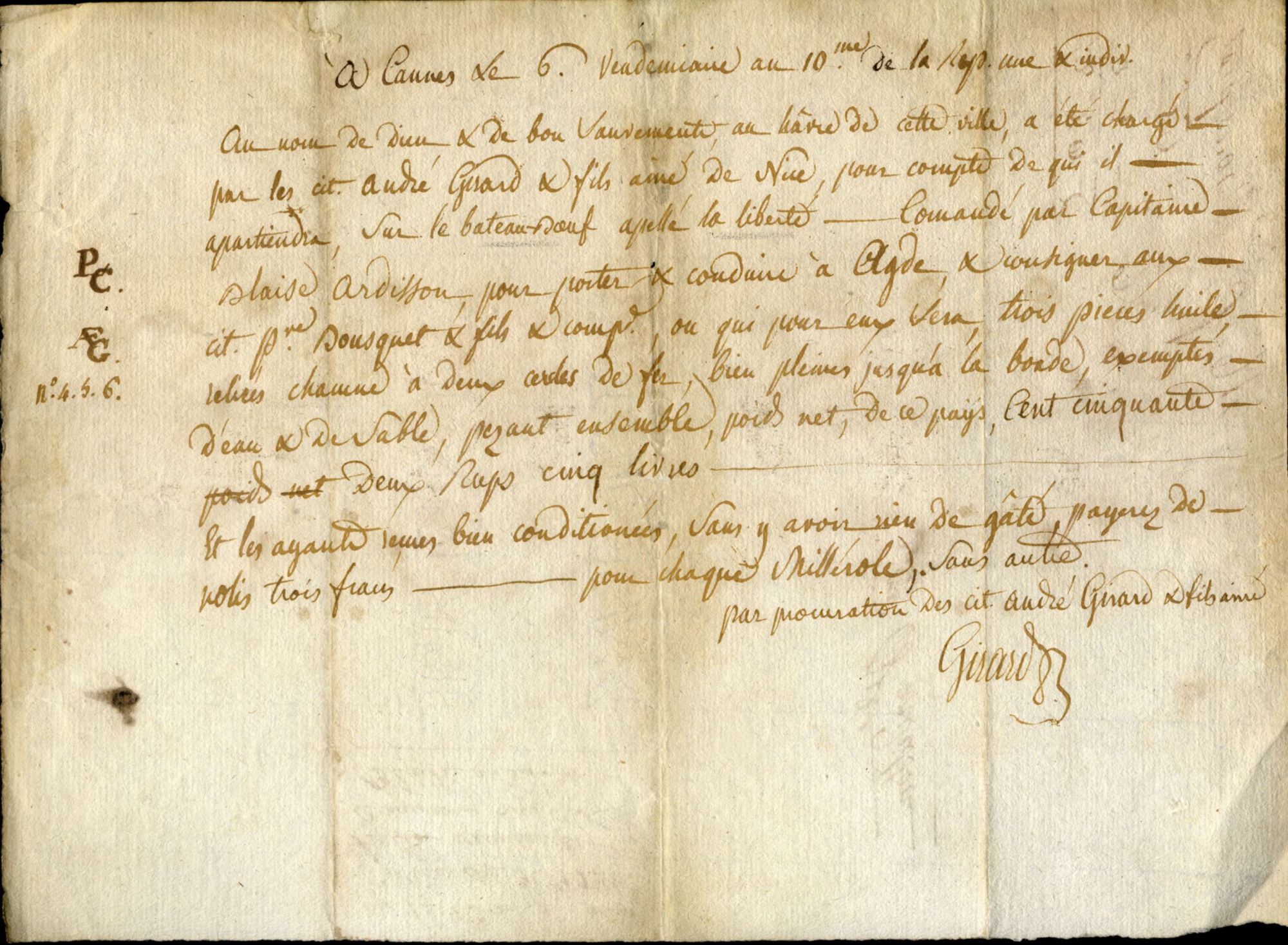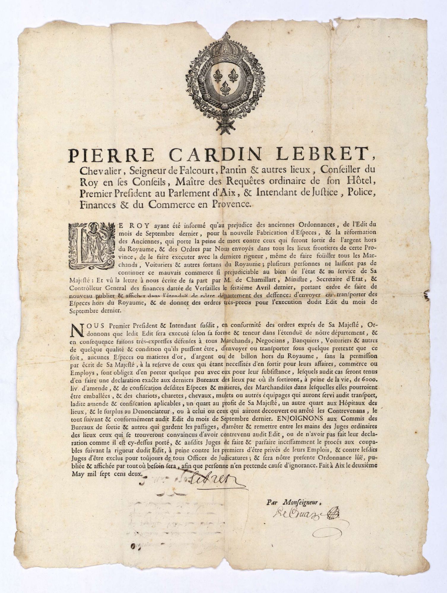 1702 : l'Intendant de Provence interdit par Ordonnance de faire sortir du royaume les métaux précieux (or et argent). En 1776, Jean Charles Riouffe est greffier à l'Amirauté, juridiction maritime de l'Ancien Régime.