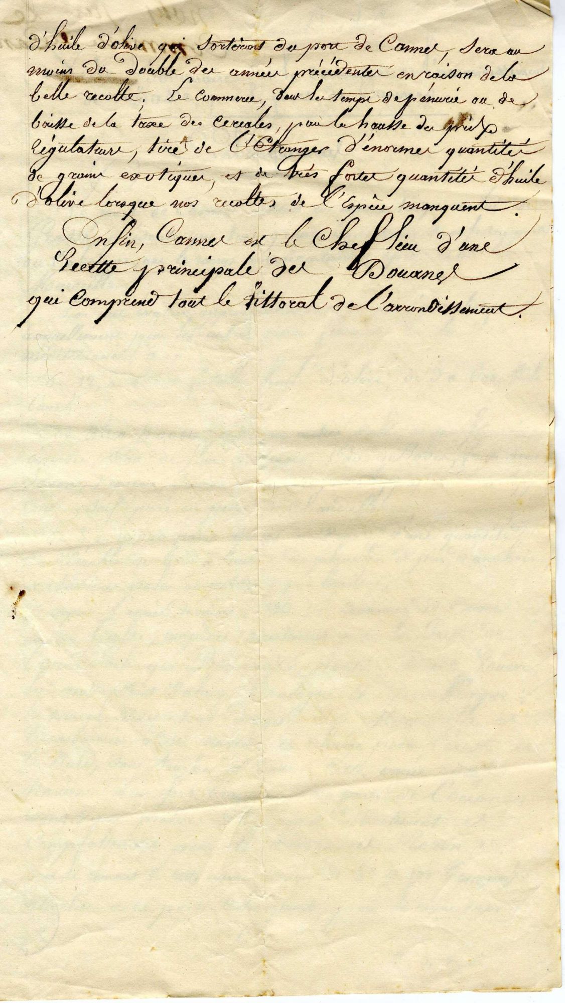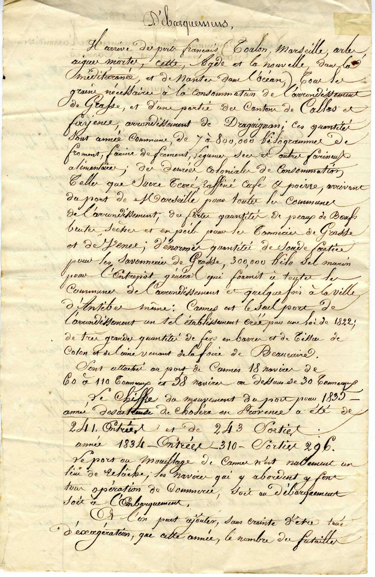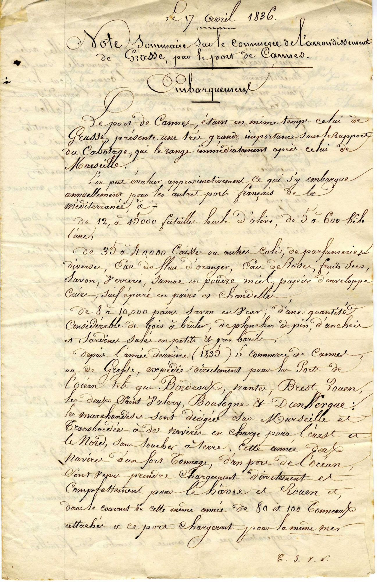 Un "gardien" du port apparaît : l'état de capitation (impôt par tête) assigne à 6 livres Christophe Ardisson, en 1780. Quelles marchandises passent alors par le port de Cannes ? Des cargaisons variées : huile, savon, sont chargées sur les felouques et les tartanes, pour des voyages jusqu'à Sète ou Agde. Bien entendu, les boissons dont le vin, le blé et les farines, mais aussi le bois, le cuir, les étoffes circulent, et les taxes pleuvent, avec des droits de sortie. Un document de 1836 donne un éventail précis des marchandises transitant par le port (2F7). La police du port a fort à faire !