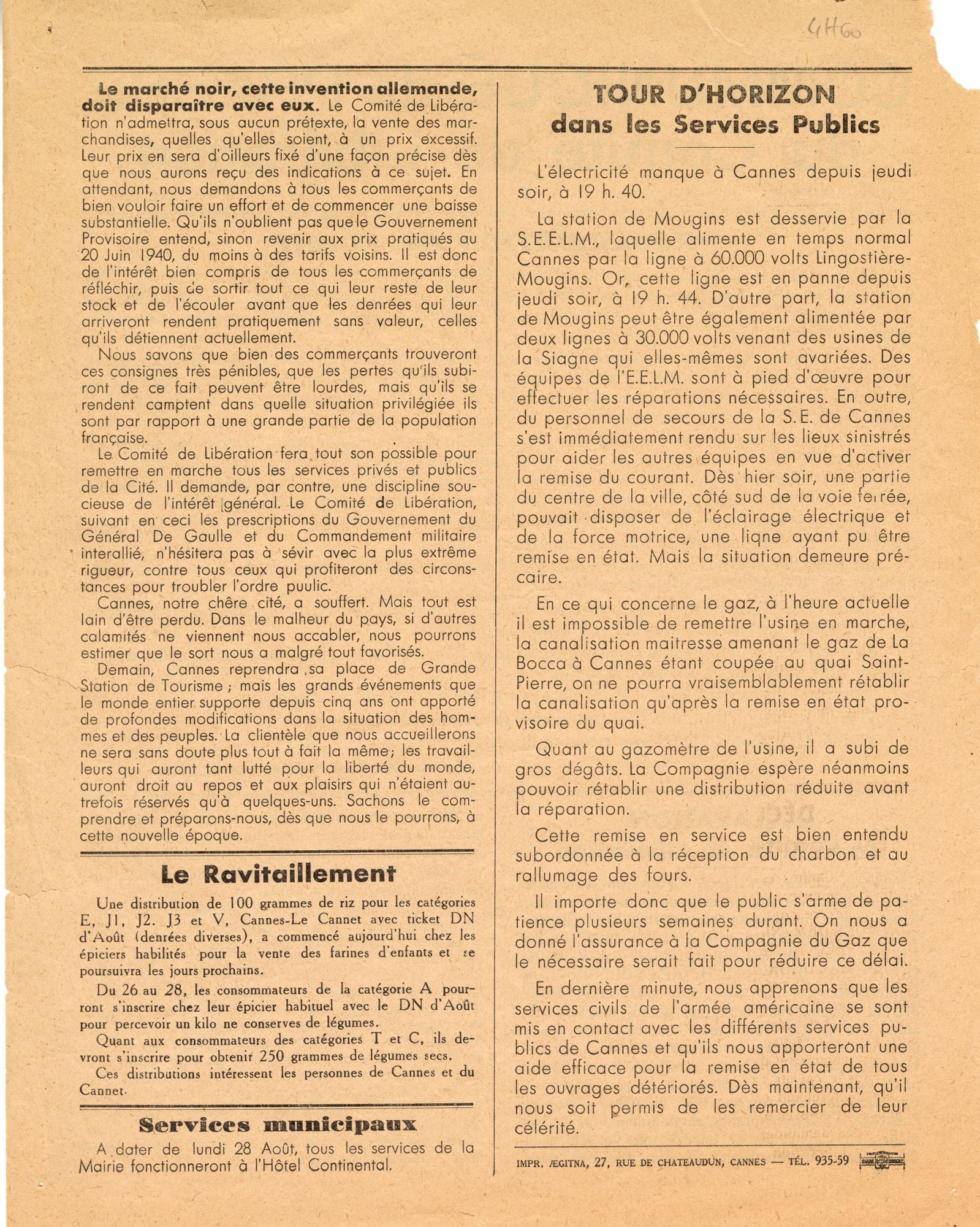 La liberté retrouvée, Cannes se dote d’un quotidien d’information républicain, qui se veut : « hors de tout parti pris politique, au service de la France républicaine ». Il parait jusqu’au 2 septembre 1945 et cède la place au quotidien Nice-Matin.