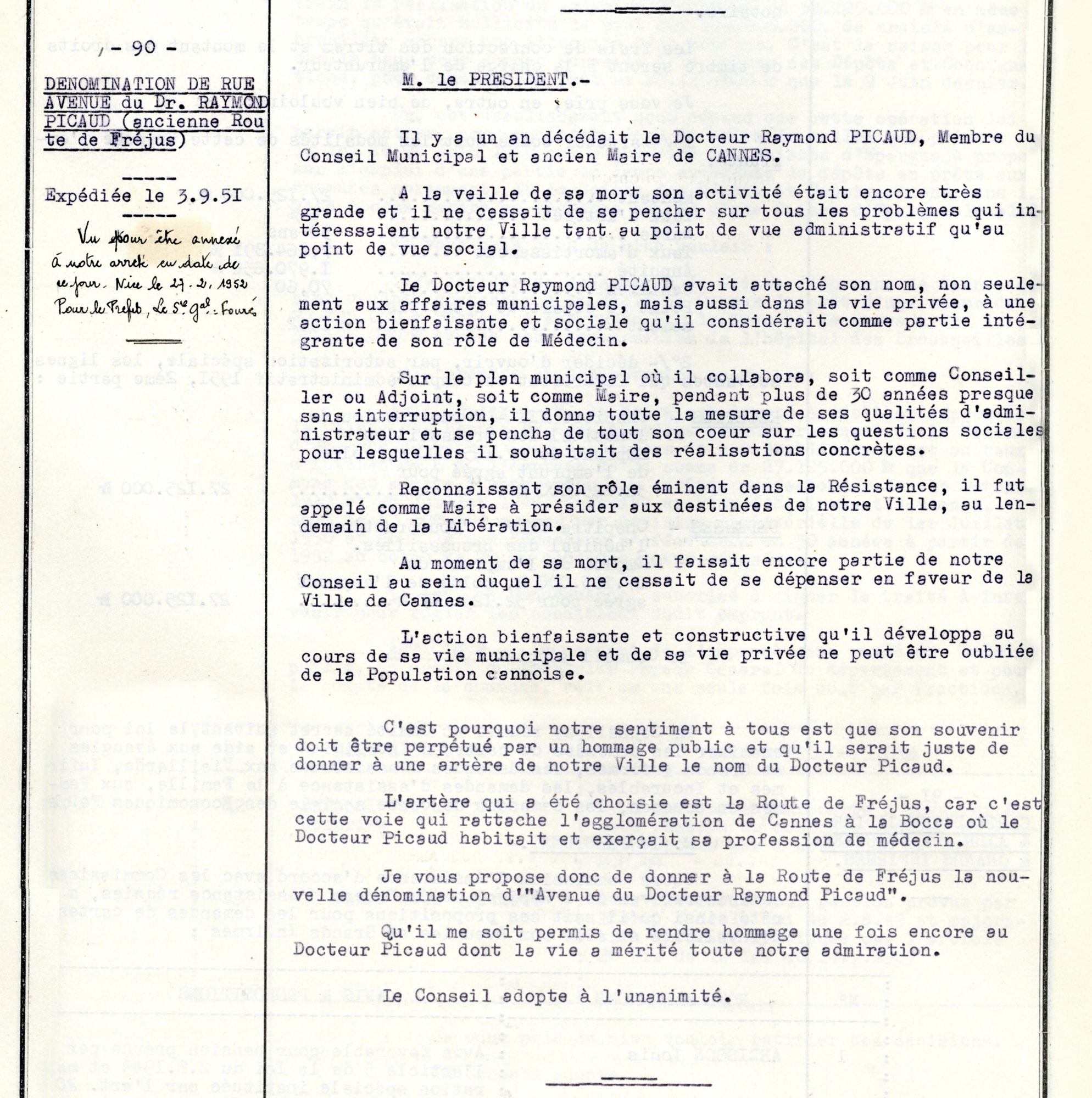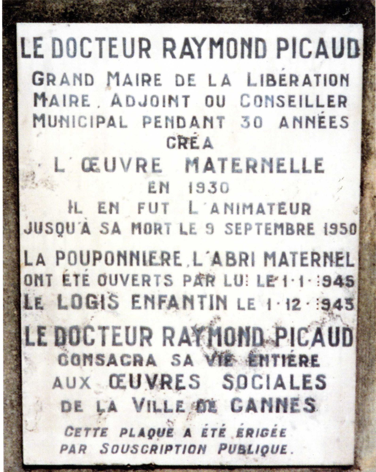 Originaire de Dordogne, Raymond Picaud s’installe à Cannes à la veille de la Première Guerre mondiale pour y exercer son activité de médecin. Il ouvre un cabinet rue Joseph Barthélémy, dans le quartier de la Bocca. Dévoué envers les plus démunis qu’il soigne souvent gratuitement, le docteur Picaud, surnommé le « médecin des pauvres », gagne l’estime des Boccassiens. Décoré de la médaille militaire et de la croix de guerre, ce Républicain convaincu, antifasciste, profondément humaniste, fait son entrée en politique au lendemain de la Grande Guerre, animé par le désir d’être utile à ses concitoyens. C’est d’abord en 1919, comme conseiller municipal sous la mandature d’André Capron, puis en 1925 sur la liste du Comité d’union des gauches, avant d’être nommé premier adjoint sous la municipalité de Louis Vial (1929-1931). En 1932, il quitte la rue Barthélémy pour s’installer chalet Gérôme, route de Fréjus.