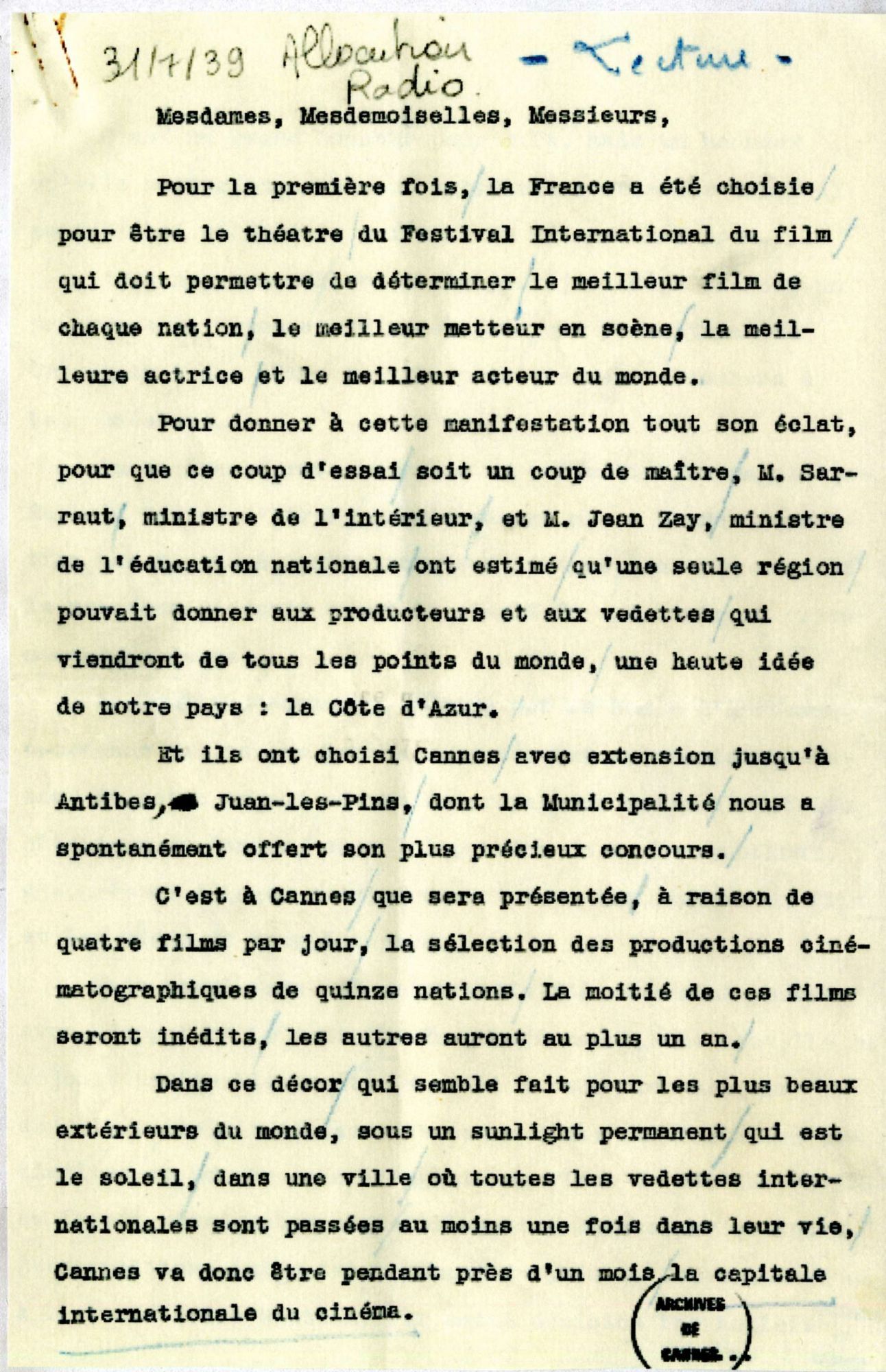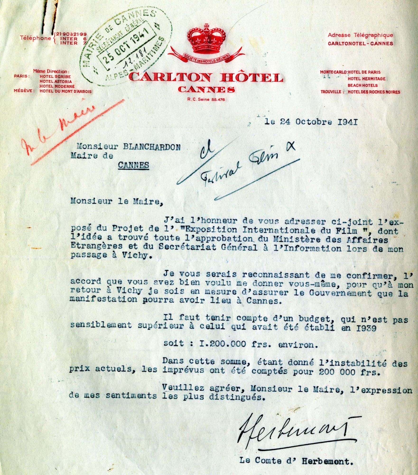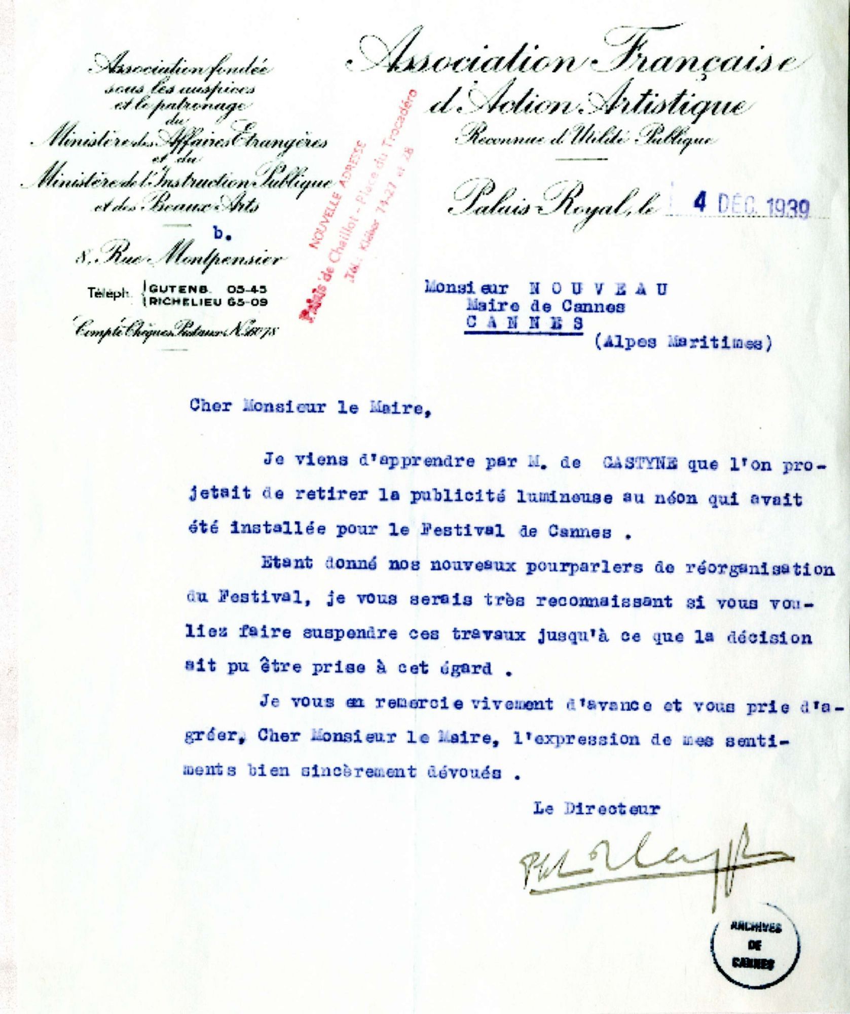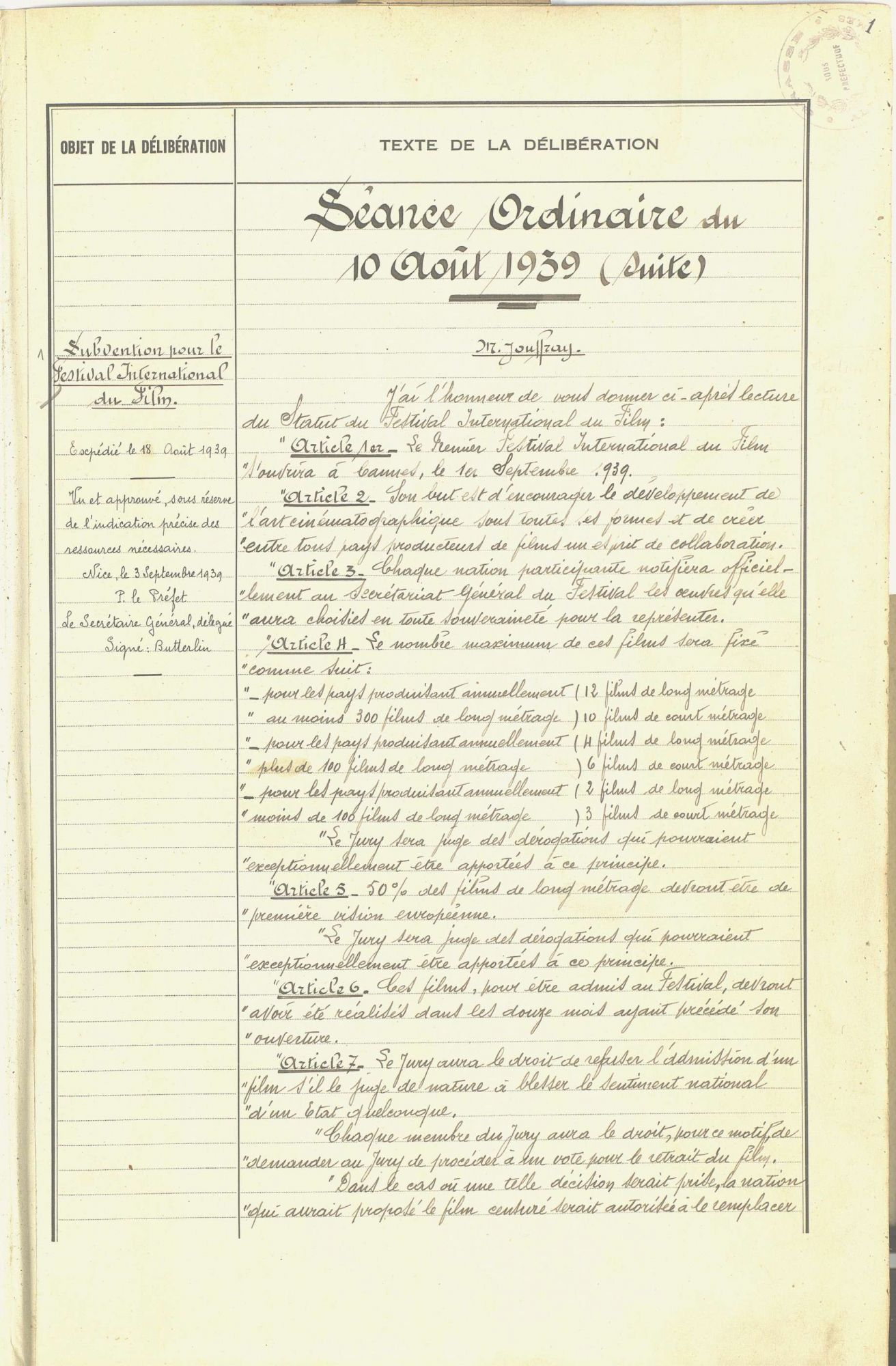 Du 1er au 20 septembre 1939 : ce sont les dates prévues pour la tenue du 1er Festival sous l'égide de Jean Zay, Philippe Erlanger et Louis Lumière. Sont posées les bases du statut et du règlement du festival.