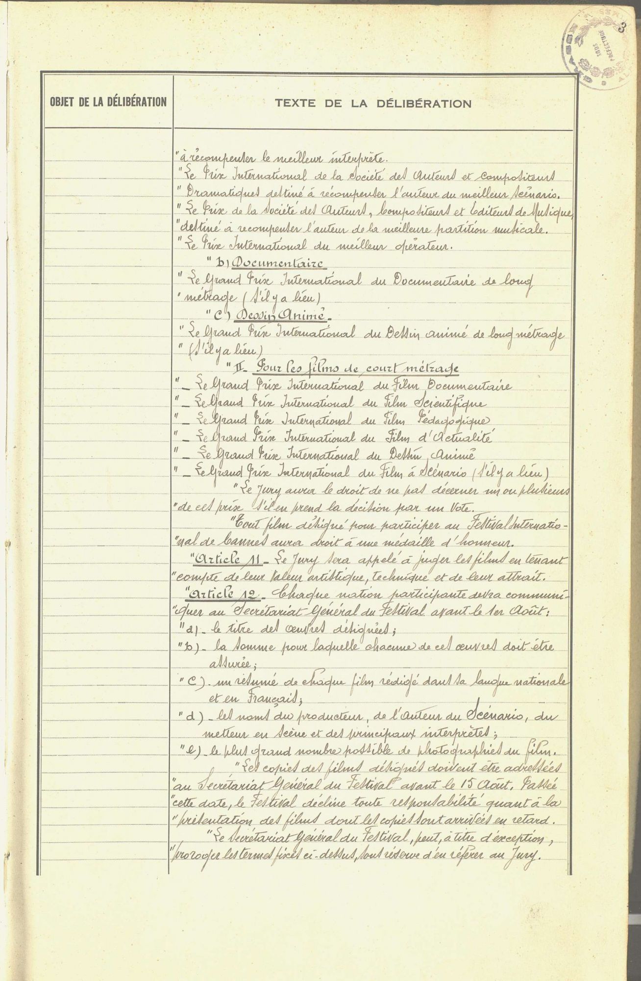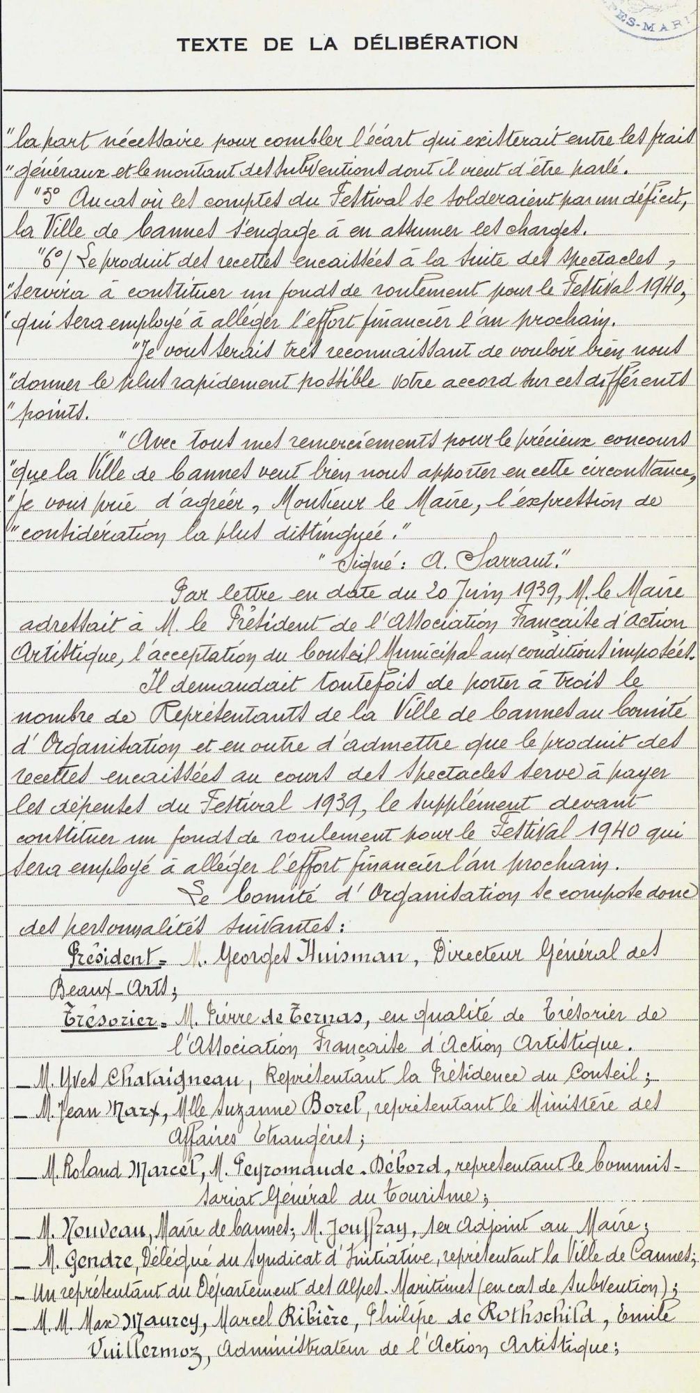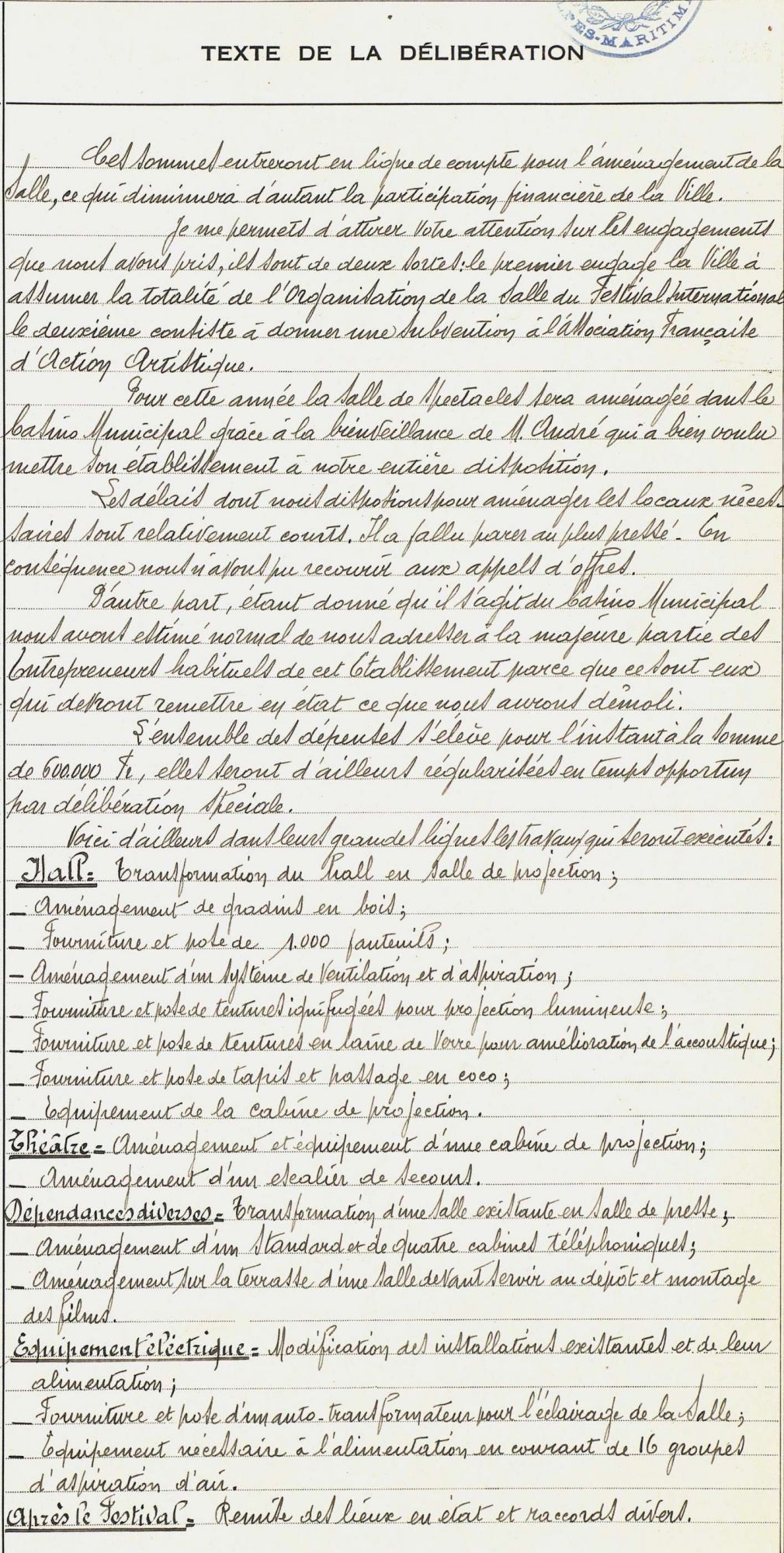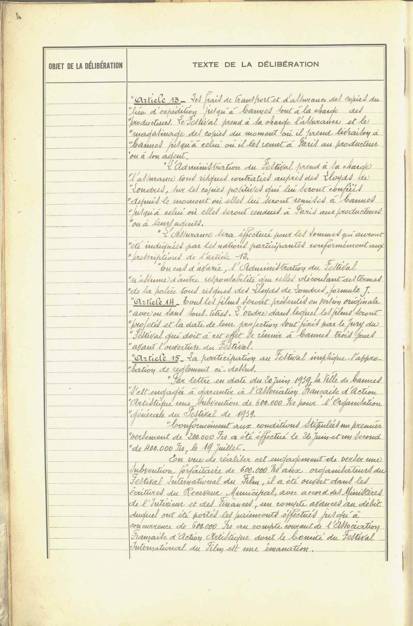 Du 1er au 20 septembre 1939 : ce sont les dates prévues pour la tenue du 1er Festival sous l'égide de Jean Zay, Philippe Erlanger et Louis Lumière. Sont posées les bases du statut et du règlement du festival.