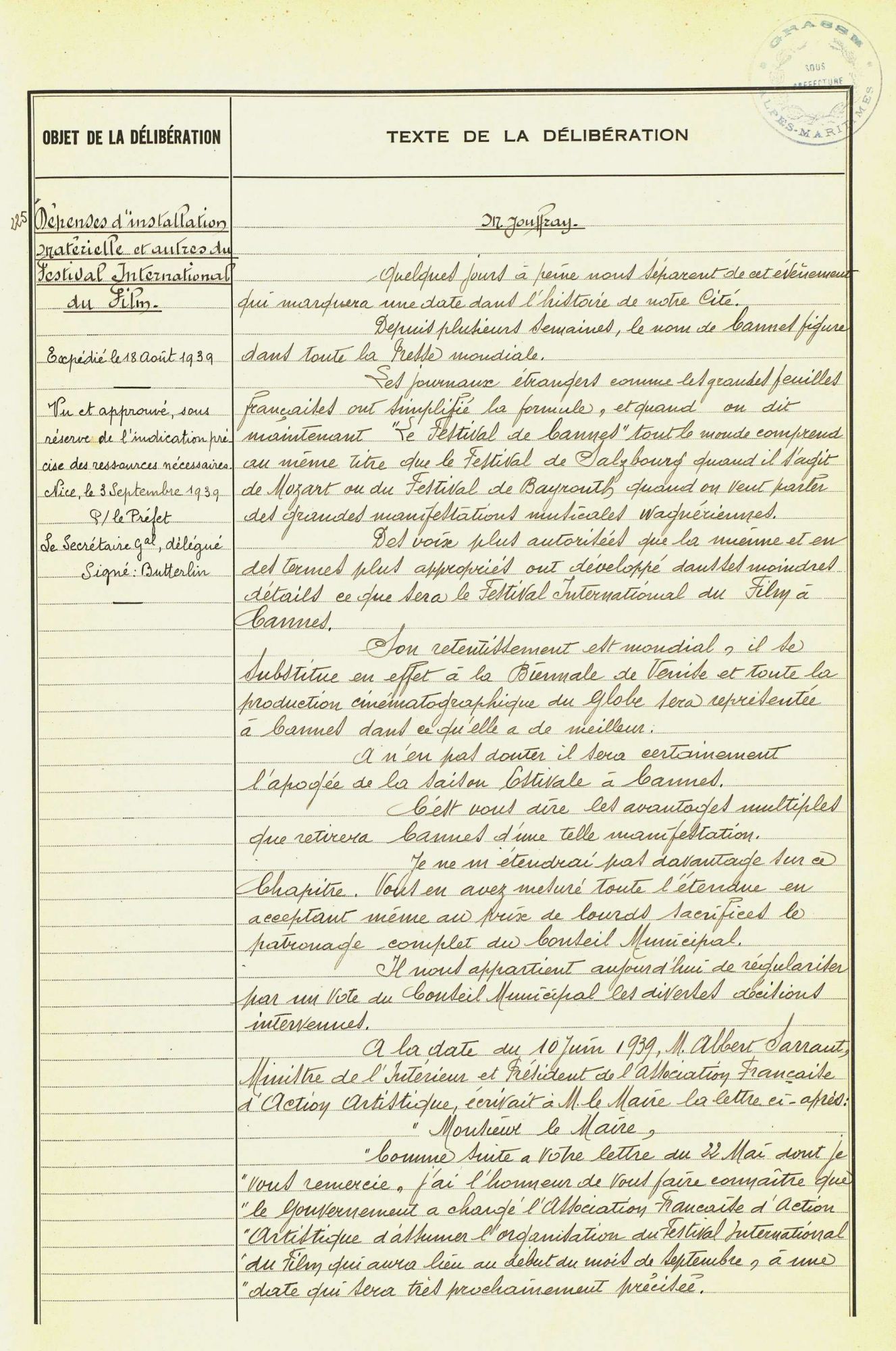 De septembre 1938 à mai 1939, la création du Festival ne concerne plus directement le cinéma : elle devient une véritable affaire d'État.