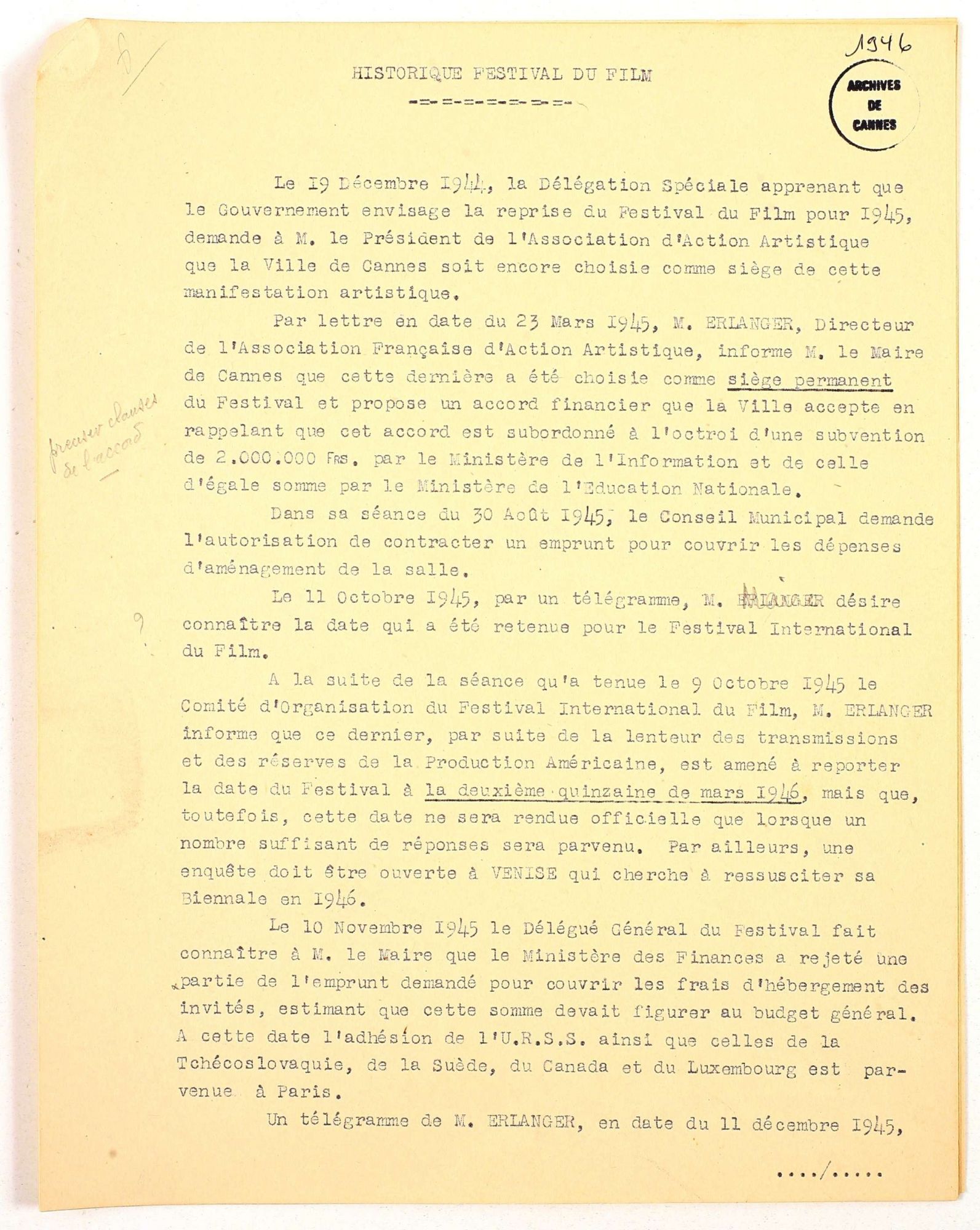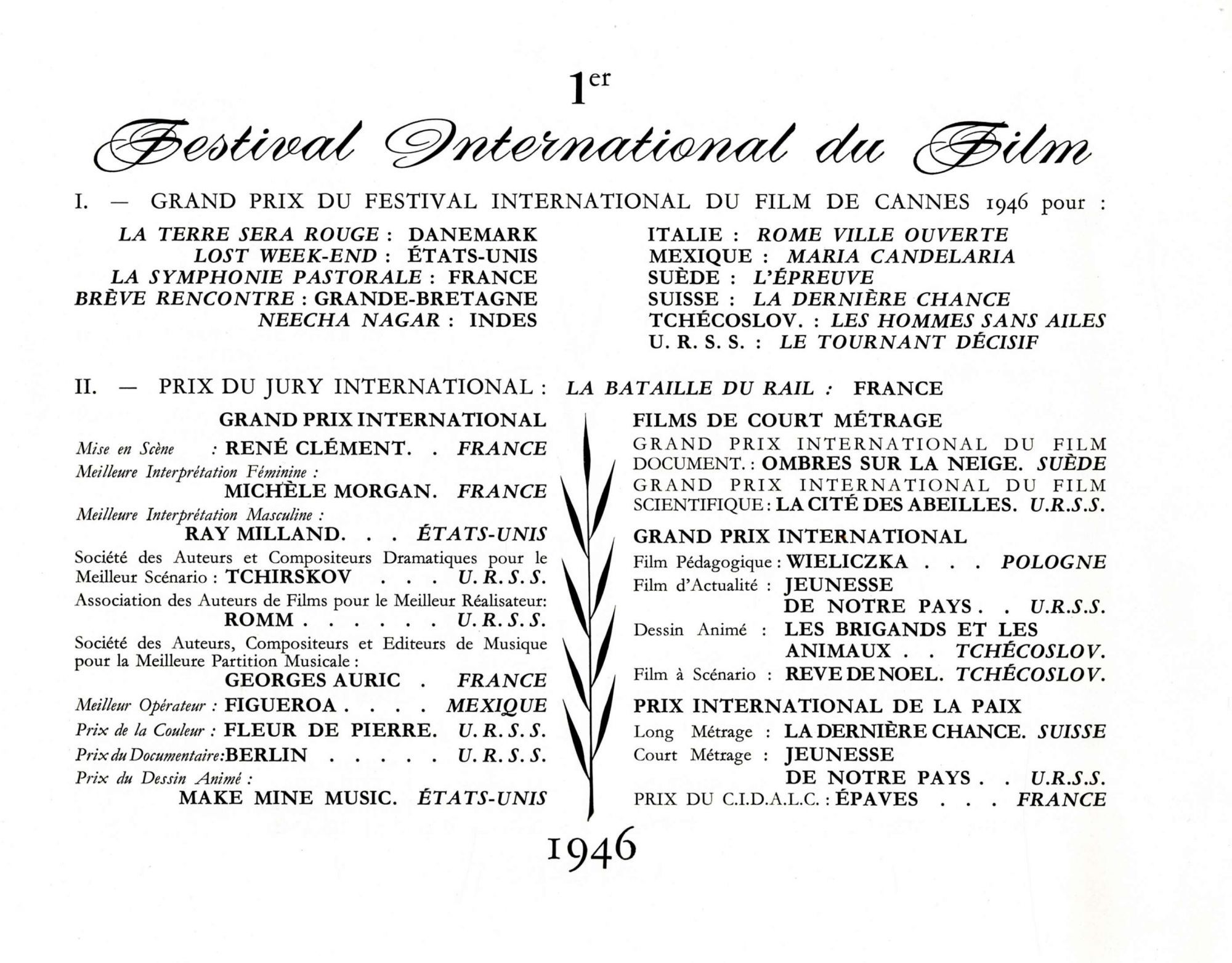 Du 20 septembre au 5 octobre 1946 : c'est la première édition effective du Festival, qui se déroule dans l'ancien Casino de Cannes.