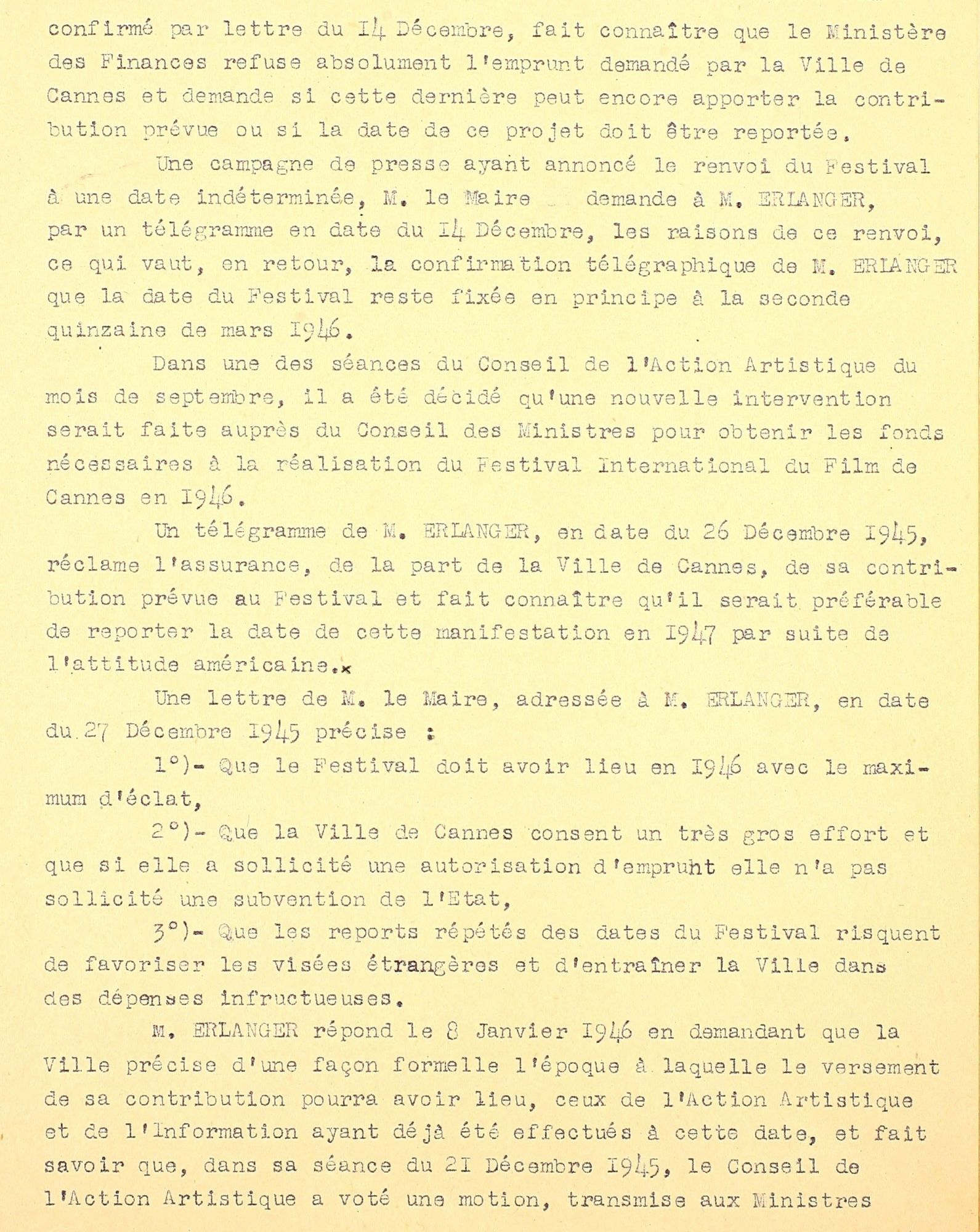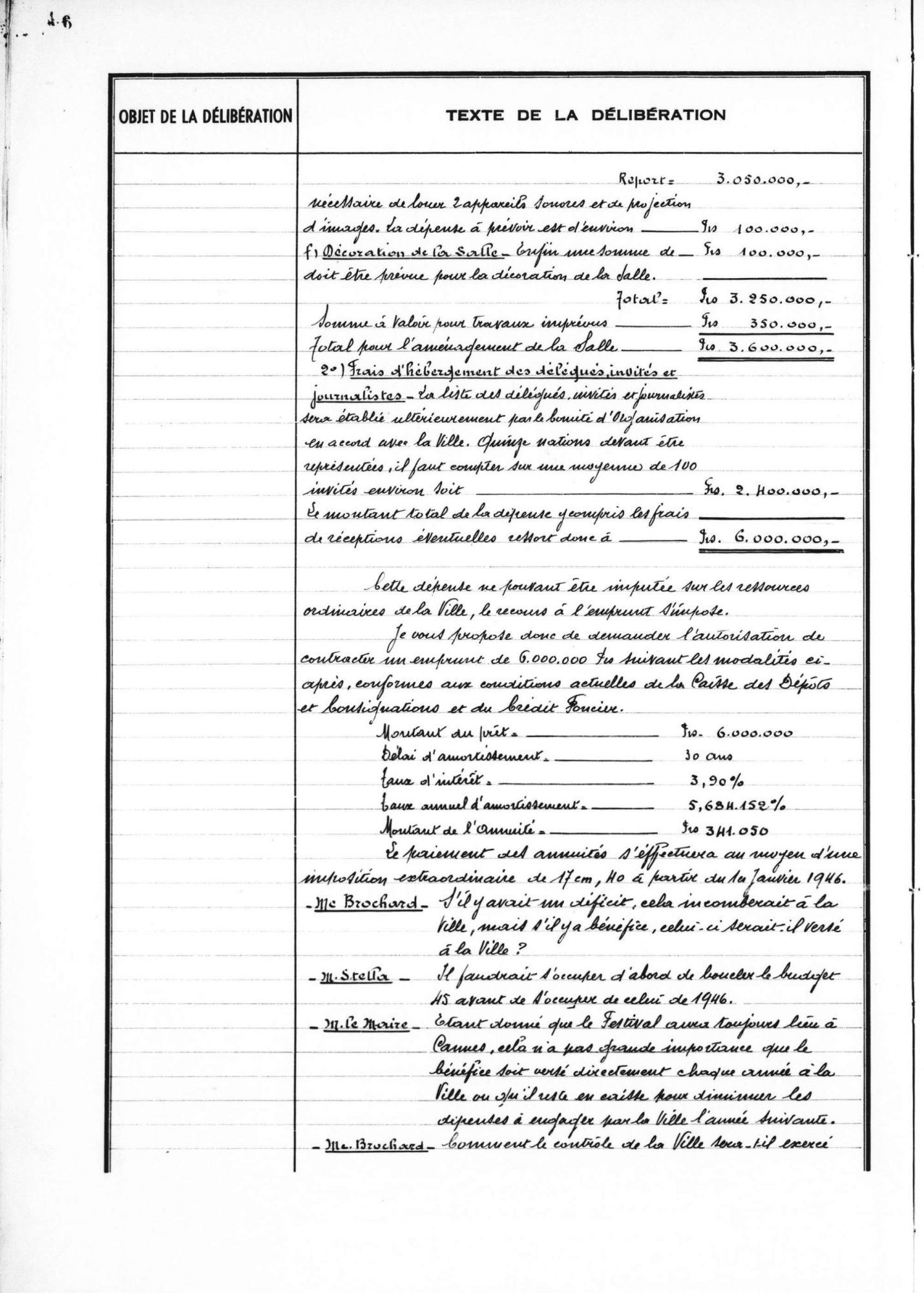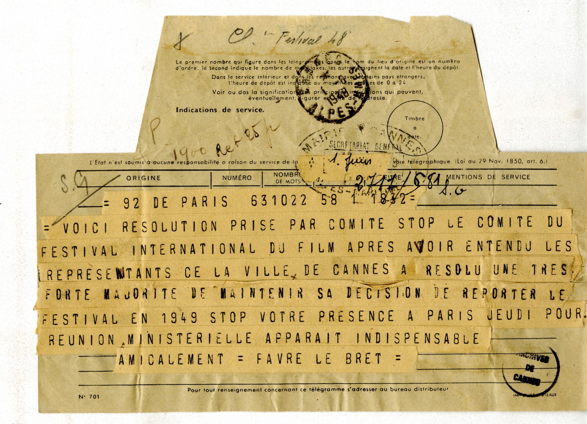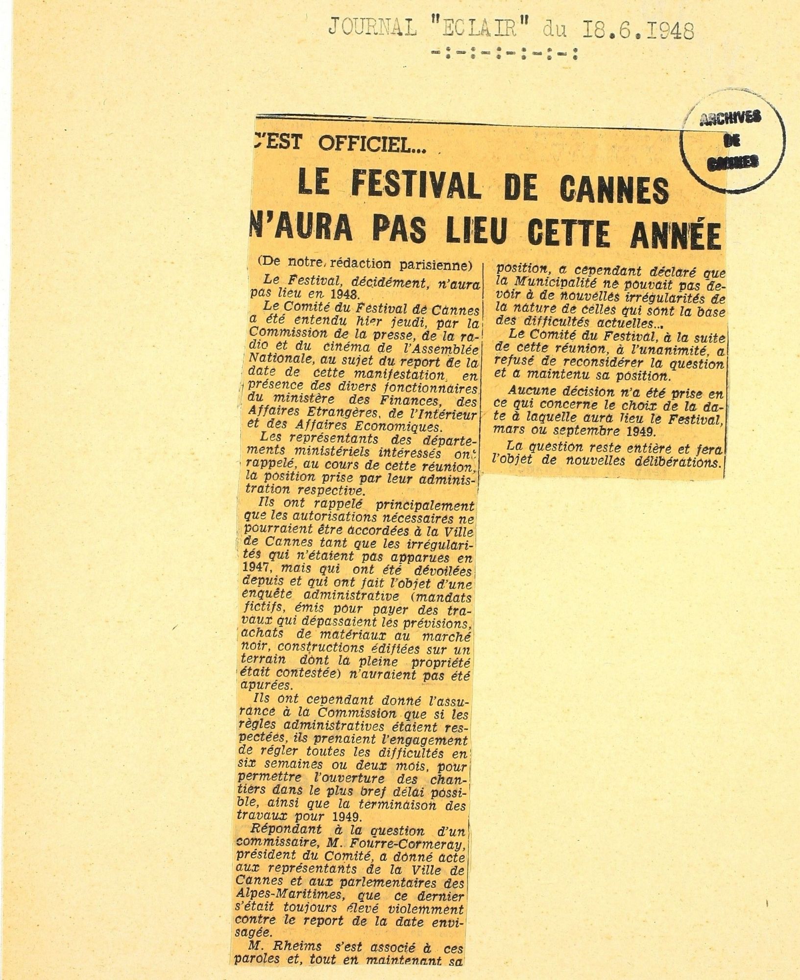 Mais les difficultés d'approvisionnement en matières premières, le chantier du Palais qui s'éternise avec un contentieux, feront annuler le festival en 1948.