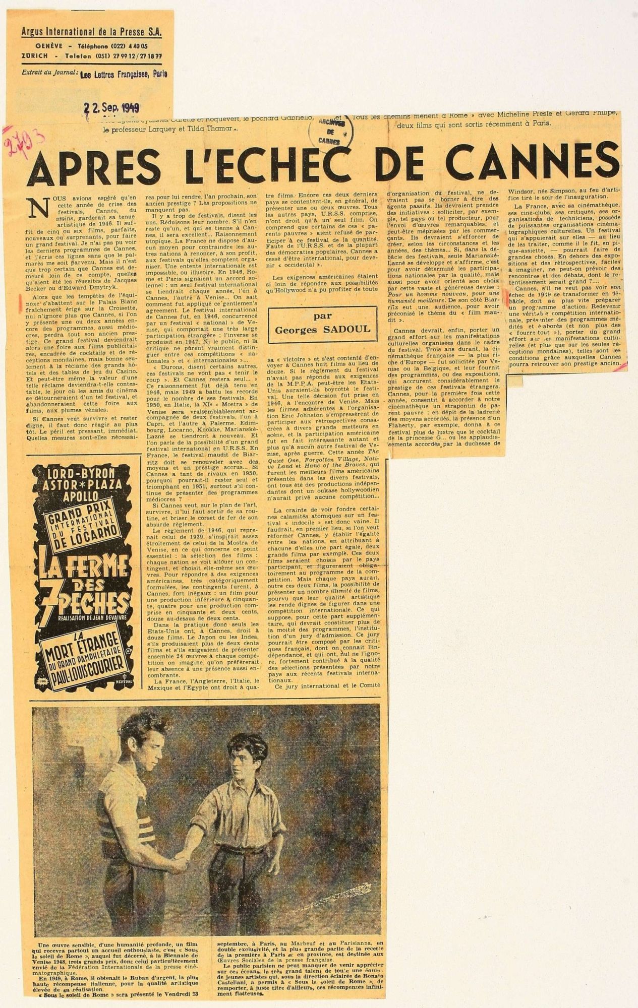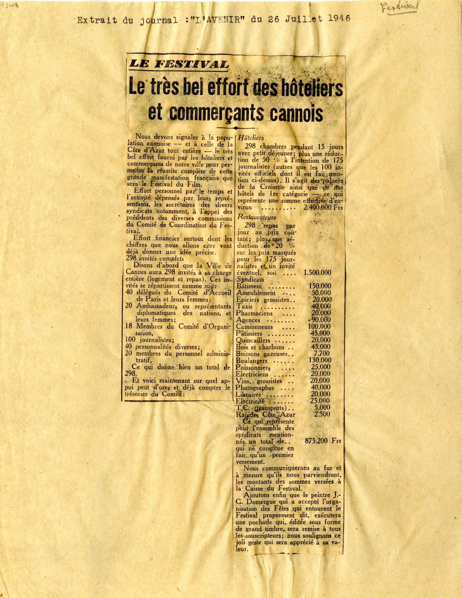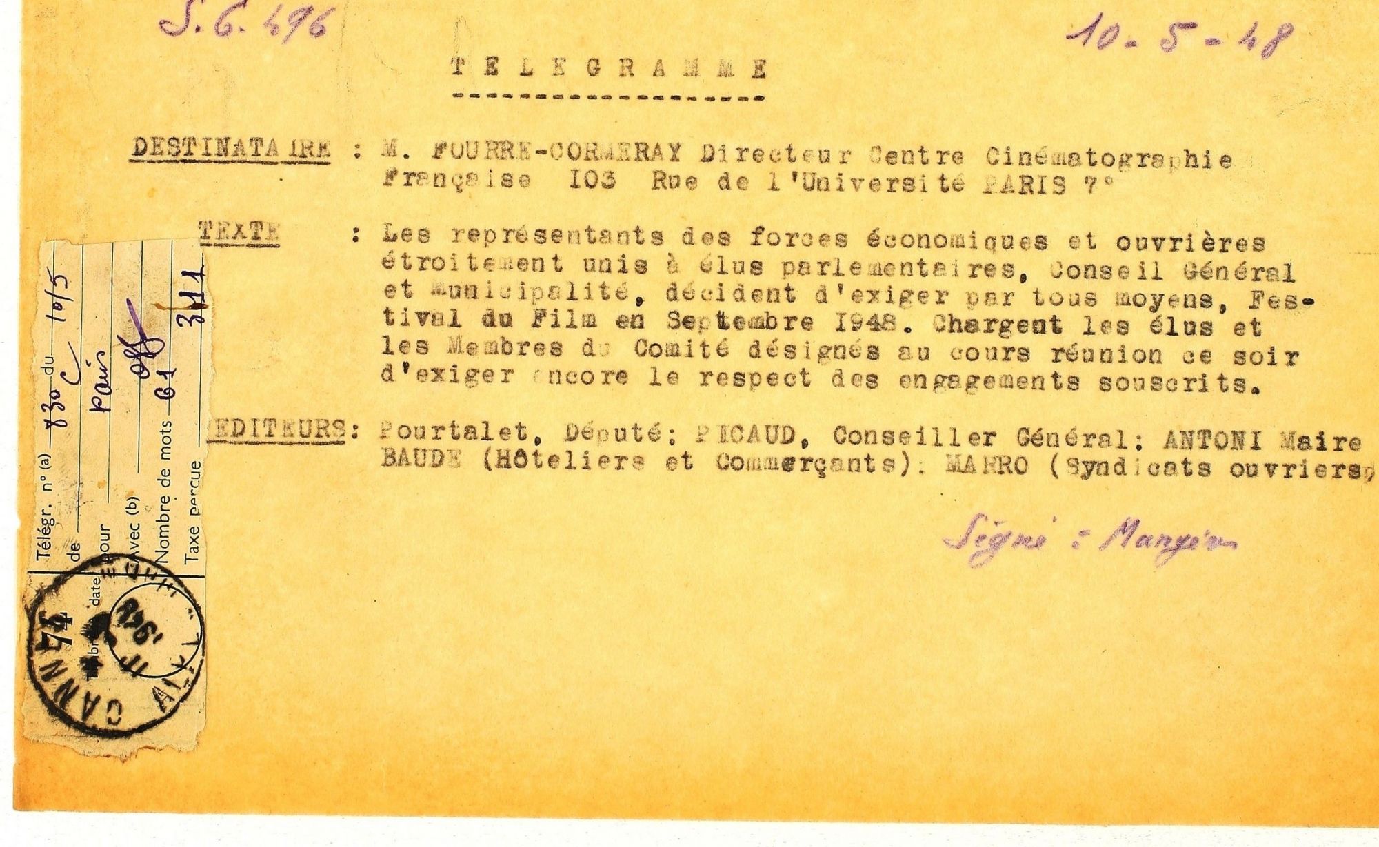 Mais les difficultés d'approvisionnement en matières premières, le chantier du Palais qui s'éternise avec un contentieux, feront annuler le festival en 1948.