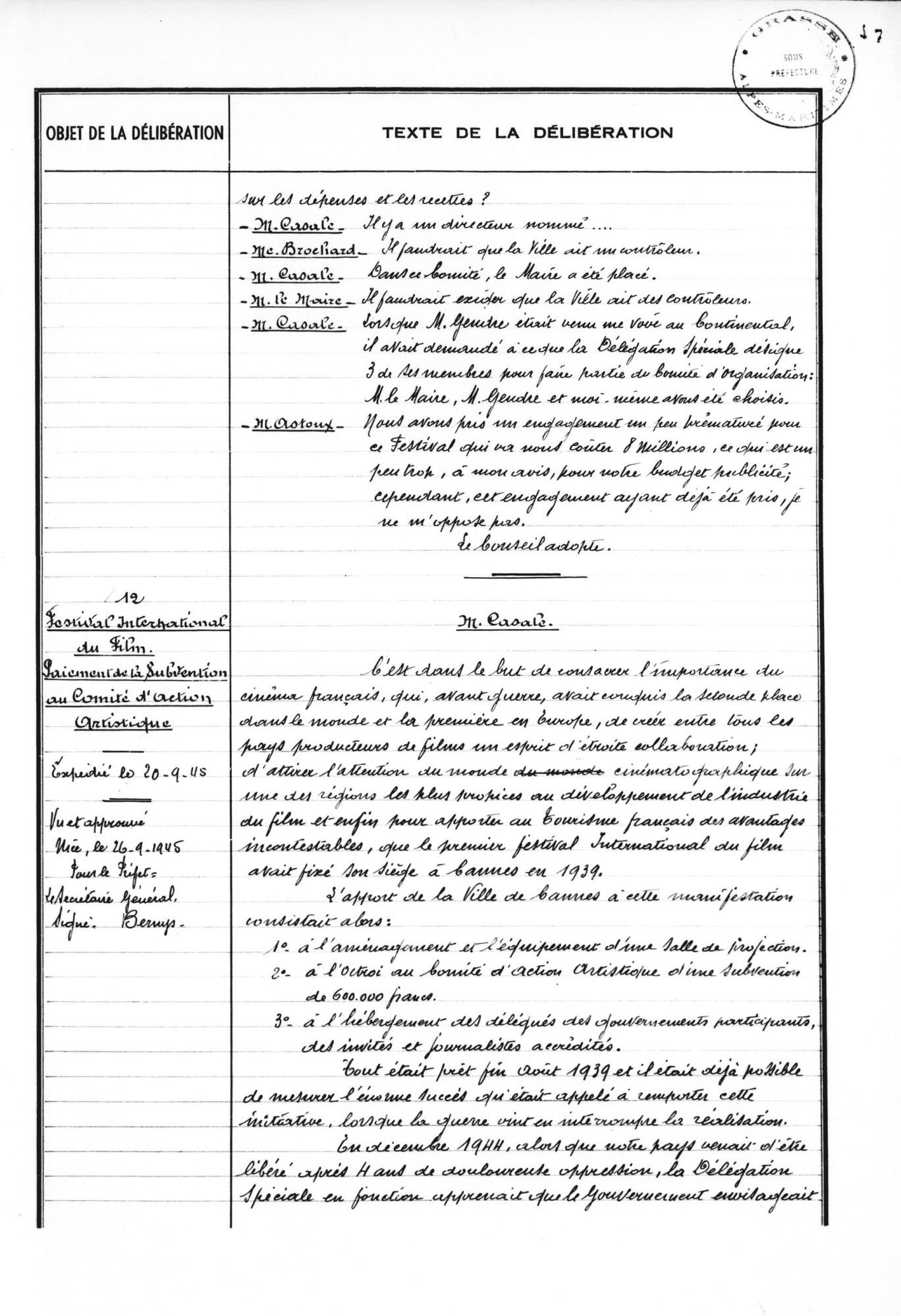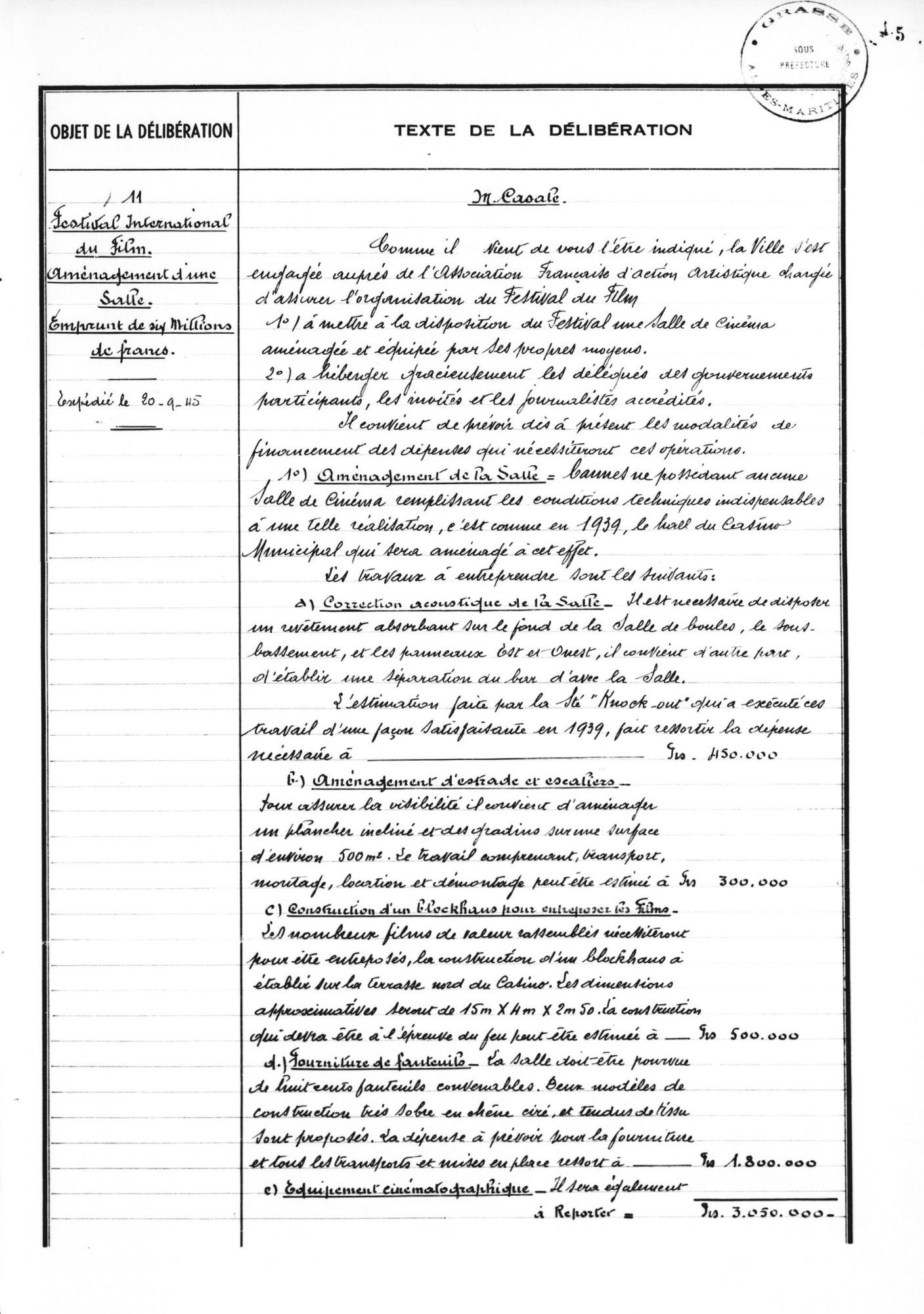 On aménage une salle de façon à accueillir davantage de places, pour les projections. La guerre a laissé de lourdes séquelles, sur les plages, sur les édifices, vu les bombardements, et les Cannois veulent les effacer au plus vite !