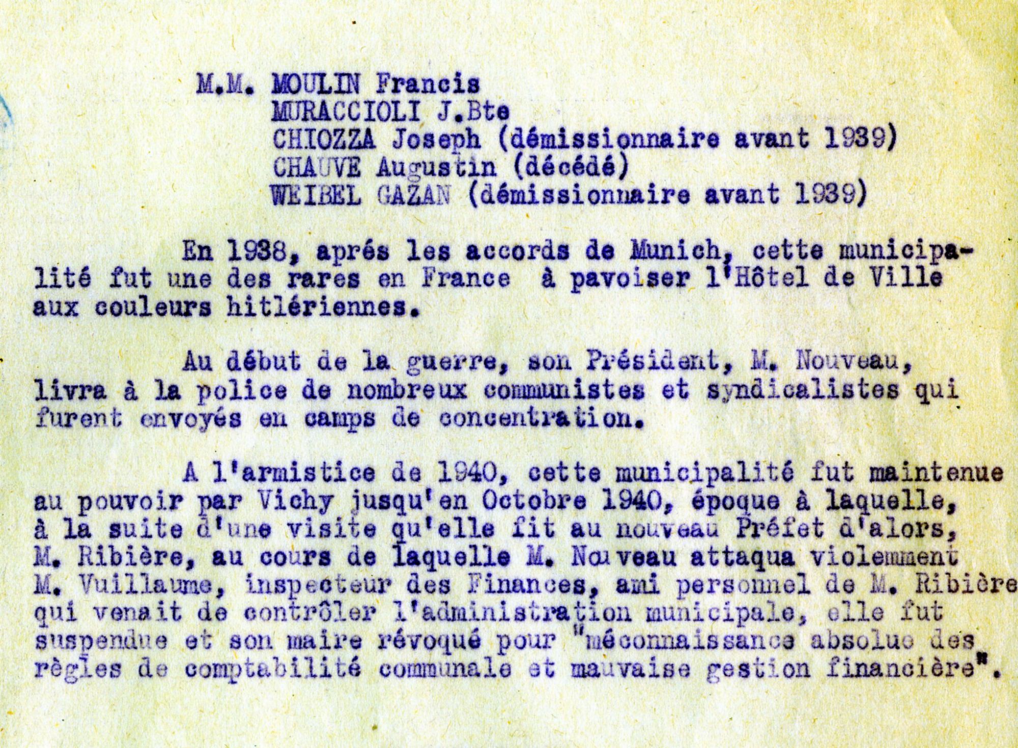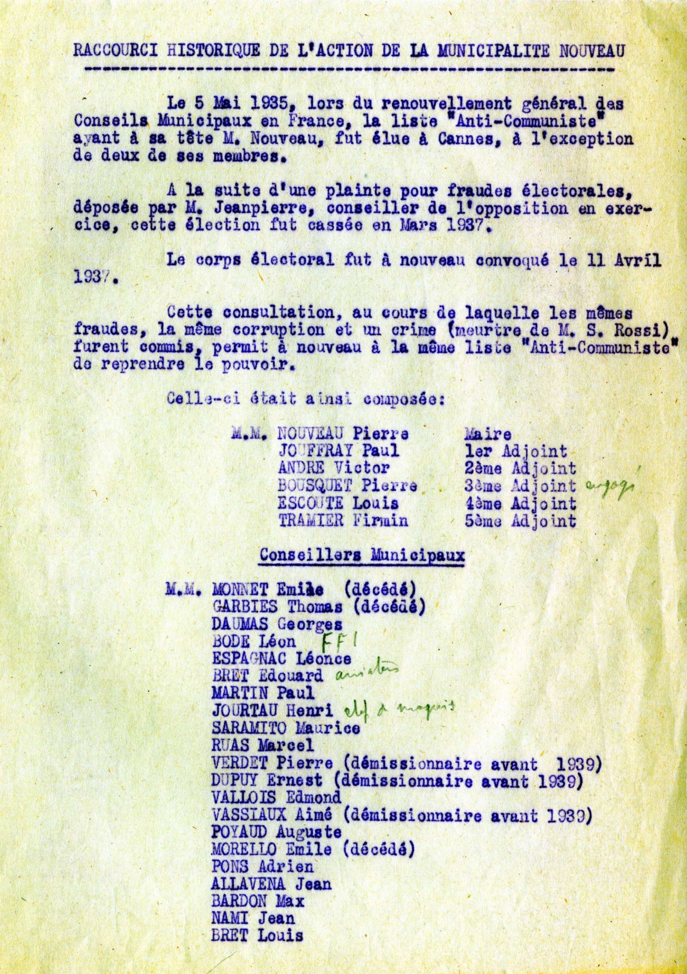 L'année 1939 à Cannes : à l'issue de la conférence de Munich, le maire Pierre Nouveau fait pavoiser l'hôtel de ville aux couleurs des nations signataires ce qui ne manque pas de choquer l'opinion, par suite de la présentation du drapeau de l'Allemagne nazie, avec la croix gammée. La presse locale est narquoise. Quelques mois plus tard, la ville rend hommage aux représentants franco-britanniques ayant signé les accords de Munich, par dénomination de places : Edouard Daladier, Neville Chamberlain sont ainsi honorés.