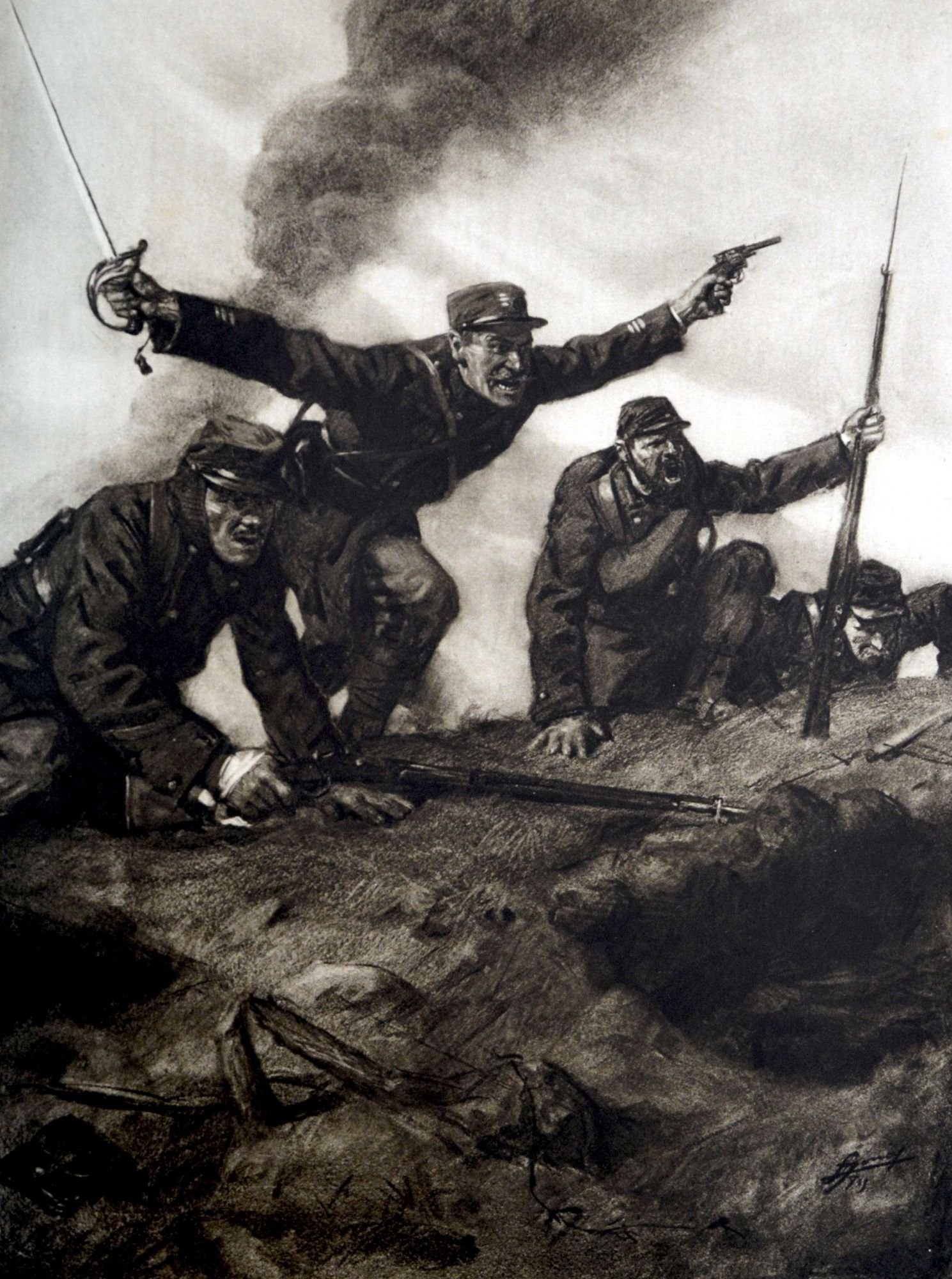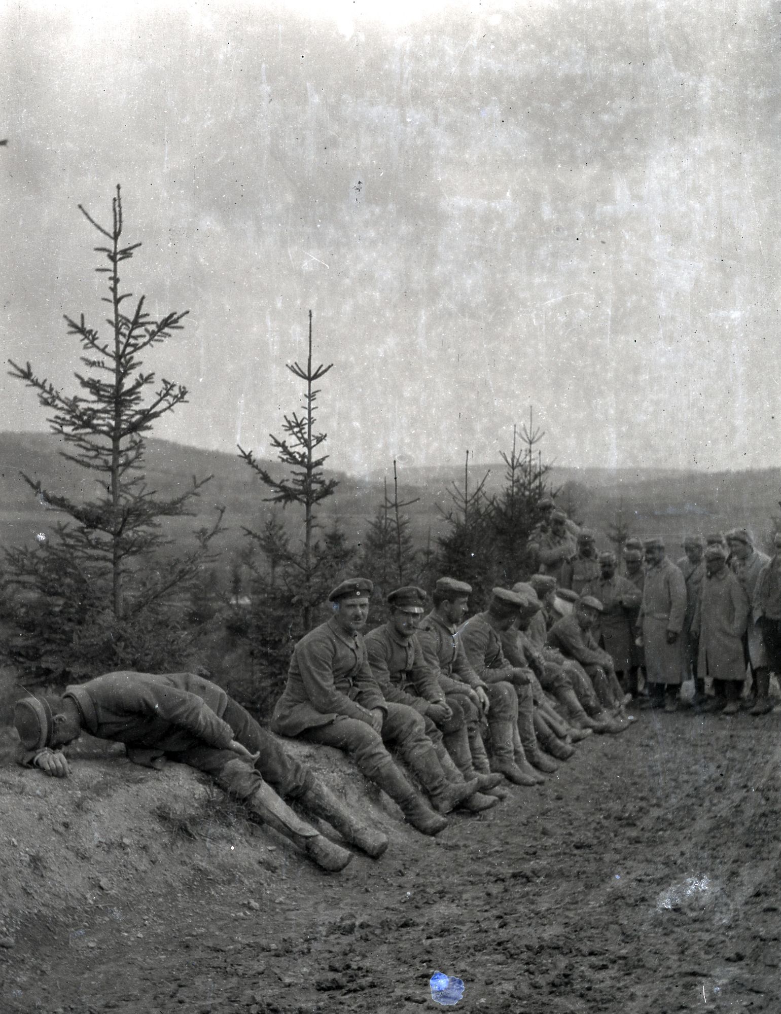 Sonorisation : "La Chanson de Craonne" - chant contestataire reprenant le nom d'un village - chanson née entre 1915 et 1917 - interdite par le commandement militaire qui la censure - contemporaine de la Révolution bolchevique qui entraîne la mutinerie de soldats, la débandade sur le front de l'Est et le retrait des alliés russes.