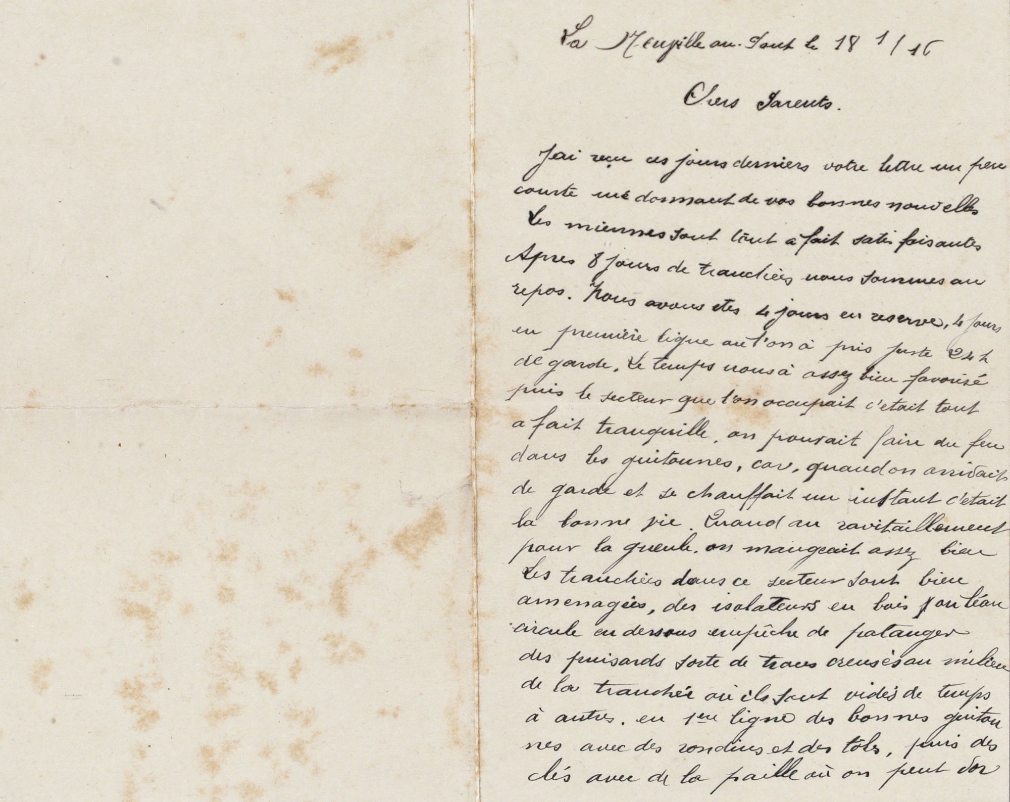 J’ai reçu ces jours-ci votre lettre un peu courte me donnant de vos nouvelles. Les miennes sont tout à fait satisfaisantes. Après 8 jours de tranchées, nous sommes au repos. Nous avons été 4 jours en réserve, 4 jours en première ligne où l’on a pris juste 24 heures de garde. Le temps nous a assez bien favorisé, puis le secteur que l’on occupait était tout à fait tranquille, on pouvait faire du feu dans les guitounes, car, quand on arrivait de garde et se chauffait un instant, c’était la bonne vie. Quant au ravitaillement, pour la gueule, on mangeait assez bien. Les tranchées dans ce secteur sont bien aménagées, des isolateurs en bois pour l’eau circule en dessous empêche de patauger, des puisards sorte de travées creusés au milieu de la tranchée où ils sont vidés de temps à autre. En 1ère lignes des bonnes guitounes avec des rondins et des tôles, puis des claies3 avec de la paille où on peut dormir à son aise. Quant aux vêtements, je n’ai pas eu froid, des gros souliers remplis de paille, une bonne peau de bique, des gants, et voilà pour se préserver du froid. Les bôches sont assez loin de nous et on n’a même pas tiré une seule cartouche en 8 jours.