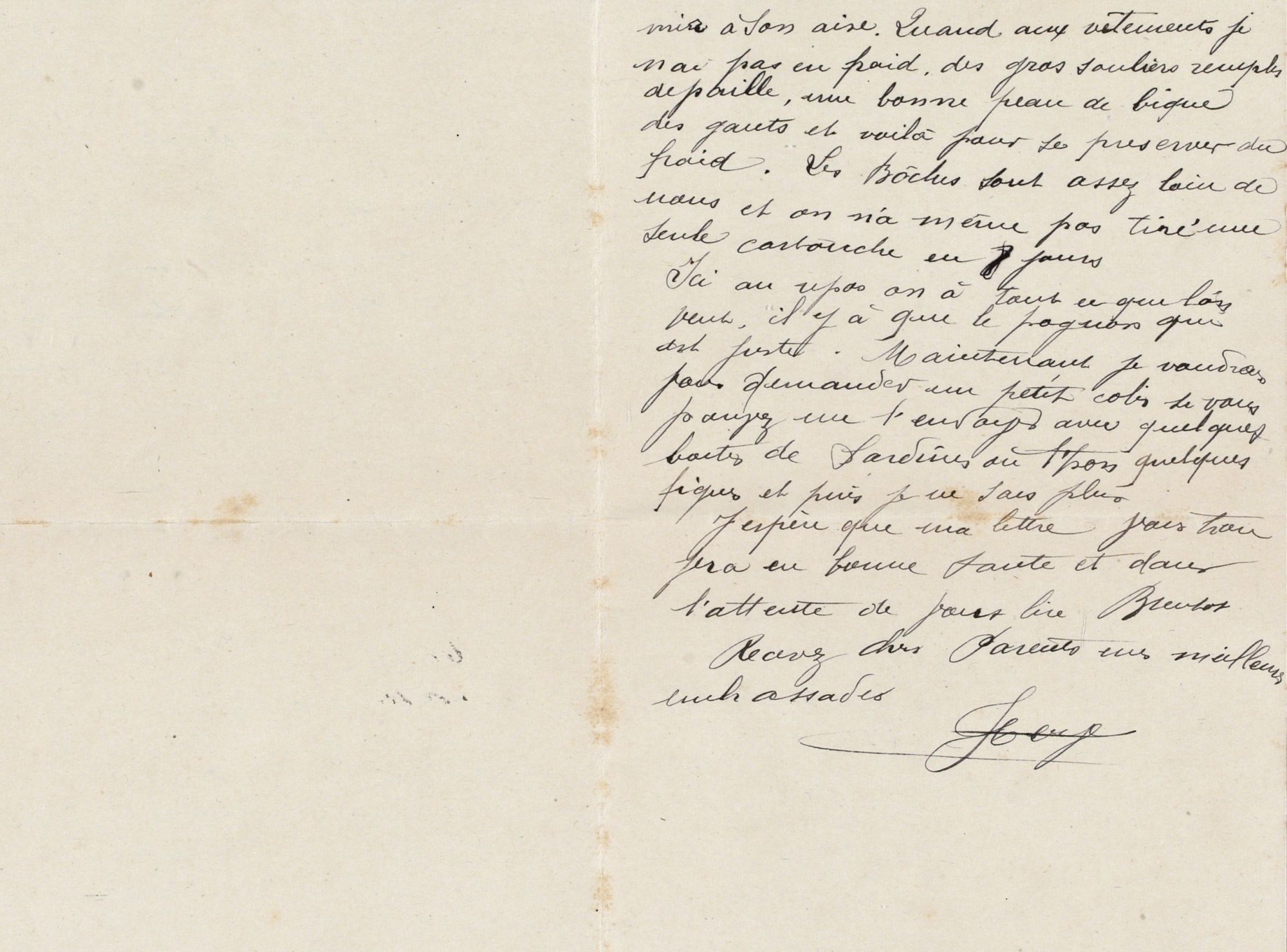 Ici au repos, on a tout ce que l’on veut. Il y a que le pognon qui est juste. Maintenant, je voudrais vous demander un petit colis, si vous pouvez me l’envoyer avec quelques boites de sardines ou thon, quelques figues et puis je ne sais plus.