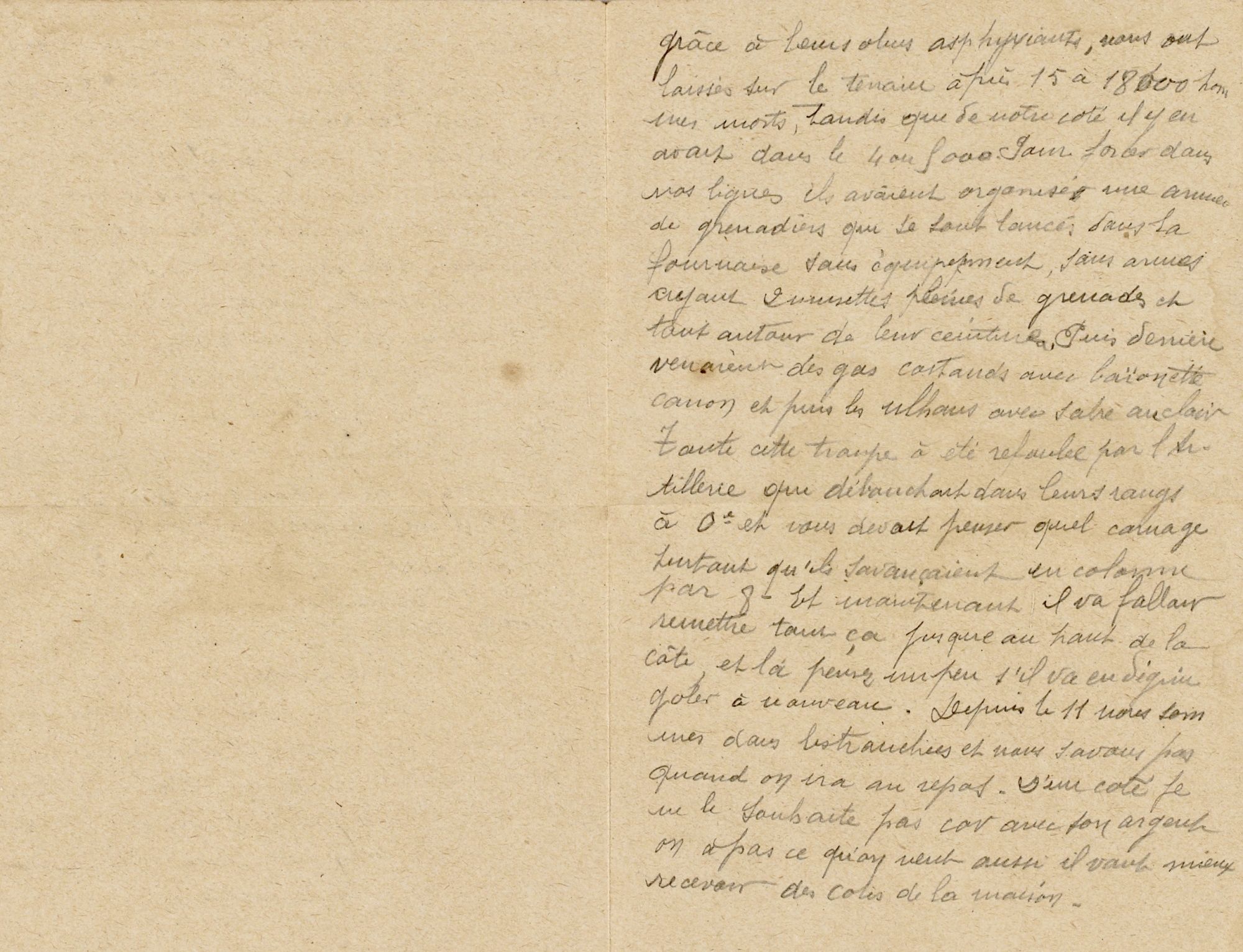 La côte 263 nous l’avons perdue à nouveau, ce qui parait que nous avons eu dans la 9e environs 3 compagnies prisonnières. Pour le 14 juillet, le jour où le Kromprintz a voulu attaquer, il nous a fait reculer de 5 km en arrière et puis pour les refouler, le 4e chasseurs à pieds à pris la pilule, le 46e et le 89e qui sont arrivés comme renfort, on les a transporté en auto, camion et ils ont débarqués bien sur la ligne de feu, même que en descendant, ils sont partis à la baïonnette. Vous devez penser si c’était terrible à voir ça. Les allemands avançant toujours grâce à leurs obus asphyxiants, nous ont laissés sur le terrain après 15 à 18 000 hommes morts, tandis que de notre côté il y en avait dans les 4 ou 5000. Pour forcer dans nos lignes, ils avaient organisé une armée de grenadiers qui se sont lancés dans la fournaise sans équipement, sans armes, ayant deux musettes pleines de grenades et tout autour de leur ceinture. Puis, derrière venait des gars costauds, avec baïonnette, canon et puis les ulhans avec sabre au clair. Toute cette troupe a été refoulée par l’artillerie qui débauche dans leurs rangs à zéro et vous devez penser quel carnage, surtout qu’ils s’avançaient en colonne par 8. Et maintenant il va falloir remettre tout ça jusque au haut de la côte et là, pensez un peu s’il va en dégringoler à nouveau. Depuis le 11, nous sommes dans les tranchées et nous savons pas quand on ira au repos. D’un côté, je ne le souhaite pas car avec son argent, on a pas ce qu’on veut, aussi il vaut mieux recevoir des colis de la maison.