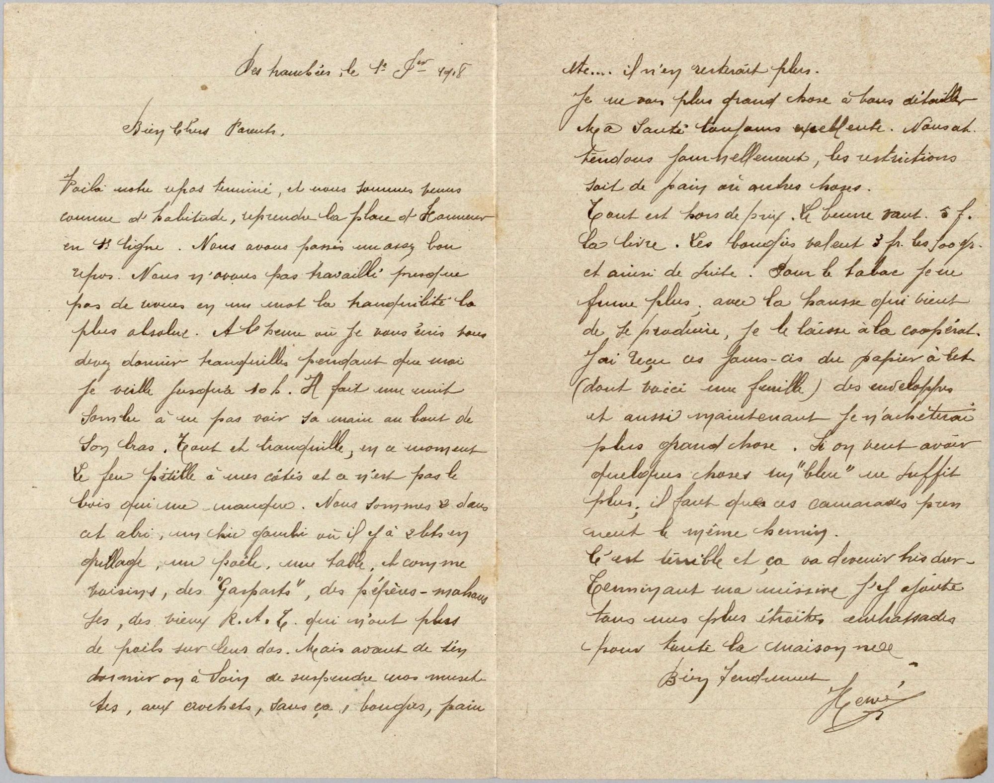 Je ne vois plus grand-chose à vous détailler. Ma santé toujours excellente. Nous attendons journellement les restrictions soit de pain ou autres choses.