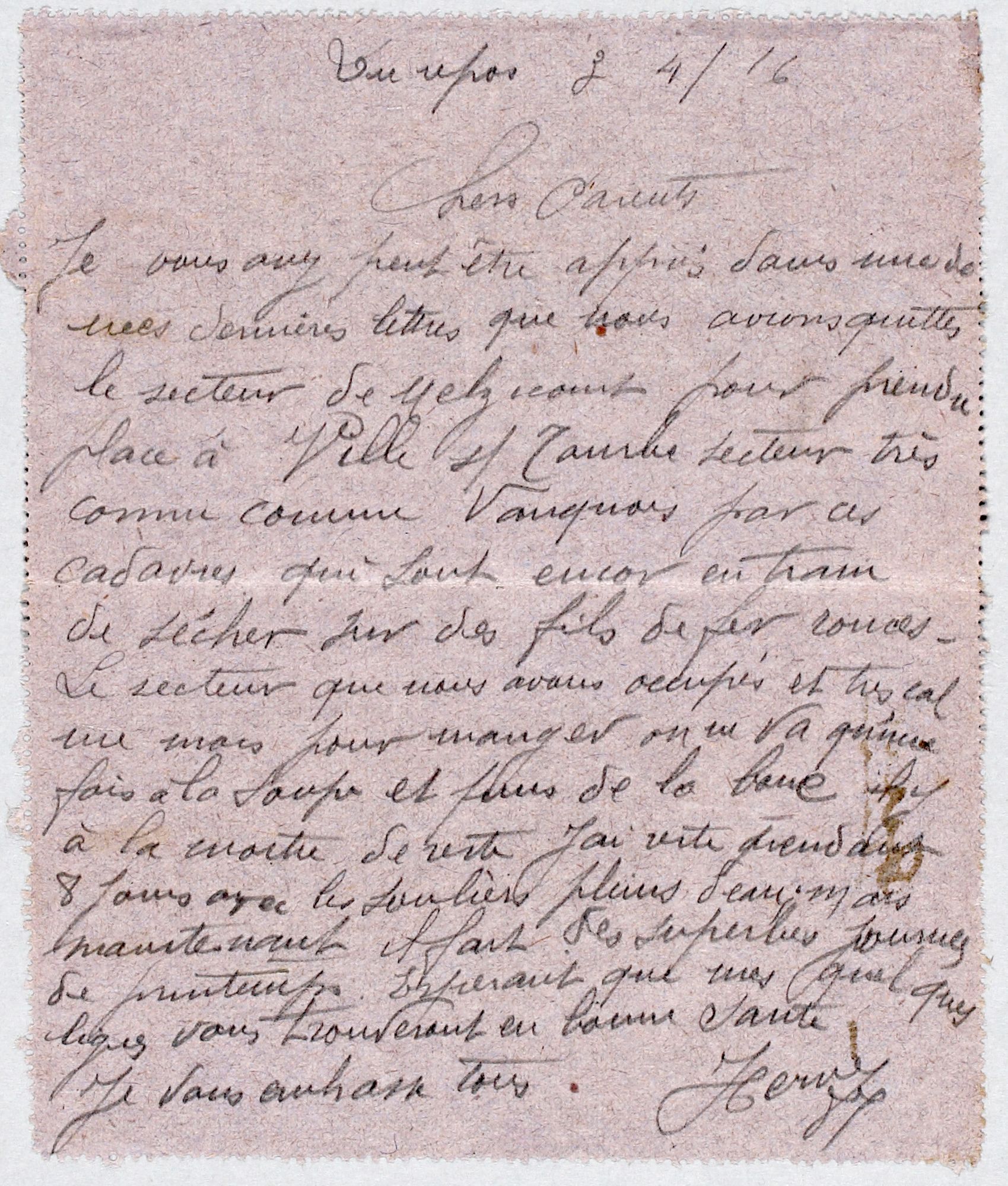 Le secteur que nous avons occupé est très calme mais pour manger, on ne va qu’une fois à la soupe et puis de la boue il y à la moitié de rester. J’ai resté pendant 8 jours avec les souliers pleins d’eau mais maintenant, il fait des superbes journées de printemps. Espérant que mes quelques lignes vous trouveront en bonne santé, je vous embrasse tous.