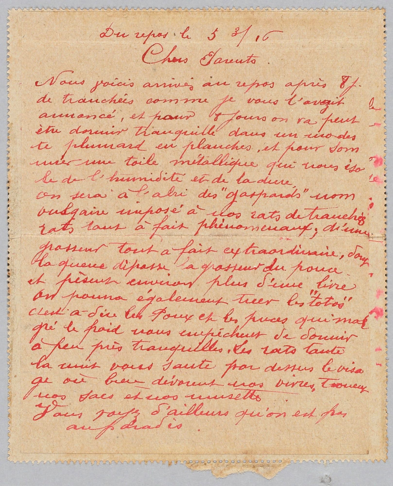 On sera à l’abri des « gaspards », nom vulgaire imposé à nos rats de tranchées, rats tout à fait phénoménaux, d’une grosseur tout à fait extraordinaire dont la queue dépasse la grosseur du pouce et pèsent environs plus d’une livre. On pourra également tuer les « totos », c’est –à-dire les poux et les puces qui malgré le froid nous empêchent de dormir à peu près tranquilles. Les rats toute la nuit vous sautent par-dessus le visage ou bien dévorent nos vivres, trouent nos sacs et nos musettes.
