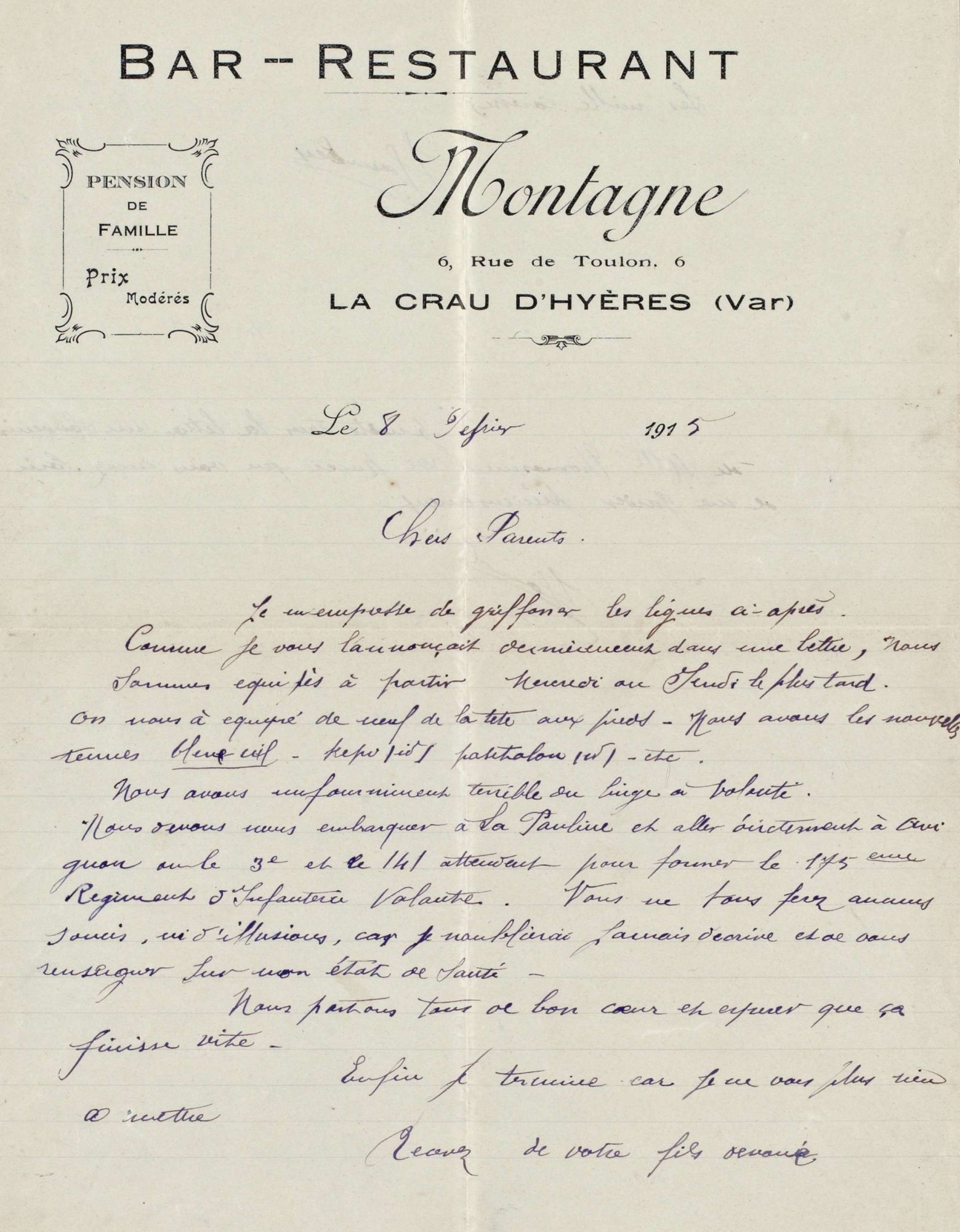 Nous avons un fourniment terrible, du linge à volonté. Nous devons nous embarquer à la Pauline et aller directement à Avignon ou le 3e et le 141e attendent pour former le 175ème régiment d’infanterie volante. Vous ne vous ferez aucuns soucis, ni d’illusions, car je n’oublierai jamais d’écrire et de vous renseigner sur mon état de santé.