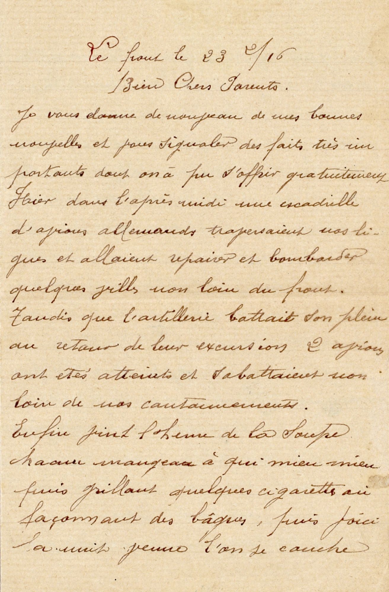 Je vous donne de nouveau de mes bonnes nouvelles et pour signaler des faits très importants dont on a pu s’offrir gratuitement. Hier, dans l’après-midi une escadrille d’avions allemands traversaient nos lignes et allaient repérer et bombarder quelques villes non loin du front. Tandis que l’artillerie battait son plein au retour de leur excusions, 2 avions ont étés atteints et s’abattaient non loin de nos cantonnements.