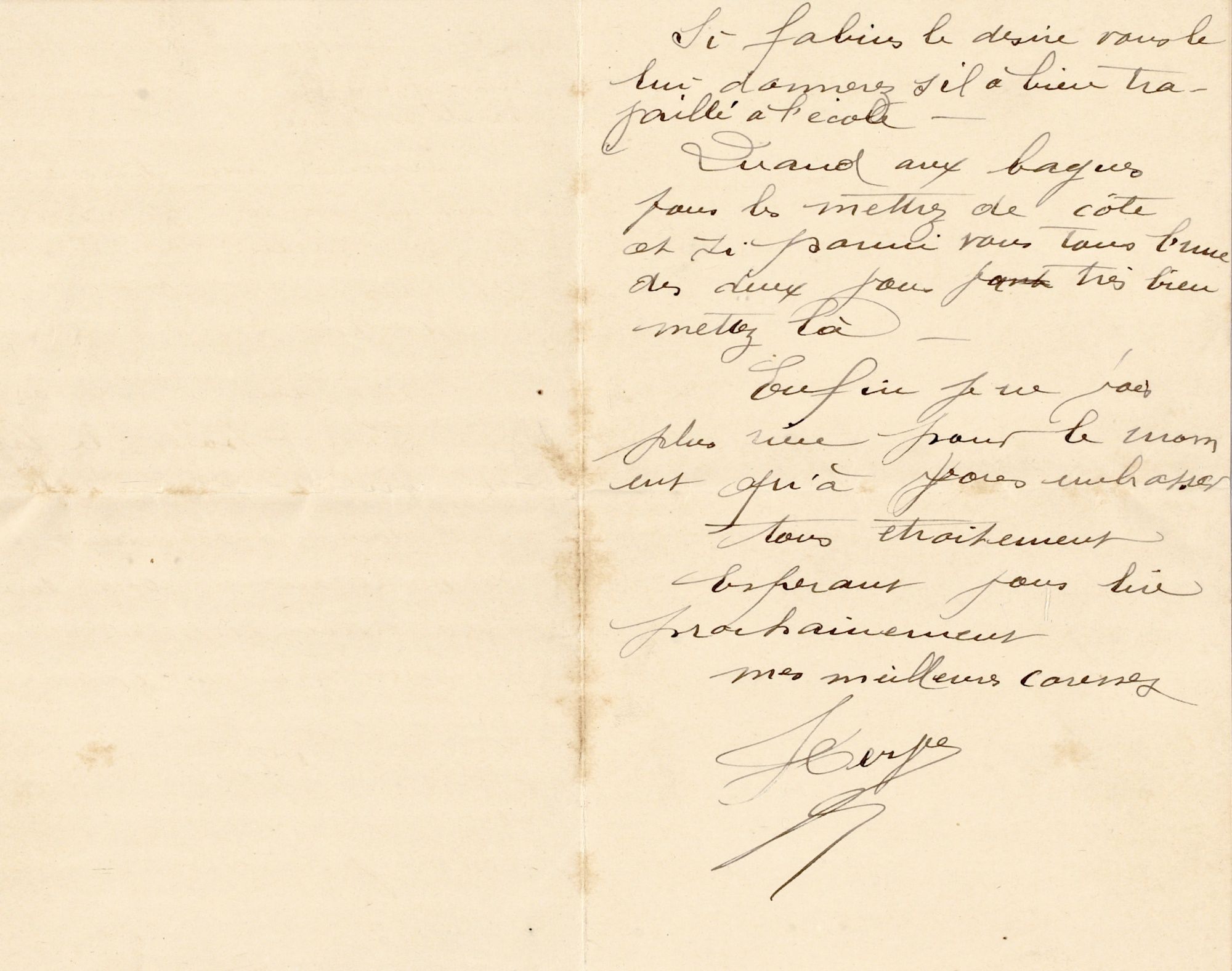 Enfin, je ne vois plus rien pour le moment qu’à nous embrasser tous étroitement, espérant vous lire prochainement, mes meilleures caresses.