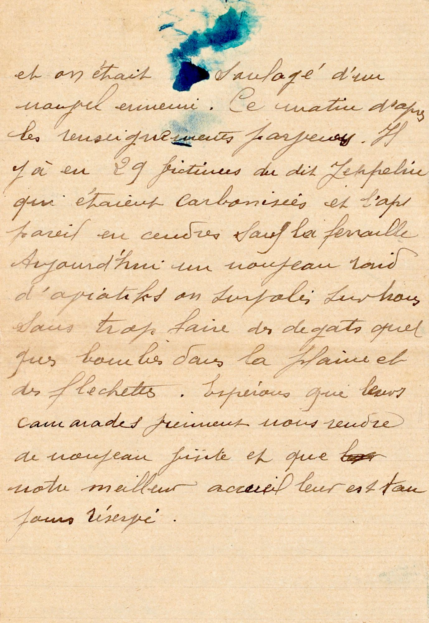 C’était notre monstre aérien qui atteint par un obus et une fusée avait pris feu. On pousse tous en chœur un bravo, et on était soulagé d’un nouvel ennemi. Ce matin, d’après les renseignements parvenus, il y a eu 29 victimes du dit zeppelin qui étaient carbonisées et l’appareil en cendre sauf la ferraille.