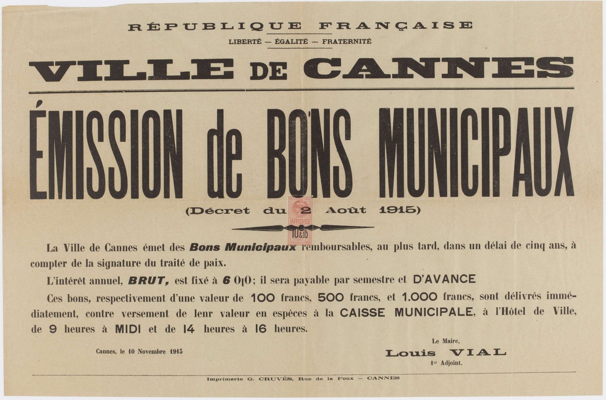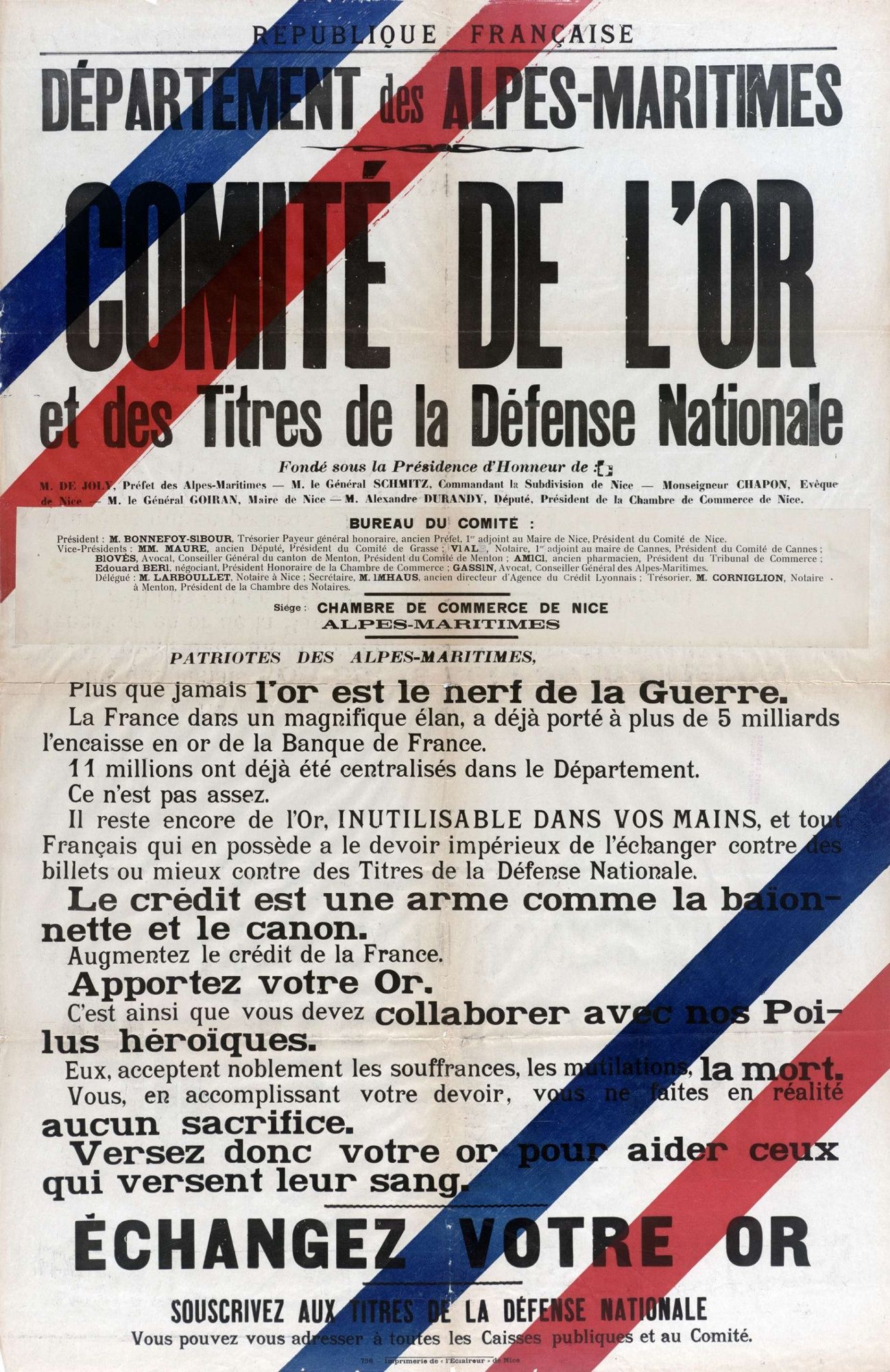 Le maire intérimaire, Louis Vial, demande aux Cannois fortunés d’échanger leur or contre des billets de la Banque de France, pour obtenir des munitions et les approvisionnements qui sont nécessaires à la France. Des bons seront émis par la commune.