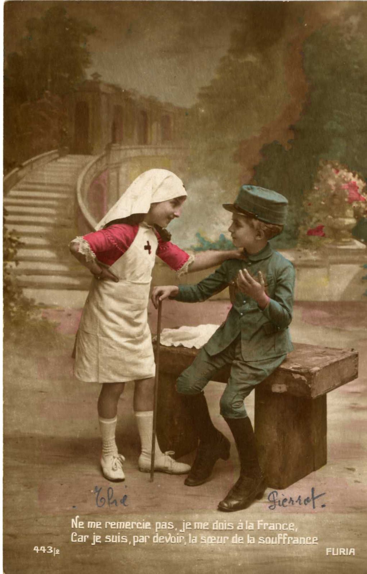 - Infirmières bénévoles, volontaires pour les plus riches familles, dans les hôpitaux temporaires afin de soigner les blessés venant du front. L’infirmière, dont l’habit blanc est synonyme de pureté, est censée guérir les corps et les âmes. Elle accompagne l’action des médecins tout en consolant les blessés.