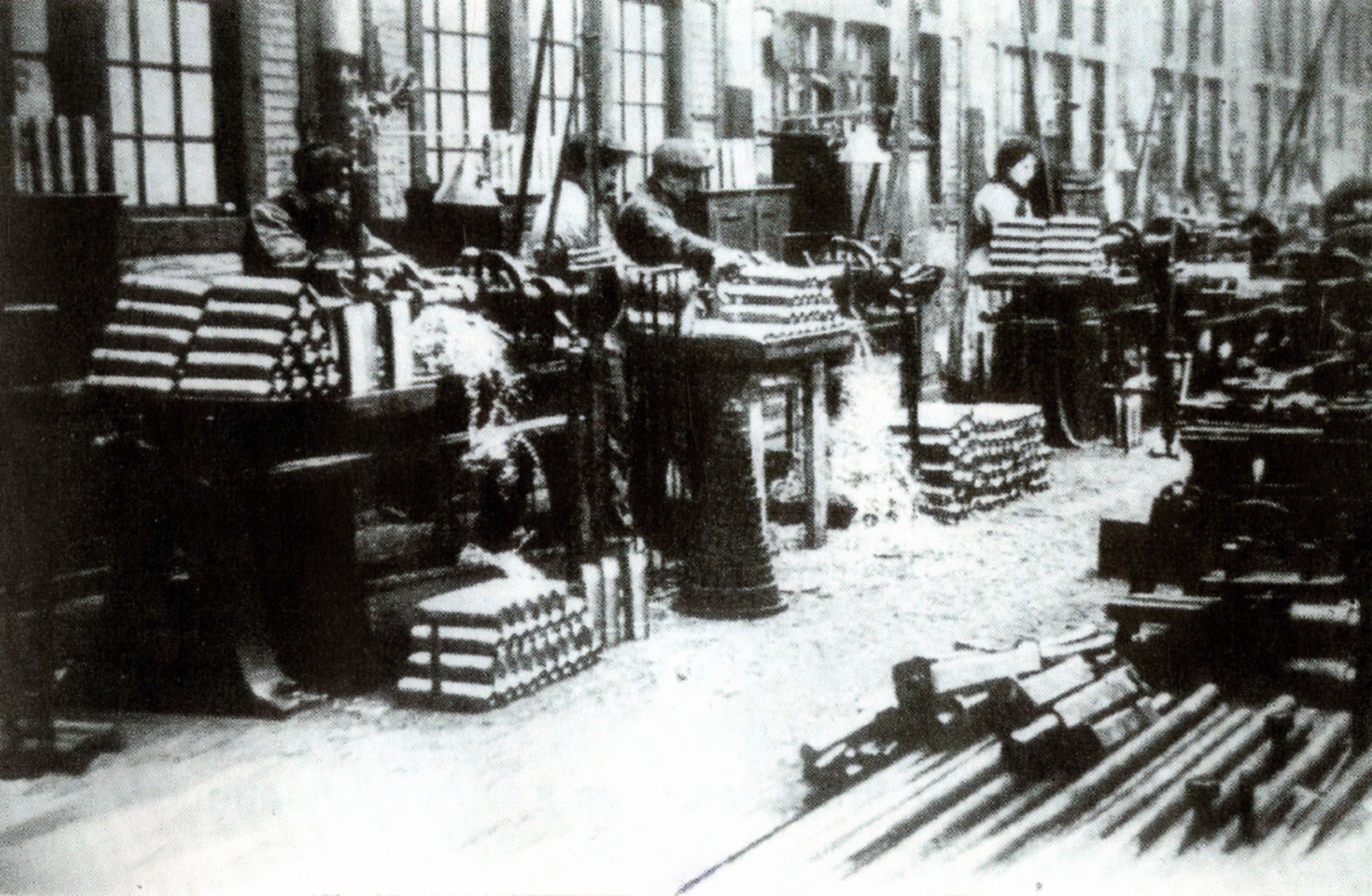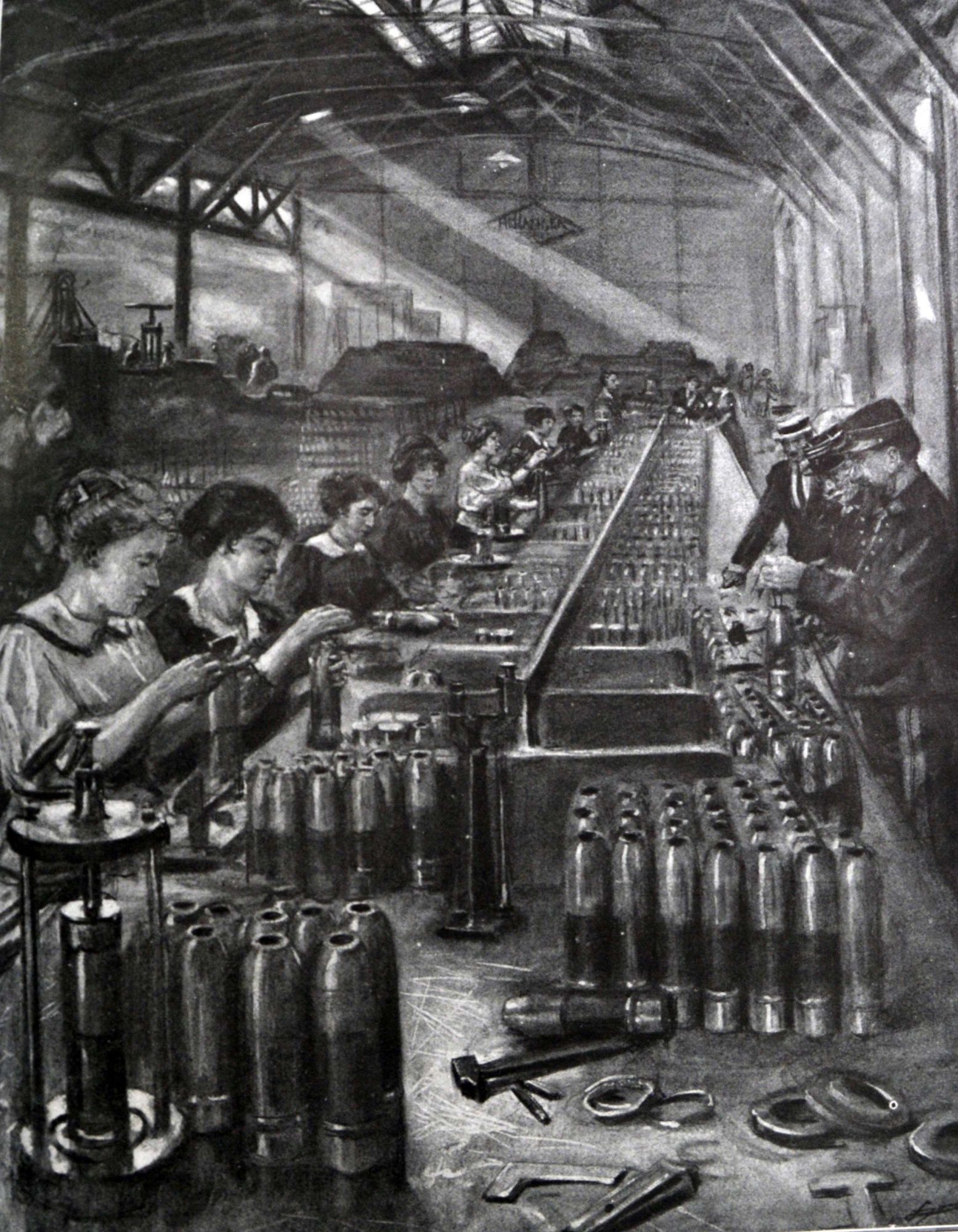 - Ouvrières dans les usines à la place de leurs époux pour continuer la production notamment dans les ateliers de fabrication d’obus de 75. D’octobre 1914 à juin 1916, la production d’obus passa de 4000 à 151 000 par jour. Ces ouvrières prennent le nom de « munitionnettes ».