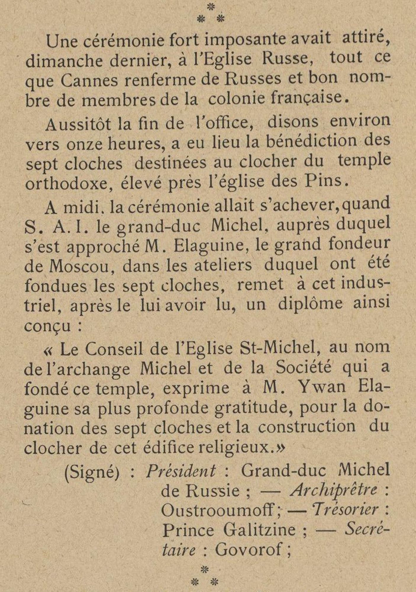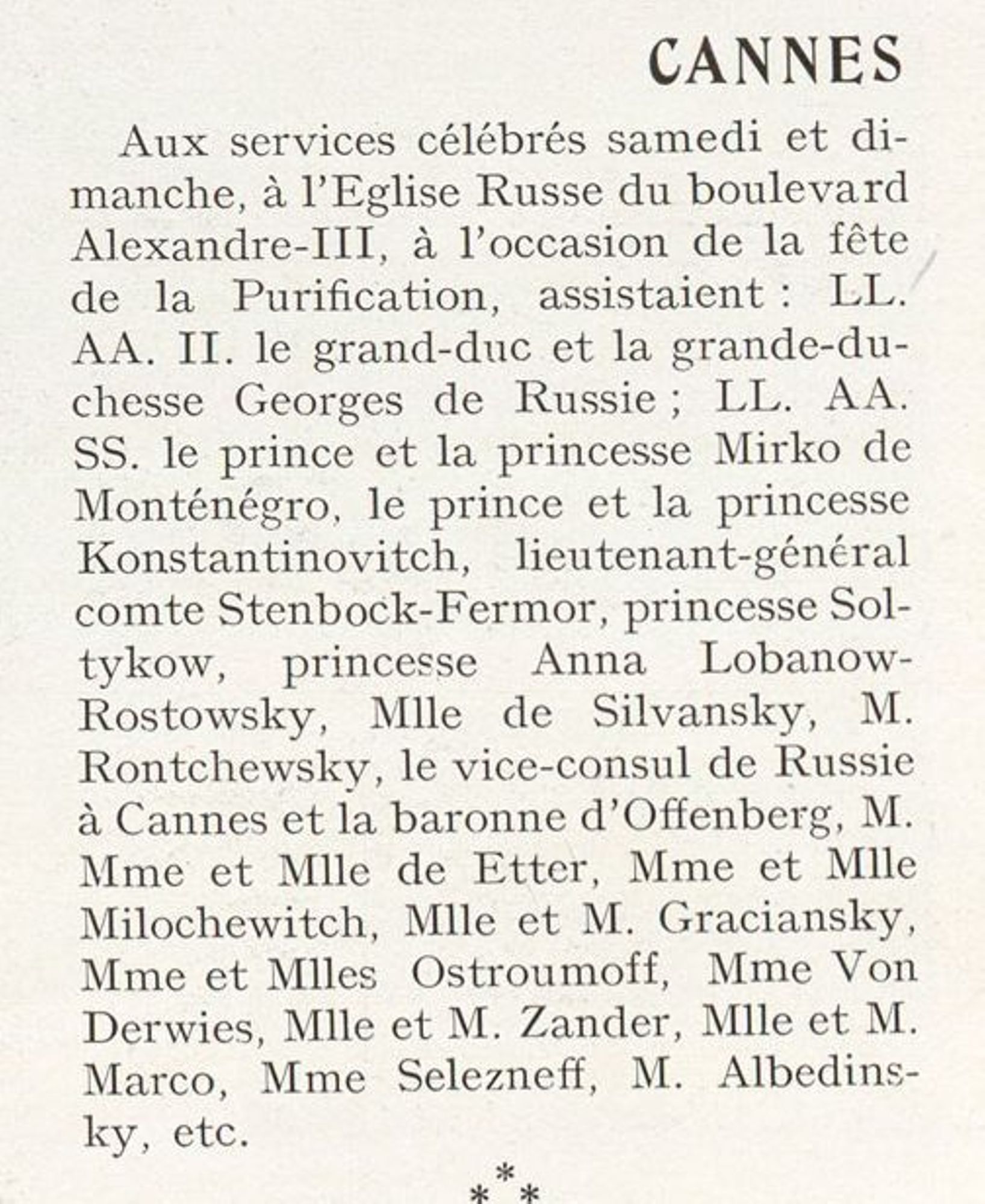 En 1894, l'église russe Saint-Michel-l'Archange est ouverte au culte. Elle abritera des mariages fastueux, réunira de grands familles du monde orthodoxe, et des cérémonies funèbres. S'y retrouvent les grands-ducs de Russie et leurs femmes, un membre éminent de Roumanie, des ressortissants de la Grèce, des princes du Monténégro. Mariages et enterrements se succèdent dans cette communauté accueillante aux étrangers. Des tombes sont encore présentes dans la crypte de l'église.