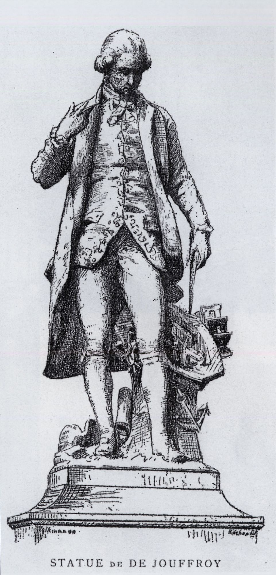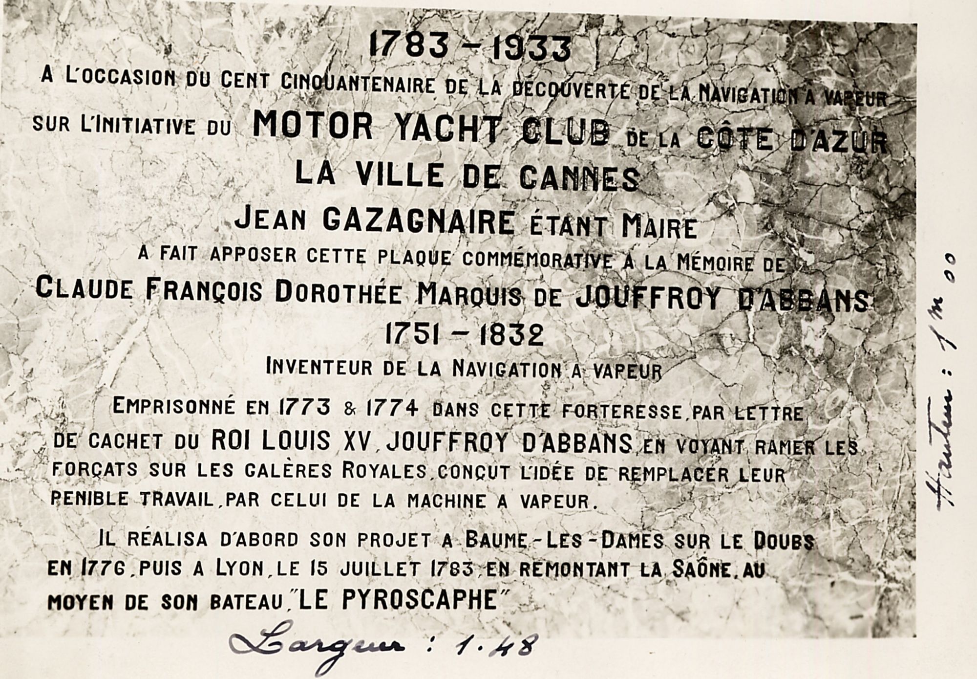 "Dès sa jeunesse Jouffroy d’Abbans s’intéresse à la mécanique et aux machines à vapeur. Jeune officier, il est emprisonné en 1772 aux îles de Lérins (Fort Sainte-Marguerite) après une querelle avec un supérieur. Il met son enfermement à profit pour étudier les sciences. Libéré en 1774, il monte à Paris et collabore avec les frères Périer à un projet de machine à propulser les navires.