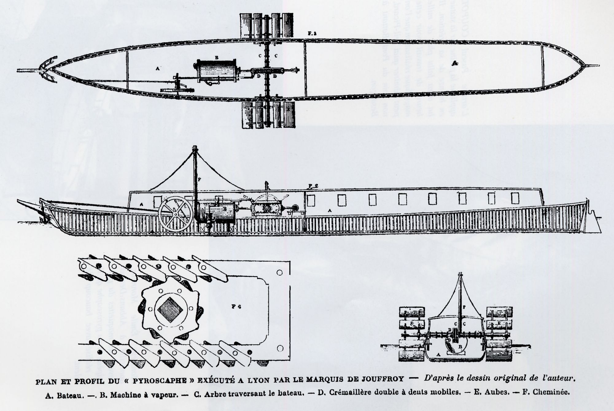 Il rentre à Abbans en 1778 où il élabore une nouvelle machine ; des rames articulées, mues par un moteur à vapeur, propulsent une barque. Il poursuit ses expériences et en 1783 lance sur la Saône le Pyroscaphe, long de 46 m, dont les roues à aubes sont actionnées par une machine à deux cylindres. Incompris de ces contemporains, il émigre durant la Terreur. Rentré en 1795, il refuse de travailler pour Napoléon.