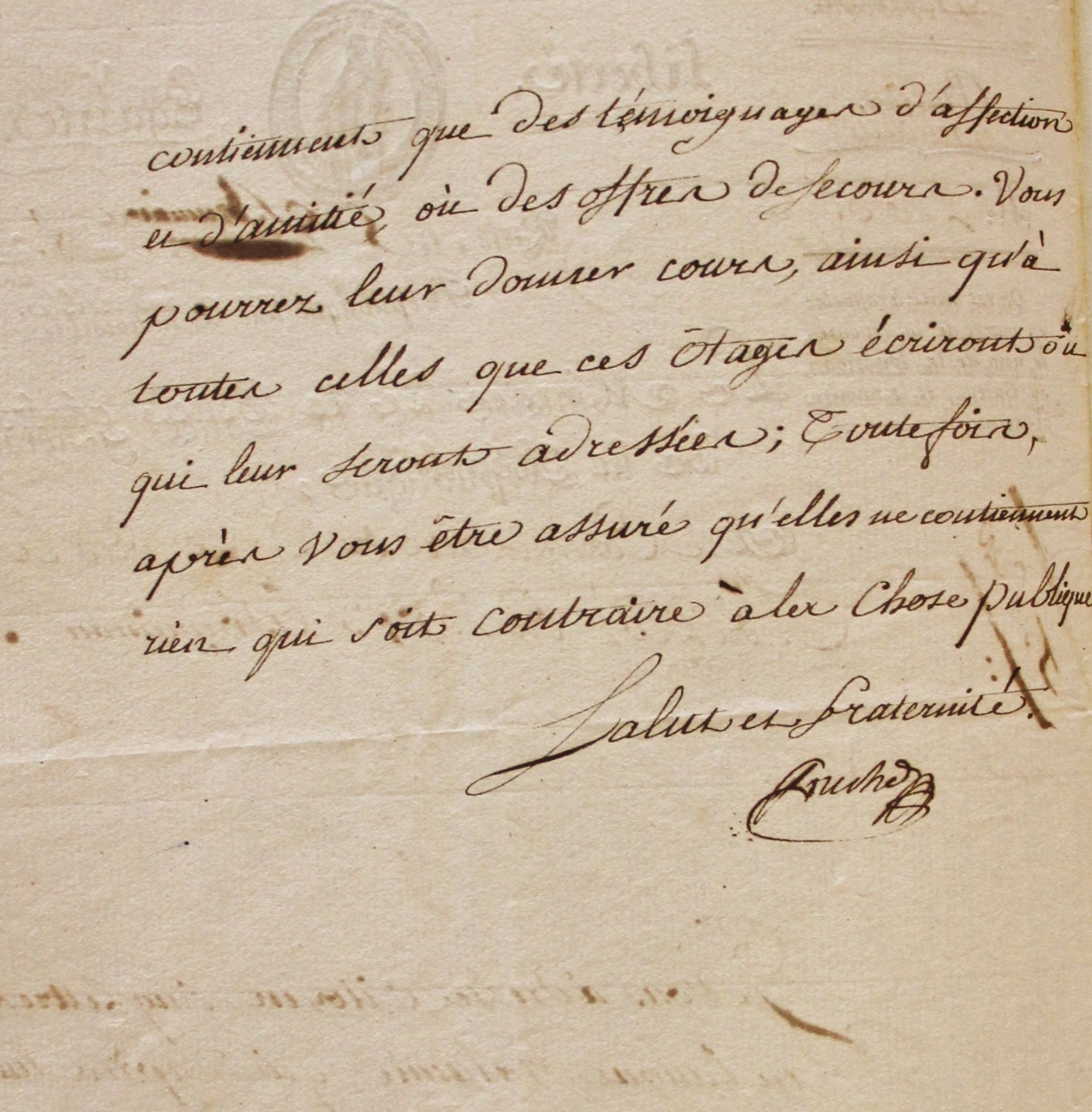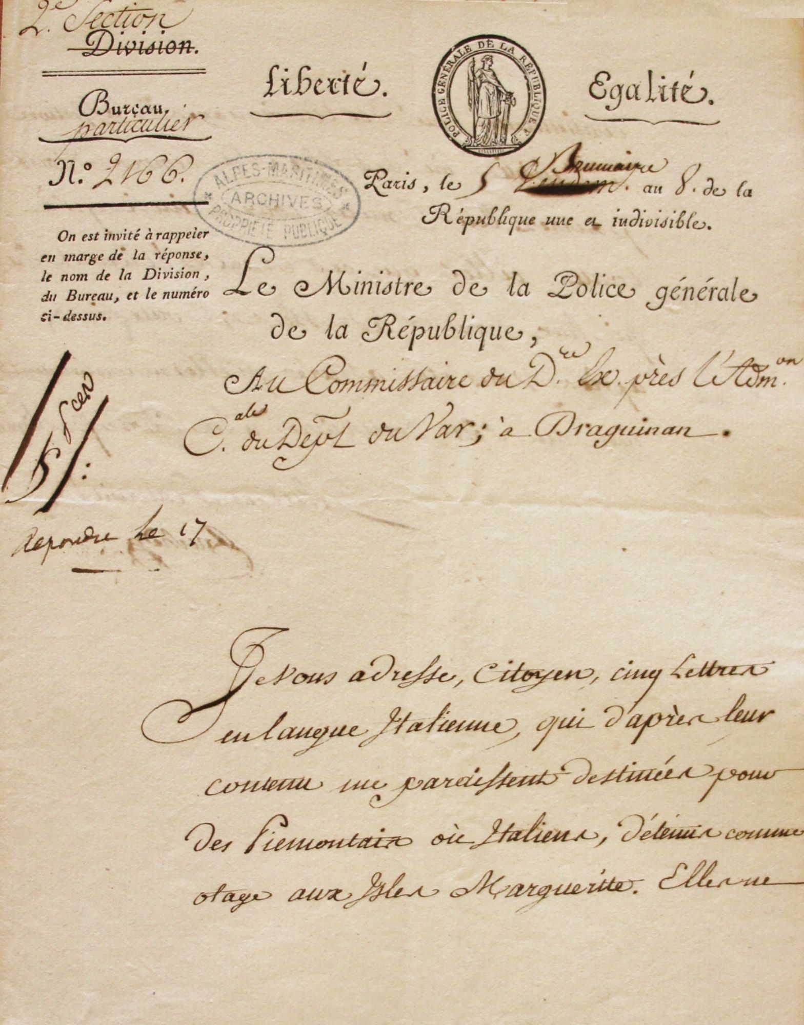 Lettre aux Piémontais détenus aux îles Sainte-Marguerite, datée du 5 brumaire an VIII soit le 27 octobre 1799.