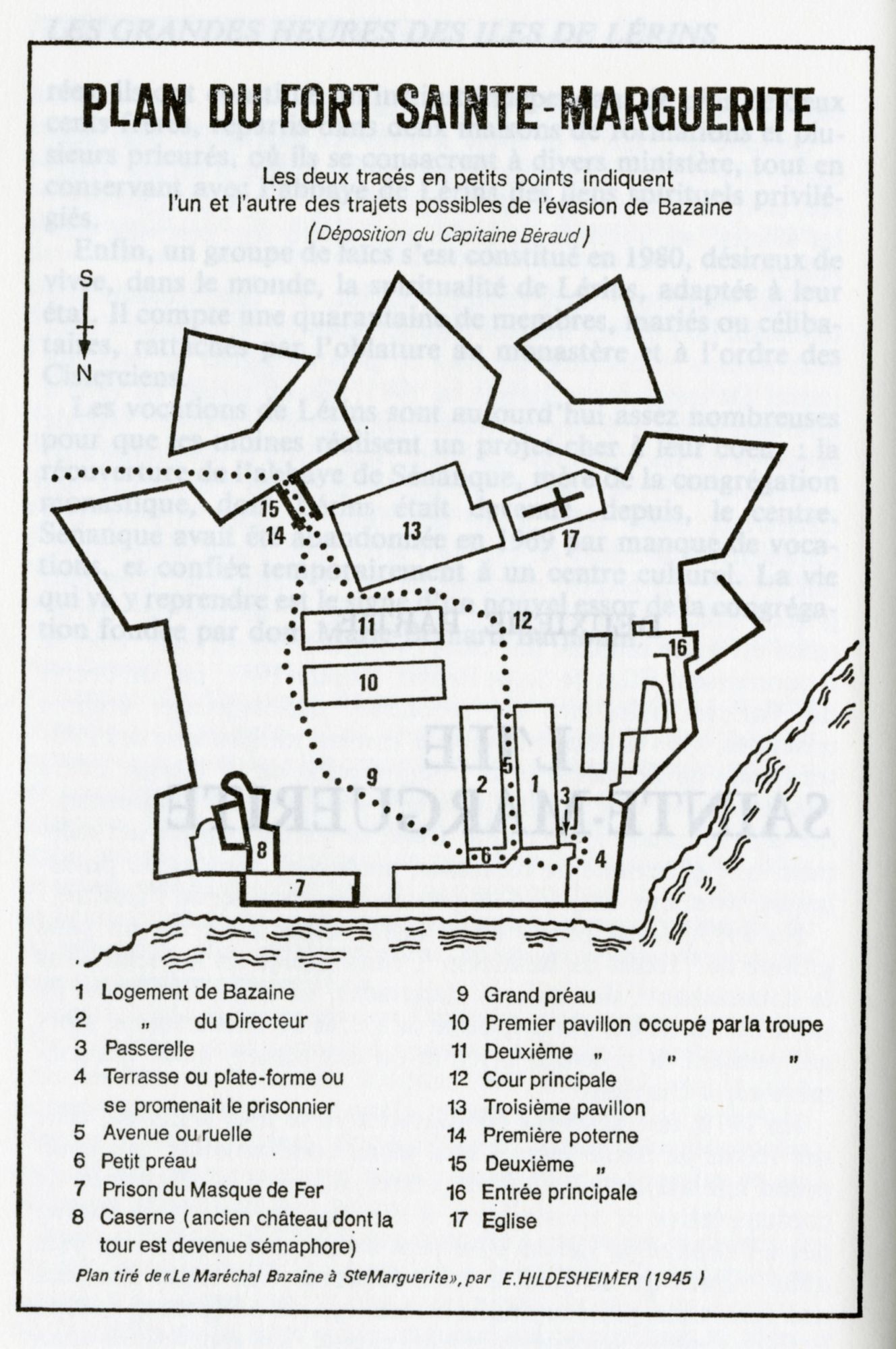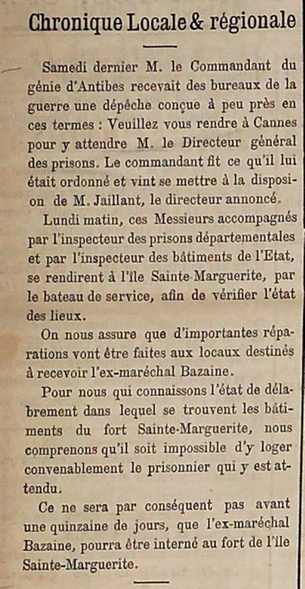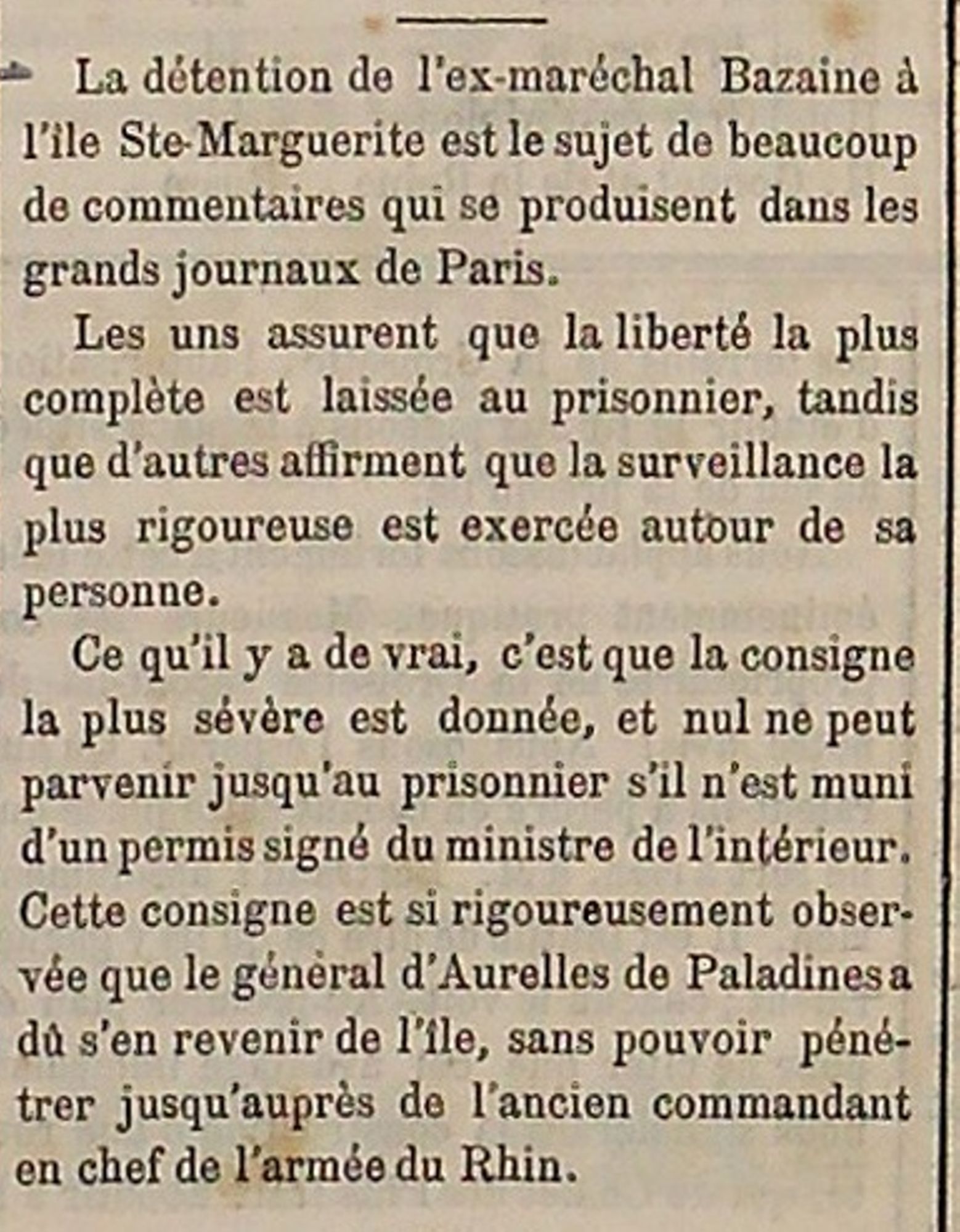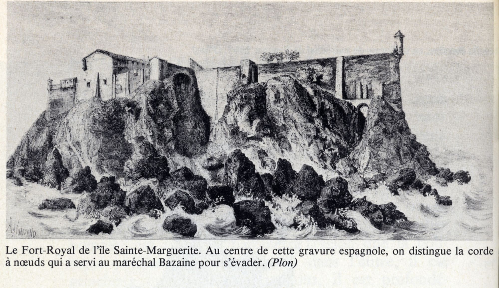Le Maréchal François Achille Bazaine passé en conseil de guerre après la capitulation de Metz fut enfermé au fort de l'île Sainte-Marguerite et s'en évada d'une façon telle qu'elle est restée dans les Annales de l'histoire.