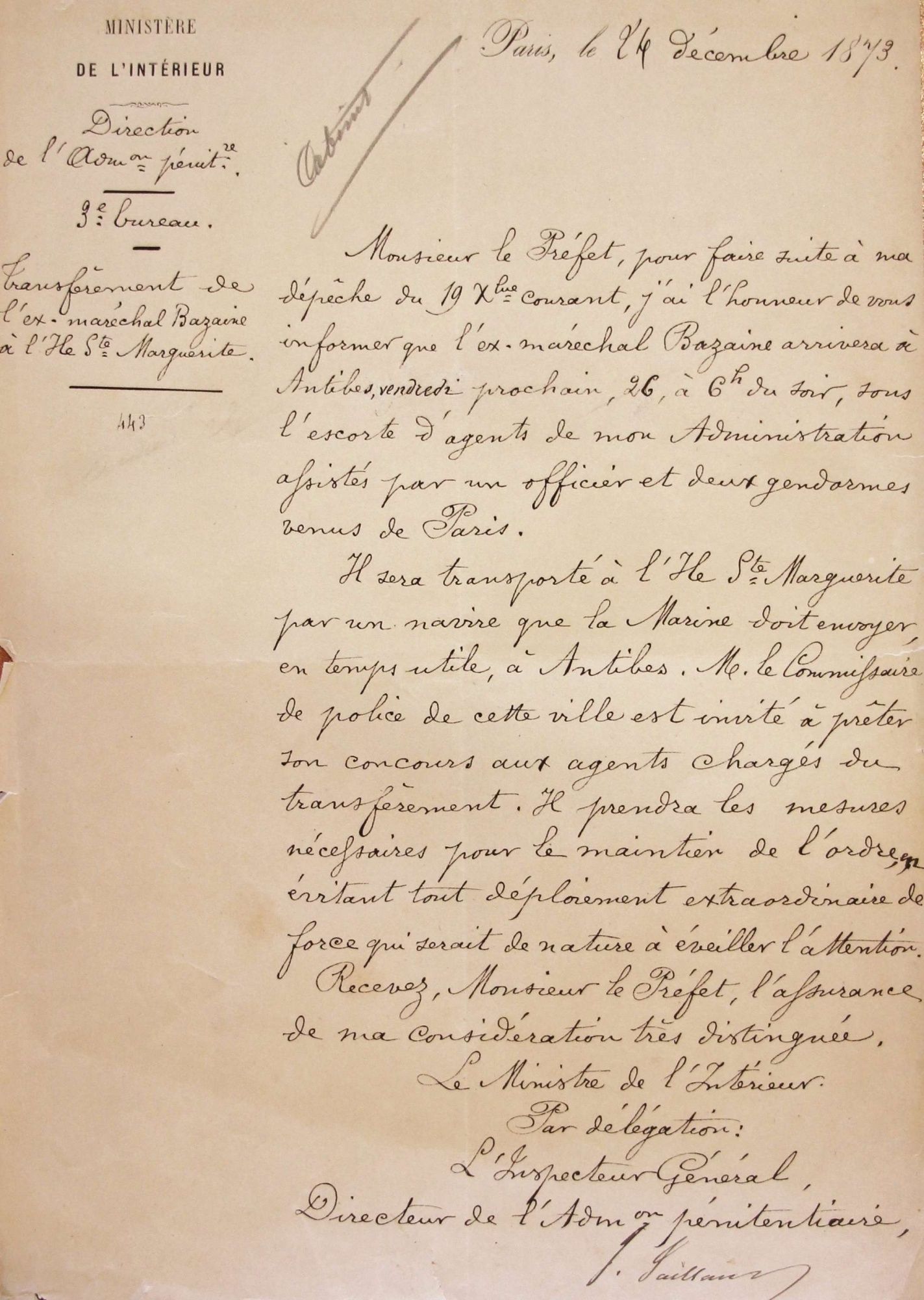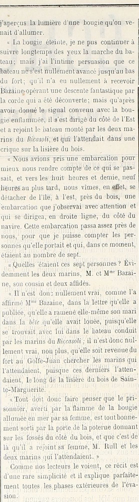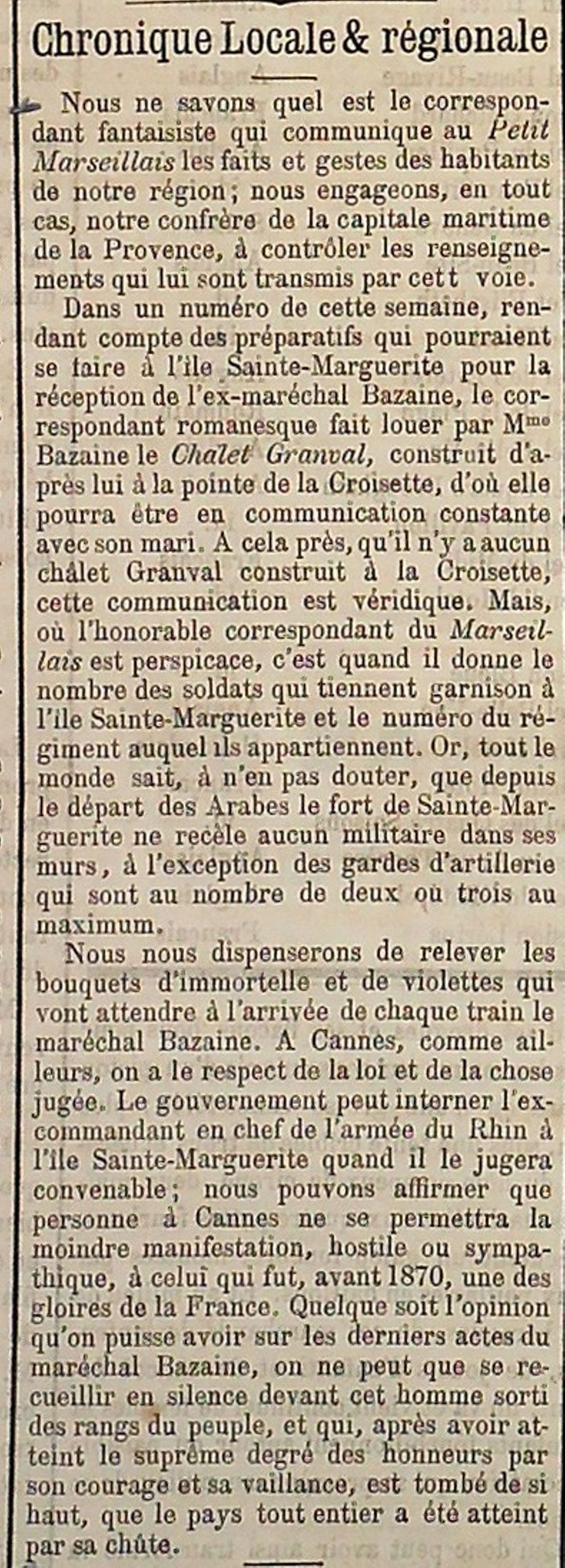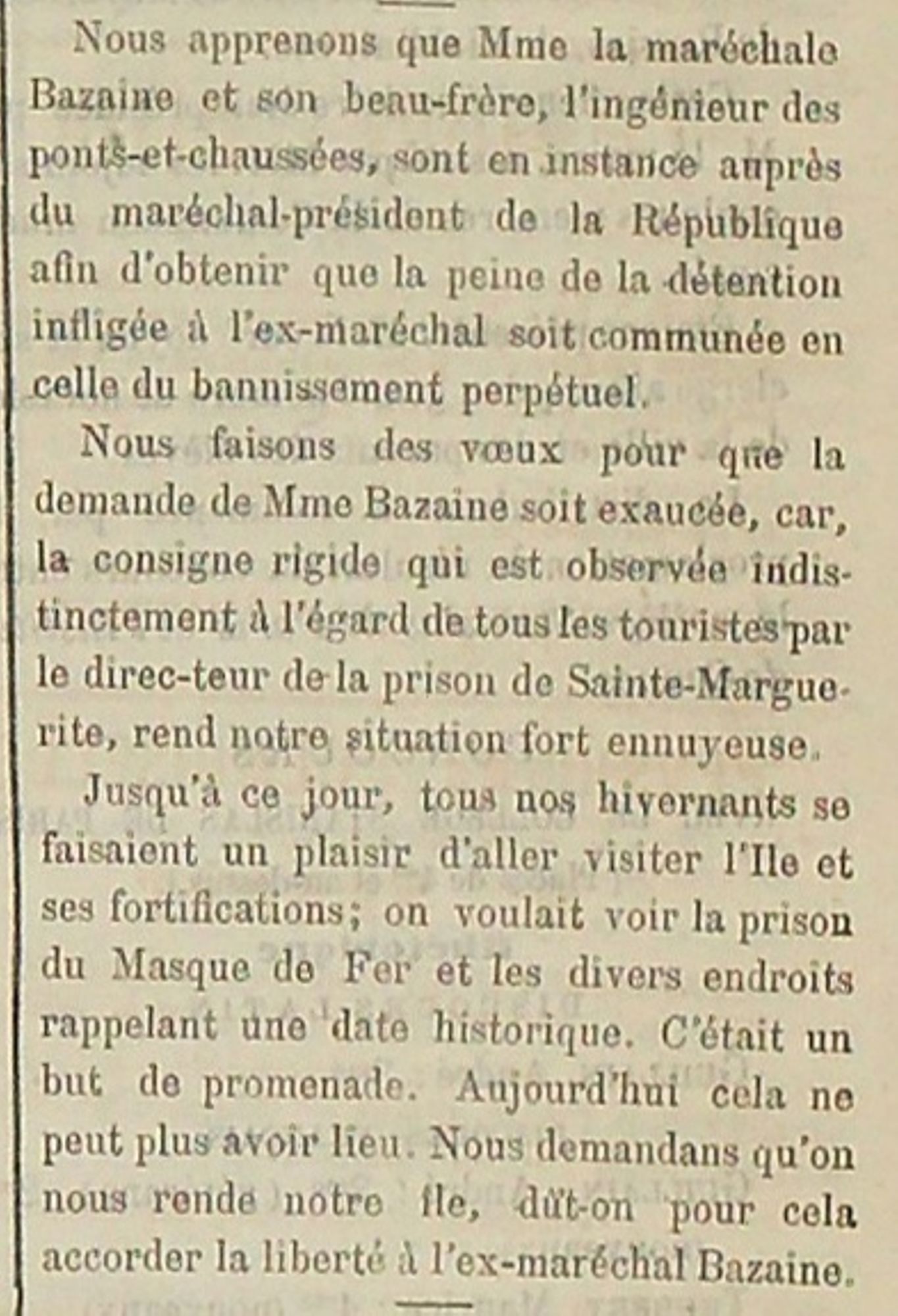 Le Maréchal François Achille Bazaine passé en conseil de guerre après la capitulation de Metz fut enfermé au fort de l'île Sainte-Marguerite et s'en évada d'une façon telle qu'elle est restée dans les Annales de l'histoire.